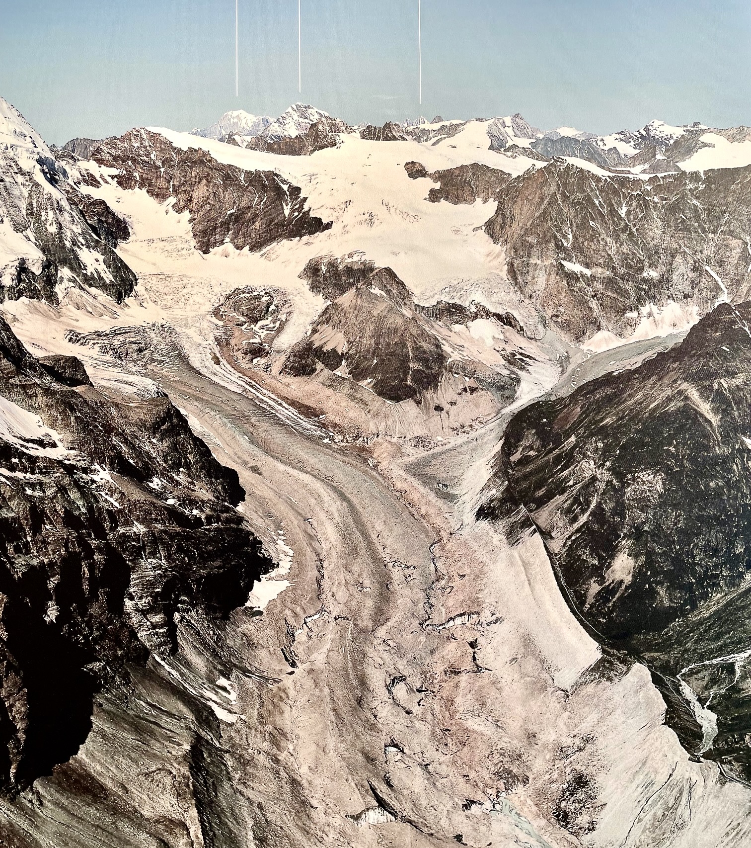 Our only option was to climb back up the glacier and try to get over The Stockje—a large landform that sits between the Stockje and Zmutt Glaciers. Geologically, The Stockje (or Stockji, on some maps) is a roche moutonee, which translates from French as “sheep rock.” The term stockje appears to be German for “small stock animal,” probably as a reference to the French term. The aerial photo below shows The Stockje and adjacent glaciers.