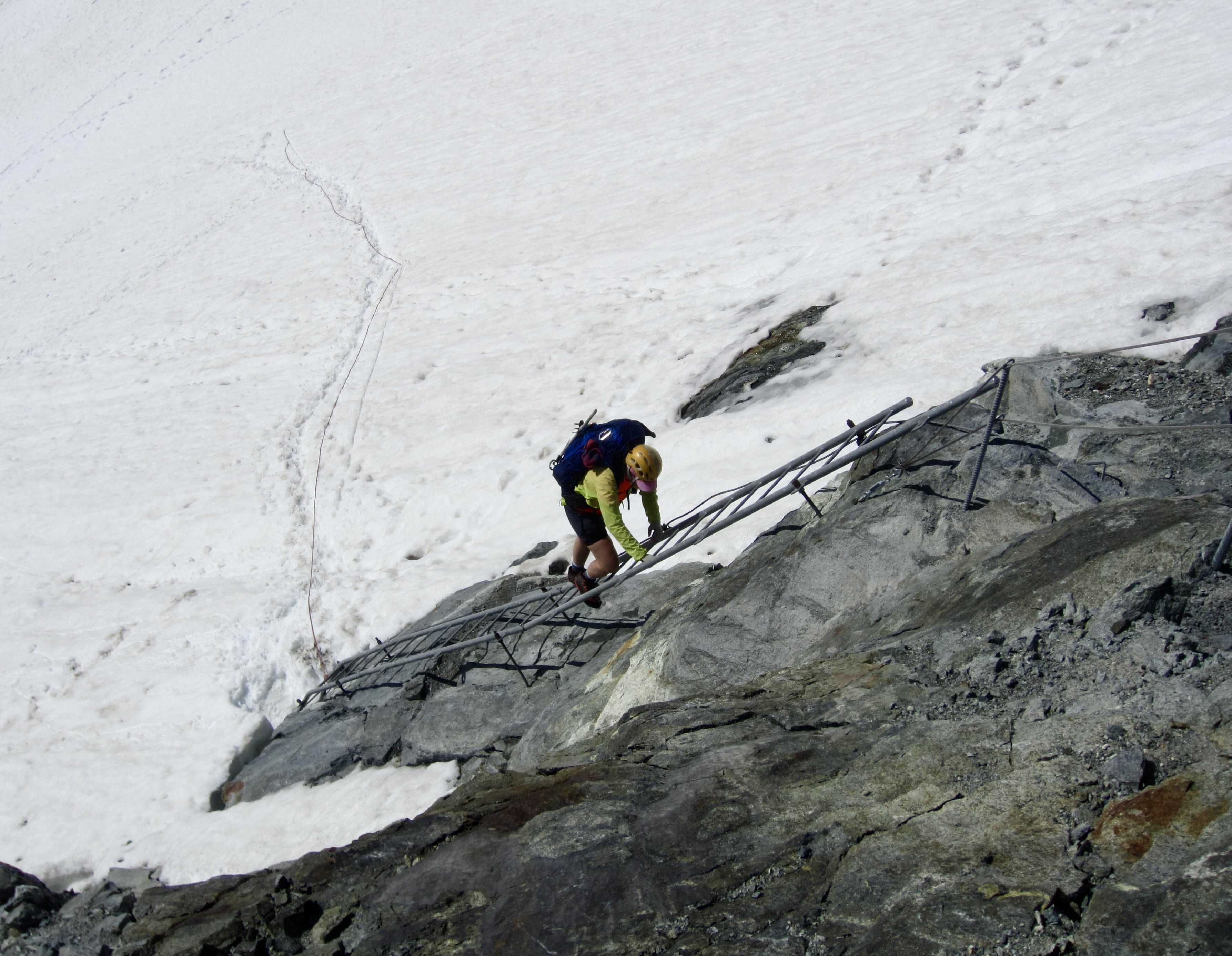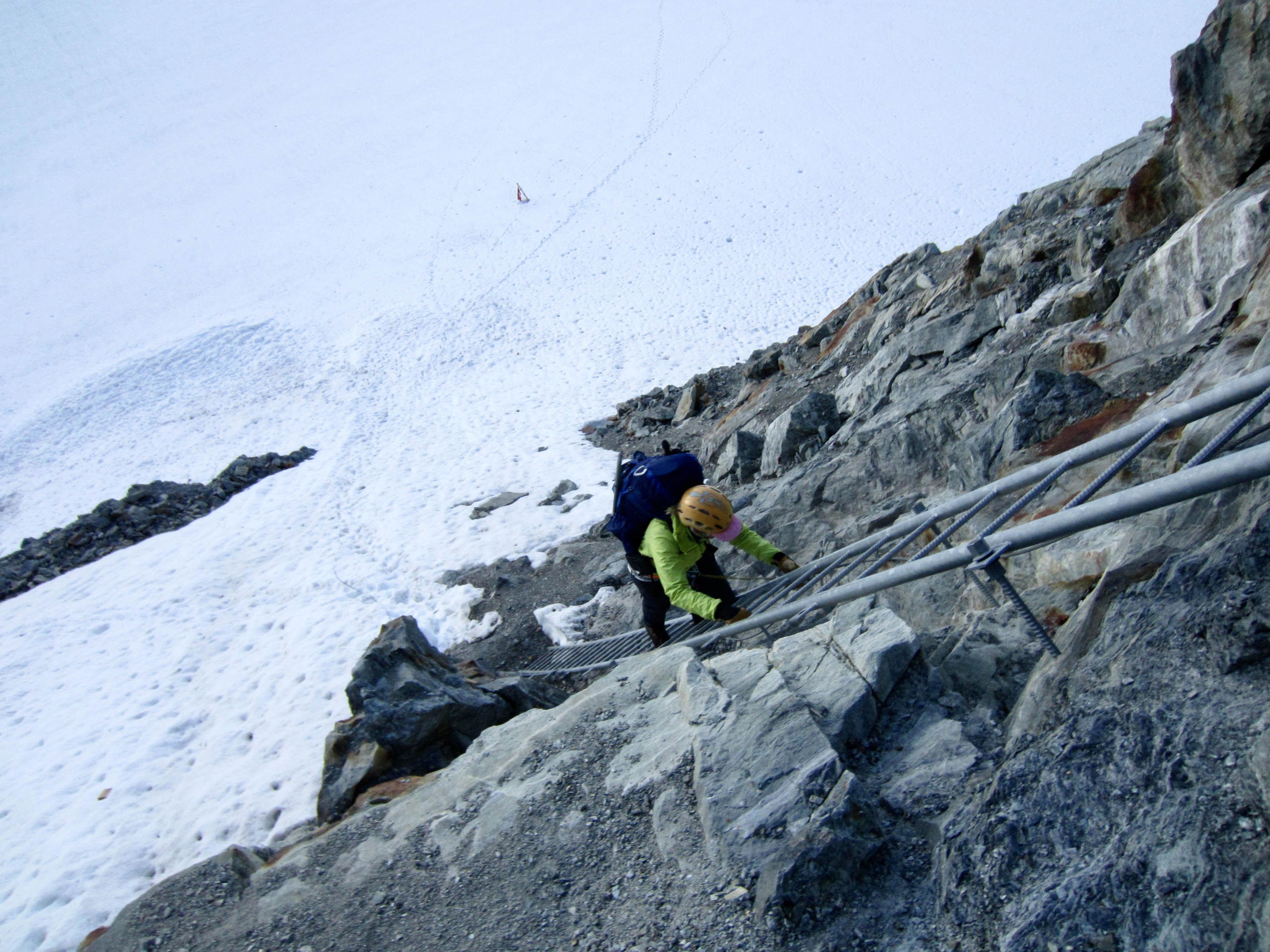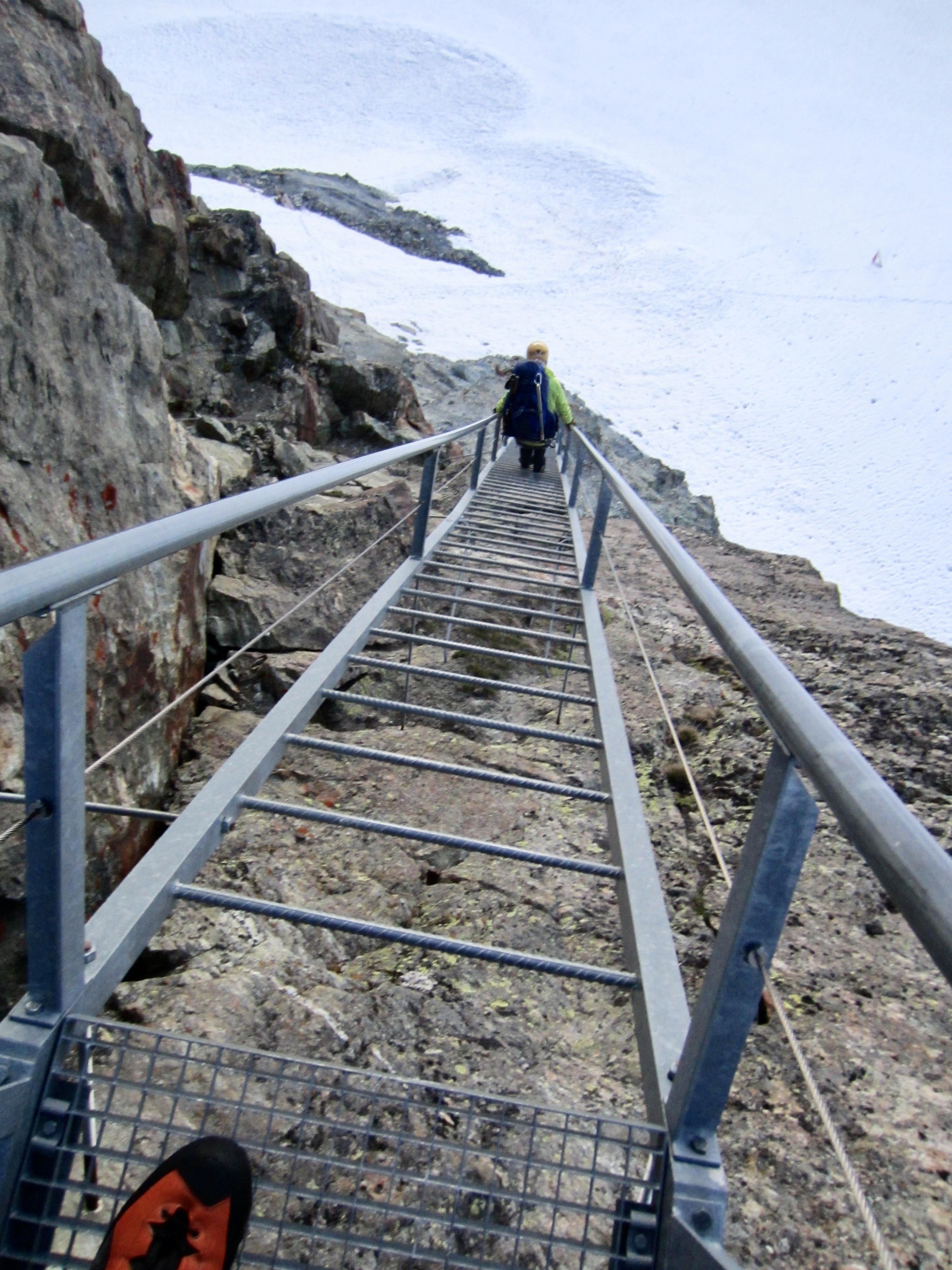Today was expected to be a tough one; the total closure of Schonbiel Hut forced us to combine the traditional last two days of the Haute Route into one long day. Our morning started with a descent of a stairway and ladder on the eastern side of the hut, followed by a down-climb of a steep snowfield.