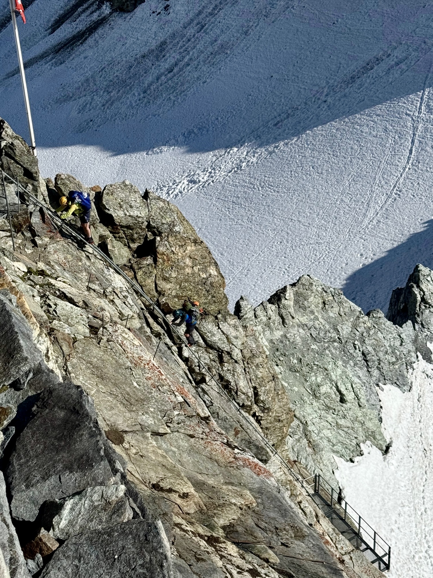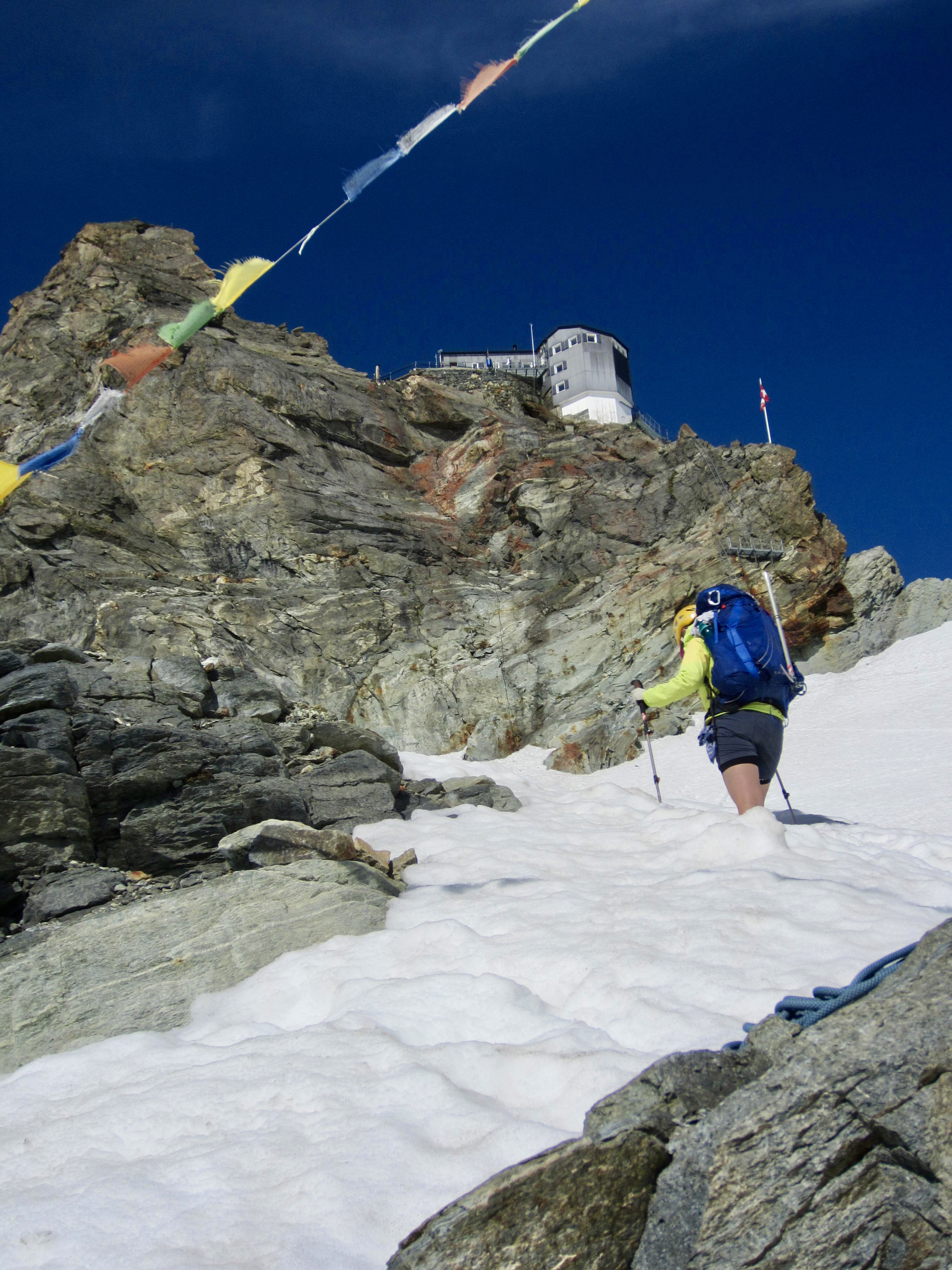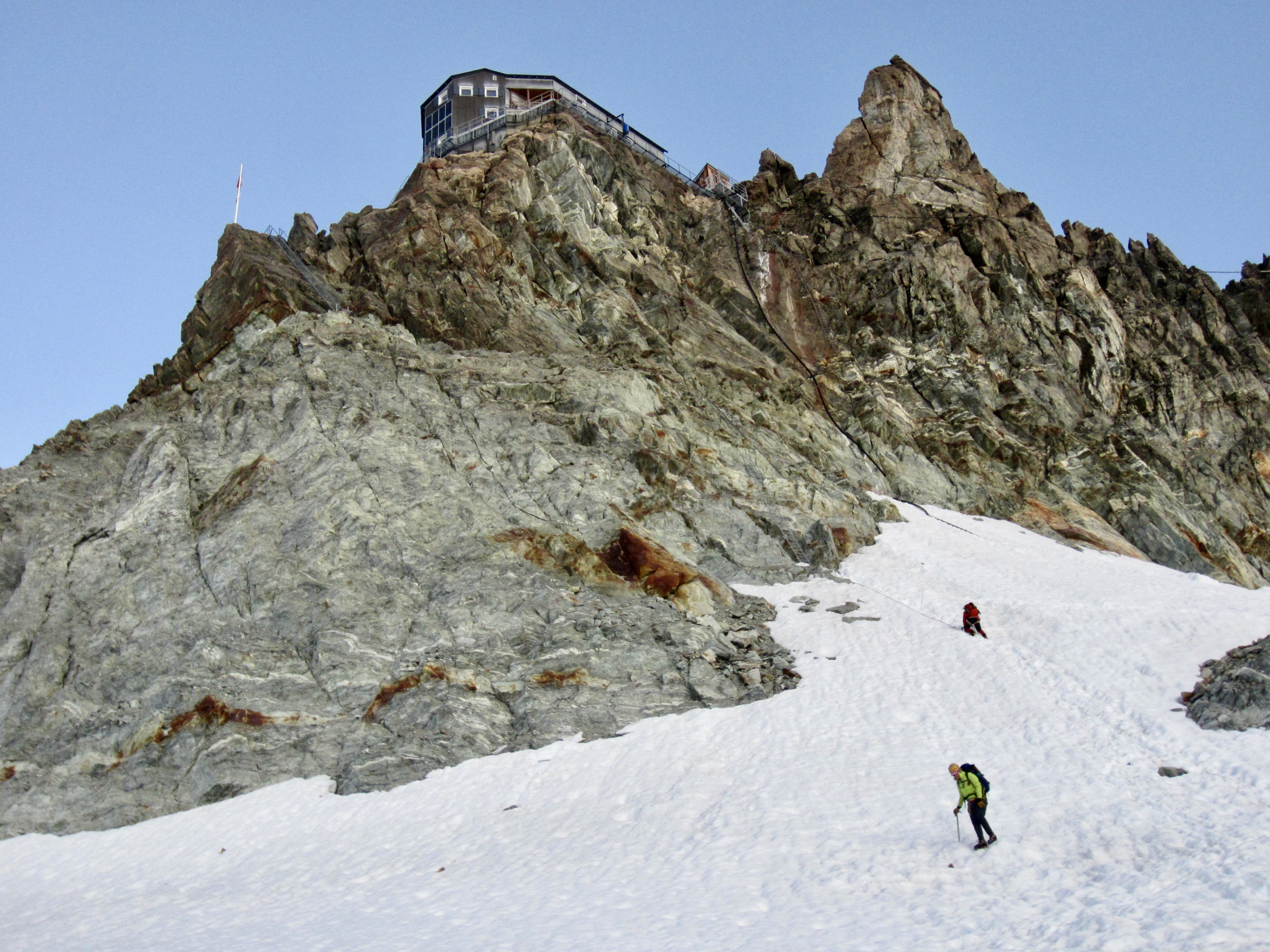 Today was expected to be a tough one; the total closure of Schonbiel Hut forced us to combine the traditional last two days of the Haute Route into one long day. Our morning started with a descent of a stairway and ladder on the eastern side of the hut, followed by a down-climb of a steep snowfield.