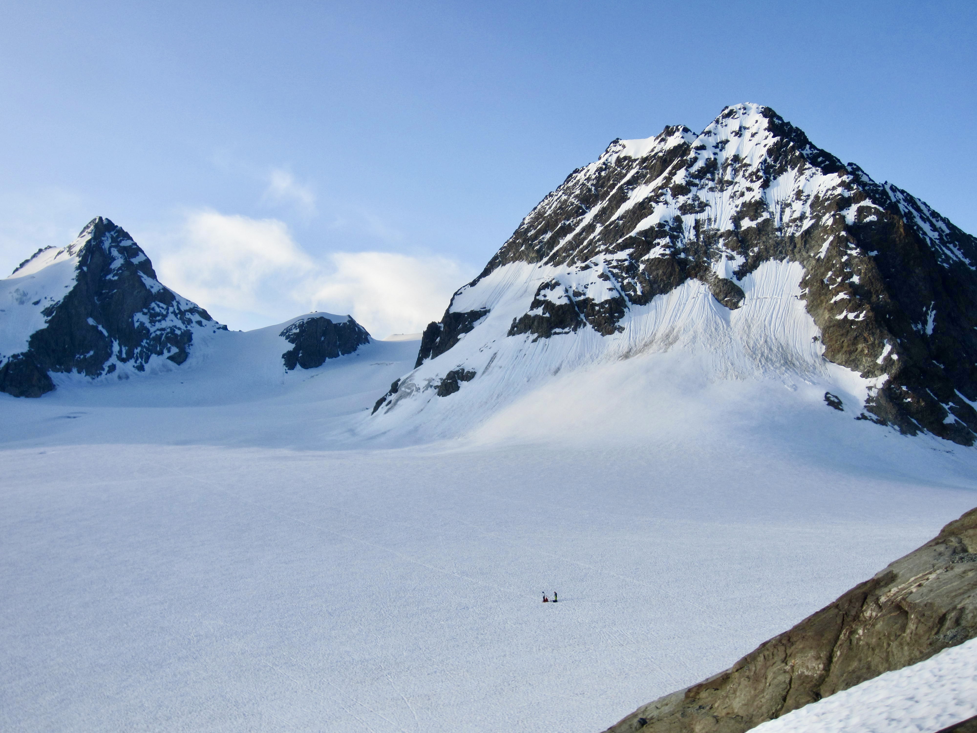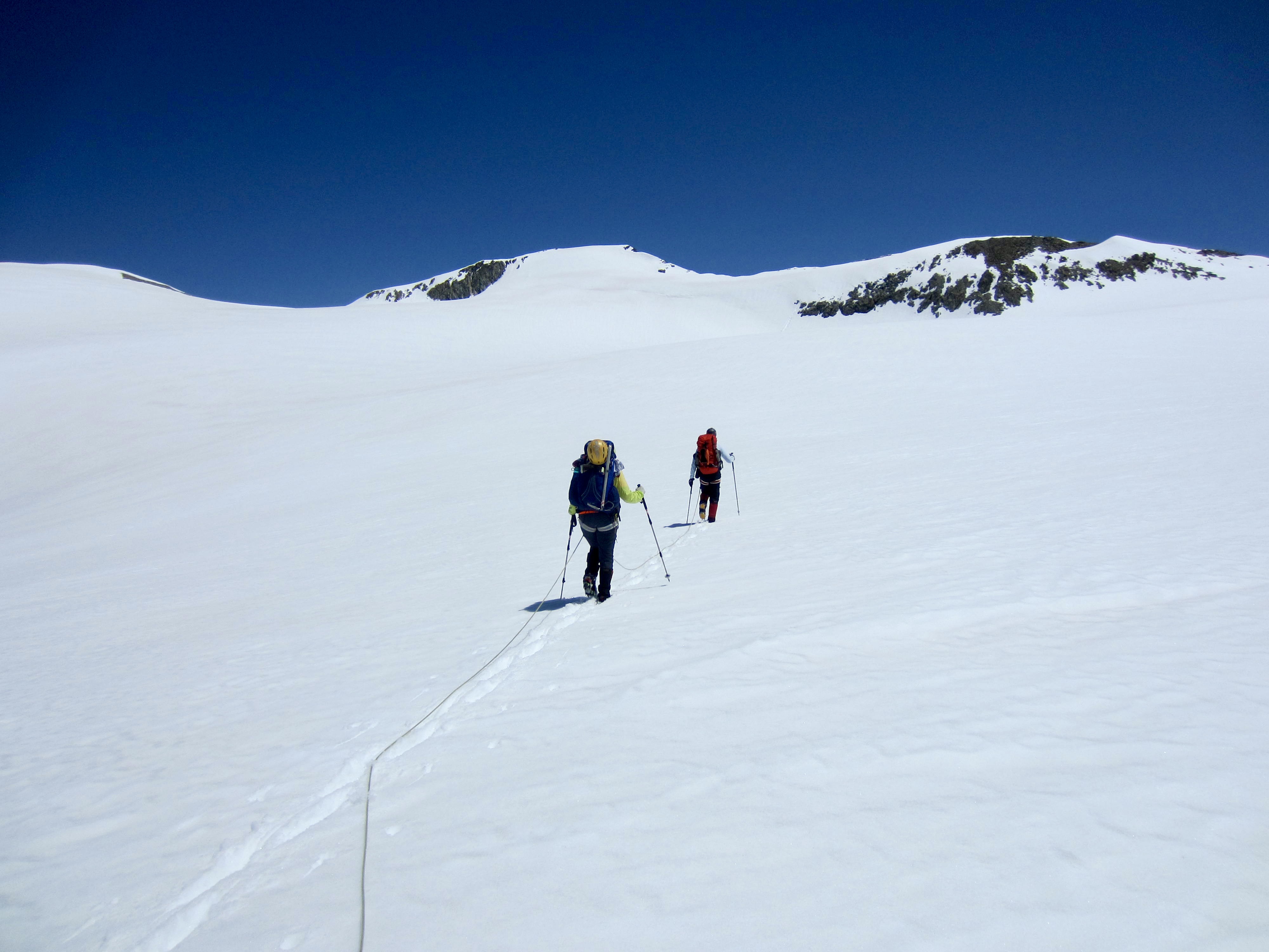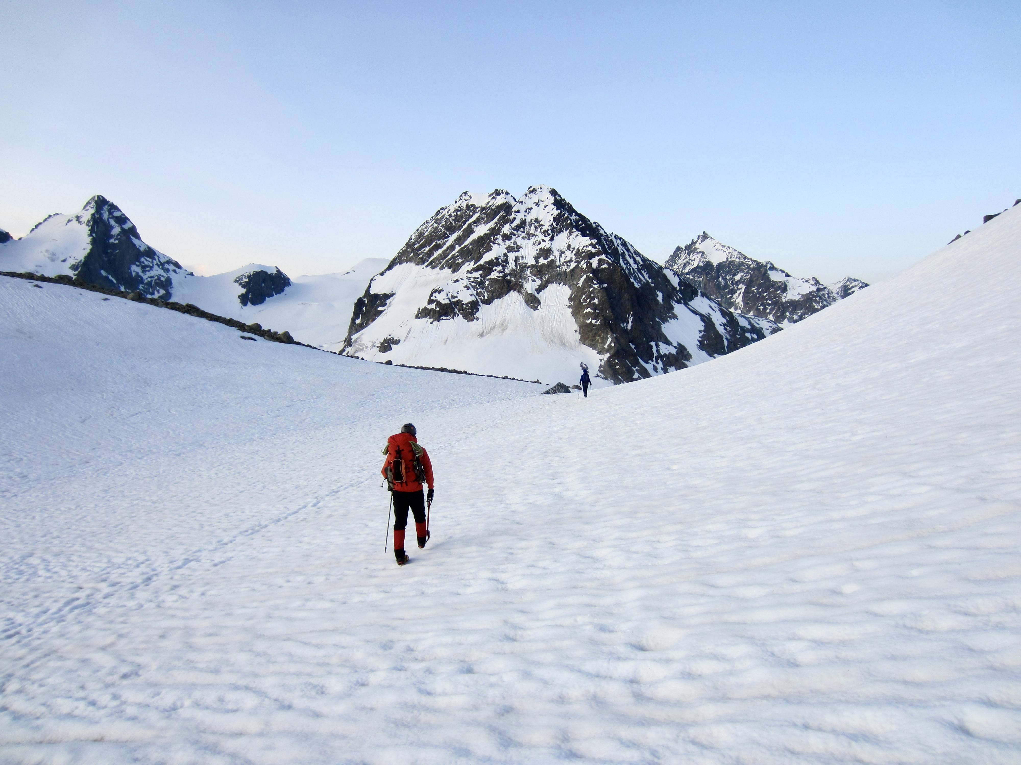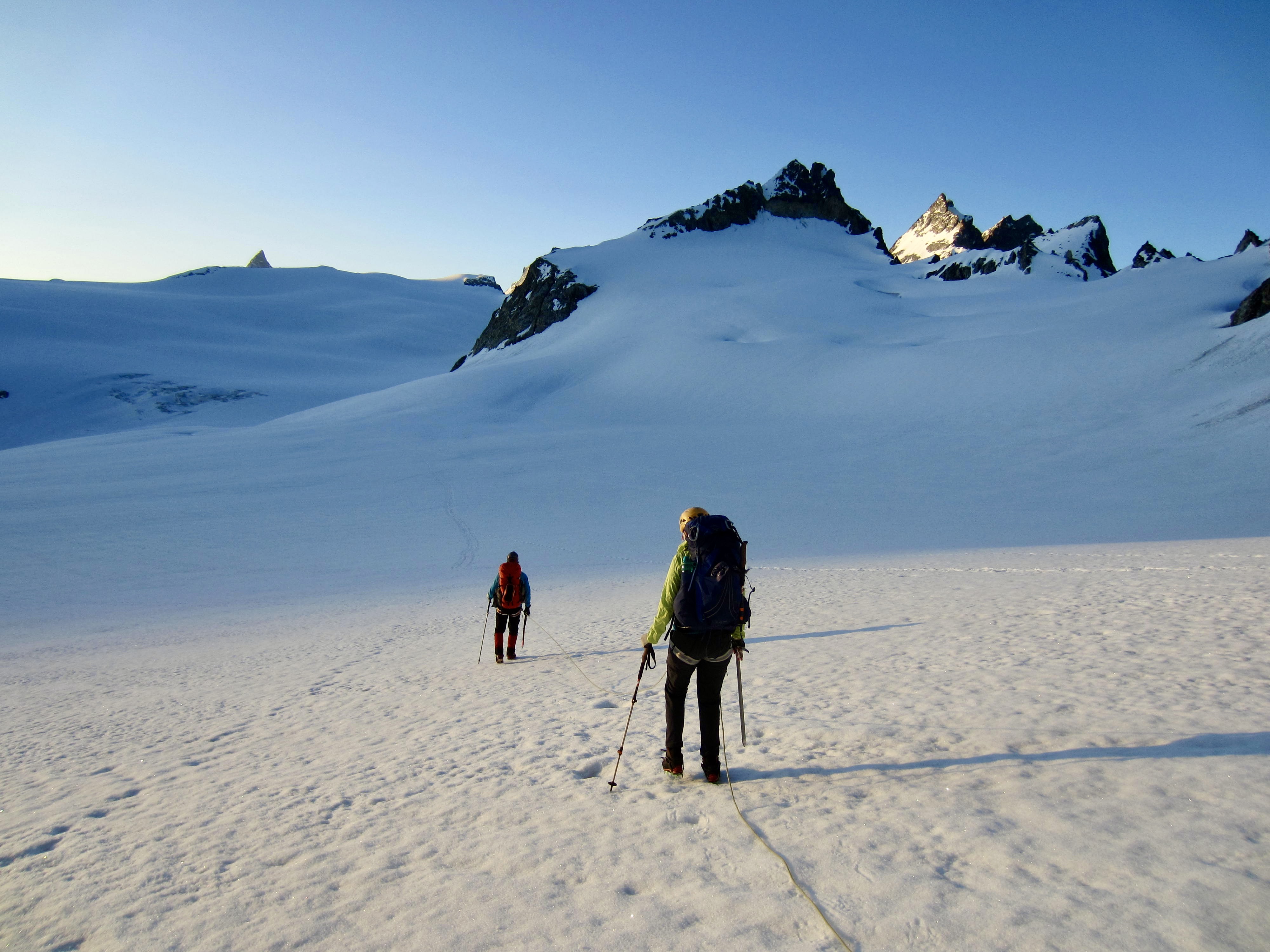 We roped up and made a long easterly traverse across the expansive Mont Mine Glacier. As we crunched over the frozen snow, sunrise gradually highlighted the surrounding peaks.