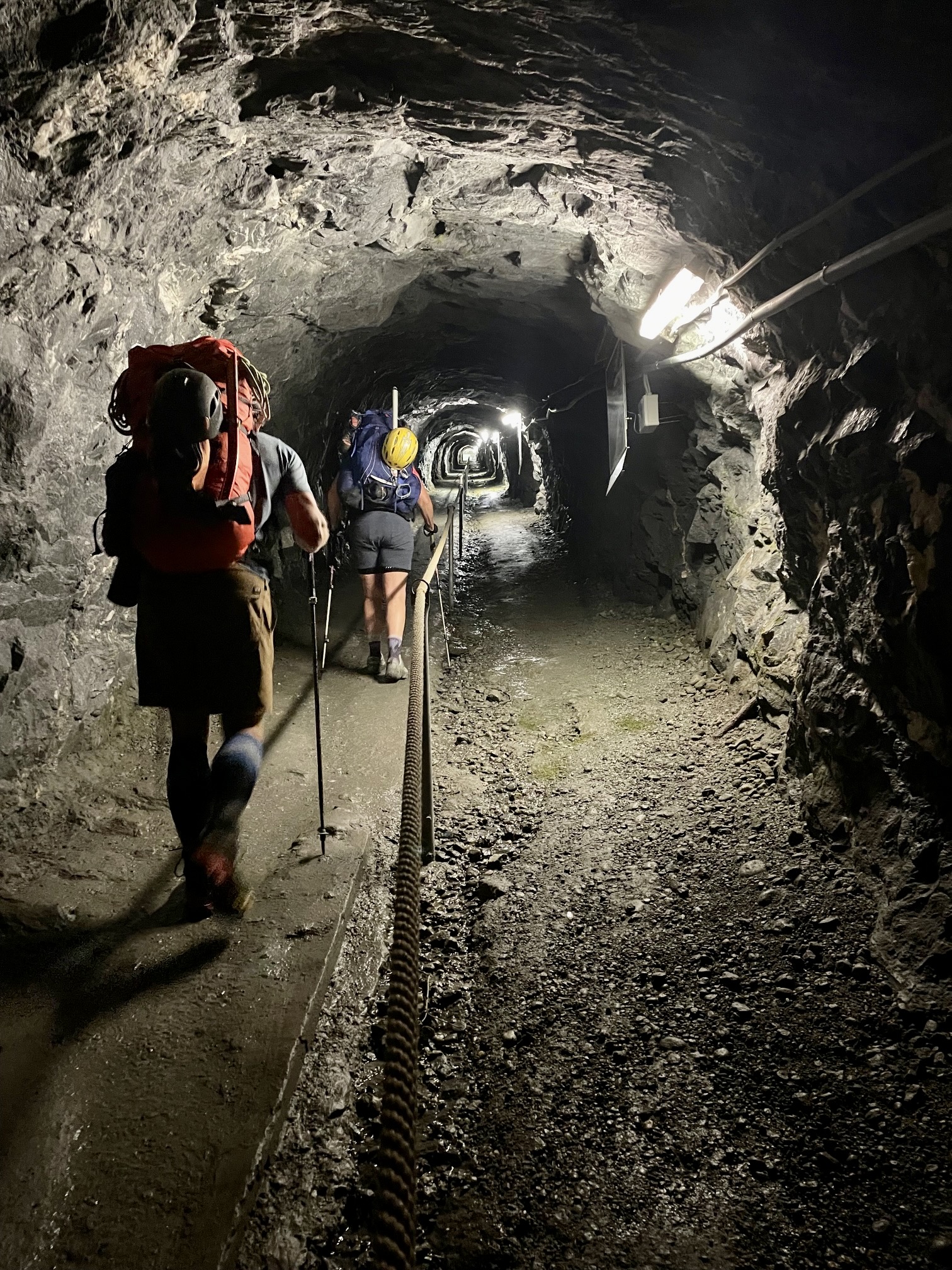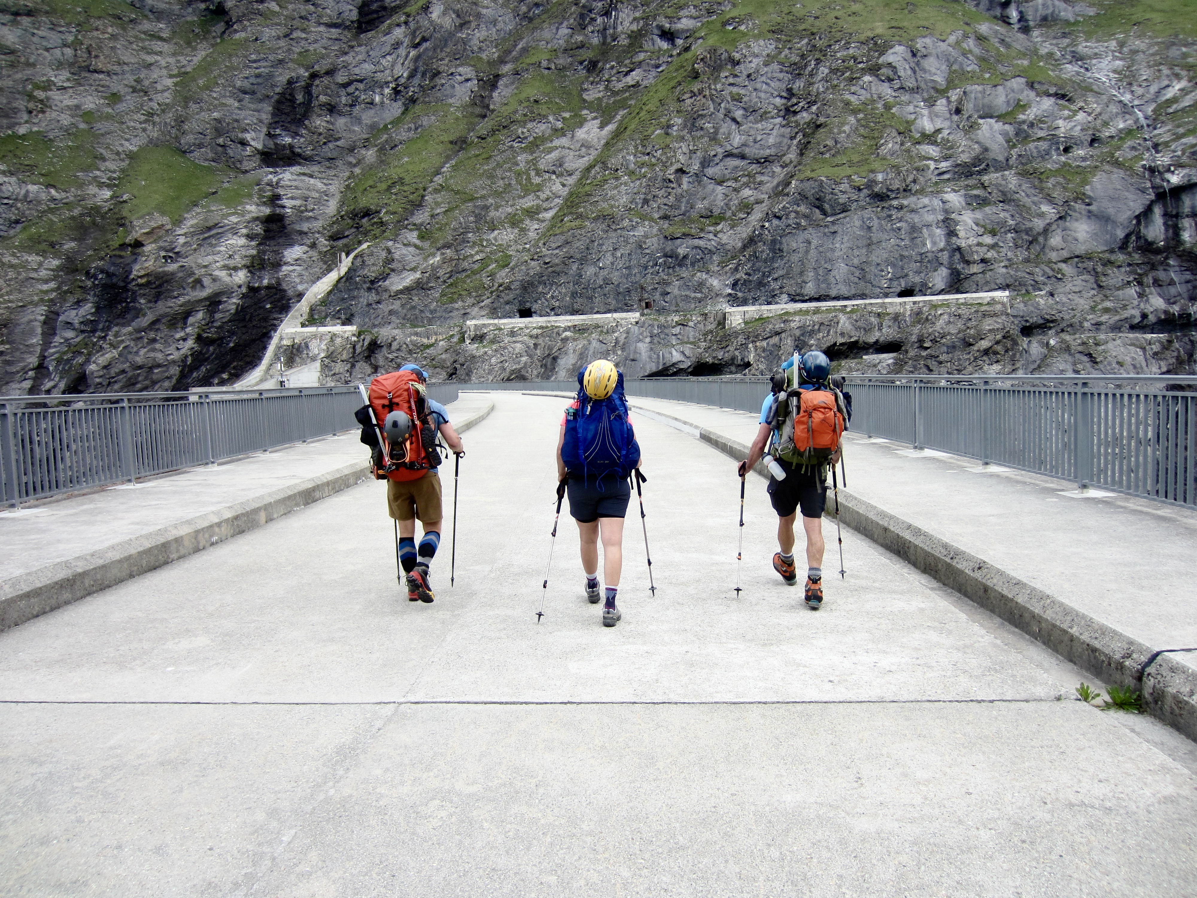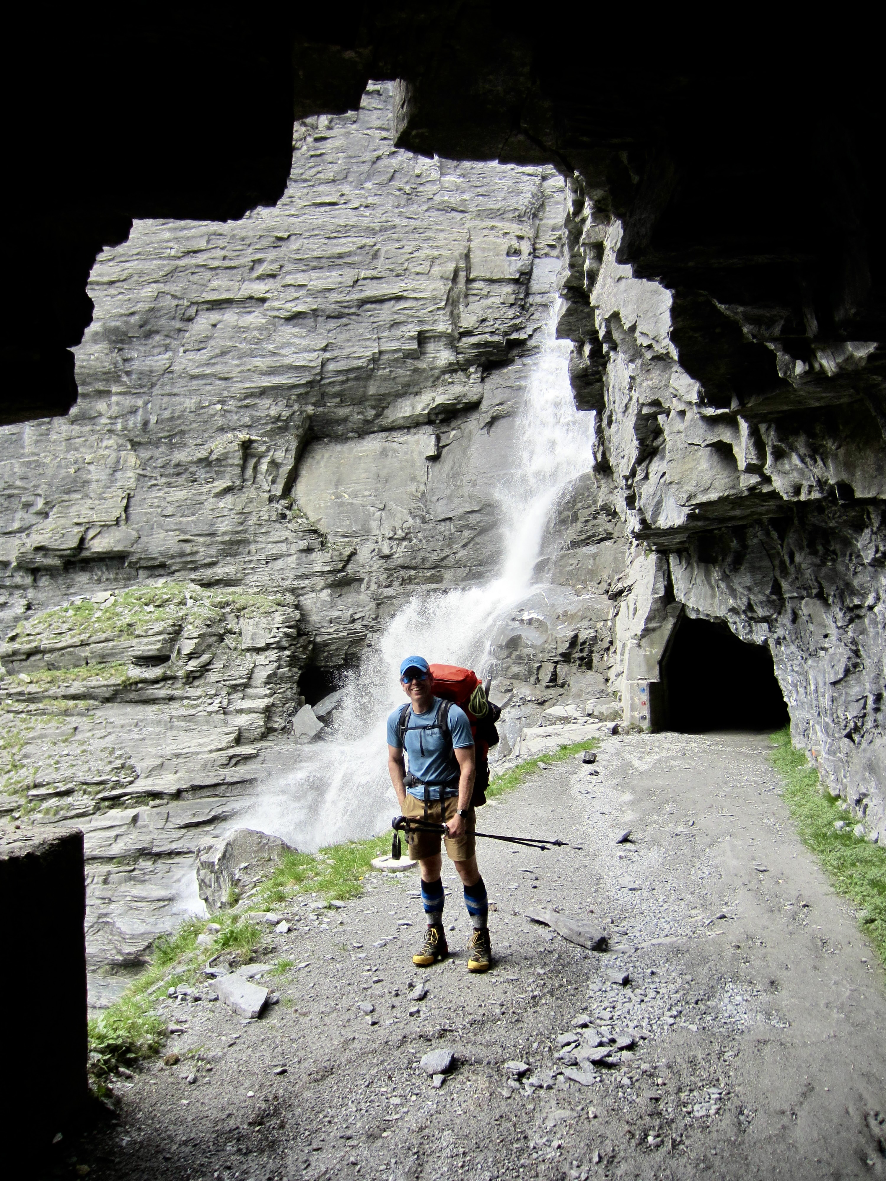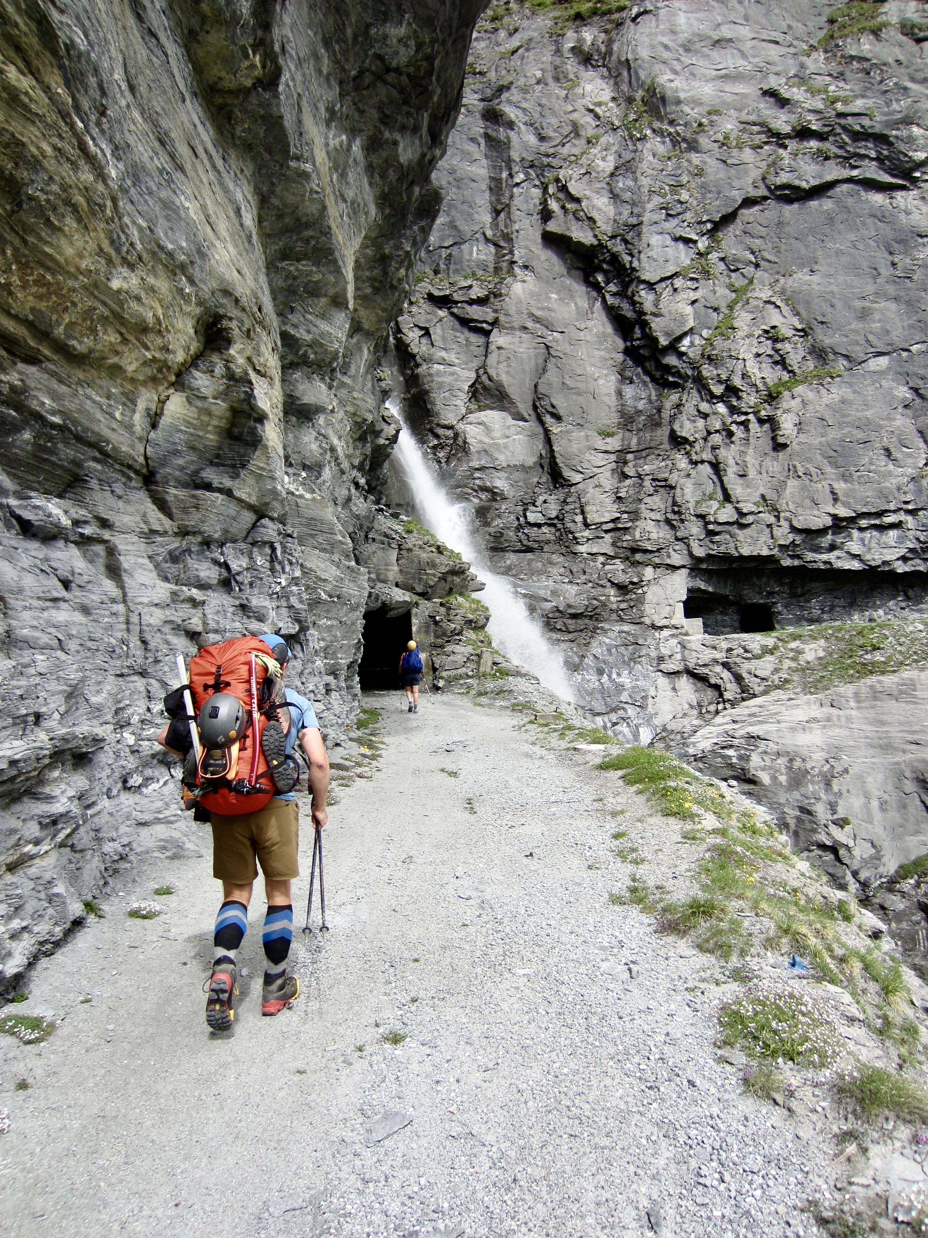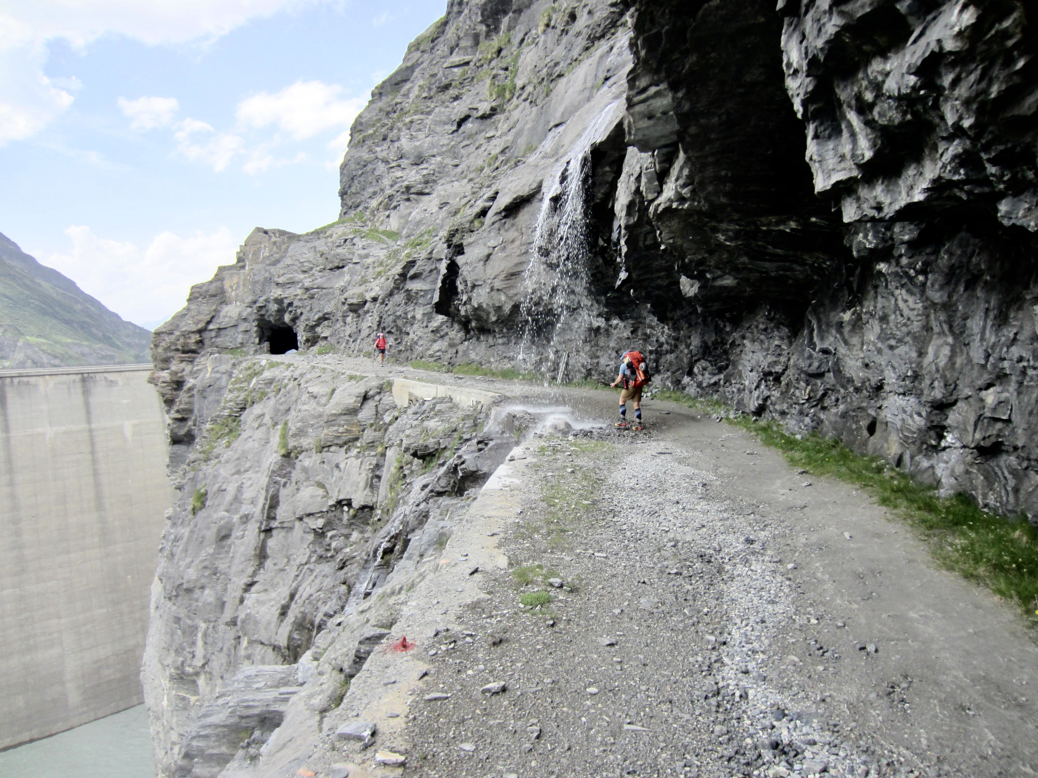 The past couple hours spent wandering through tunnels, up a dark stairway, and across a major dam had been a truly bizarre and unique experience, but our adventure was not over yet. The Haute Route took us along a narrow road carved into a steep cliff high above Mauvoisin Lake—with no safety barrier of any sort. For another hour, we hiked through short tunnels and past cascading streams.