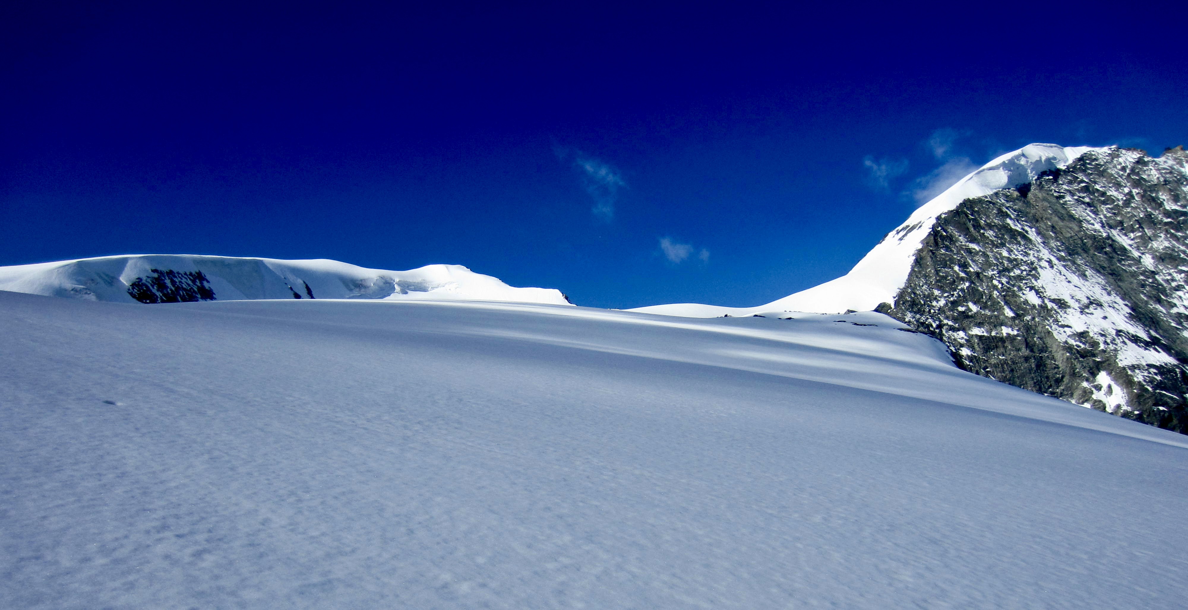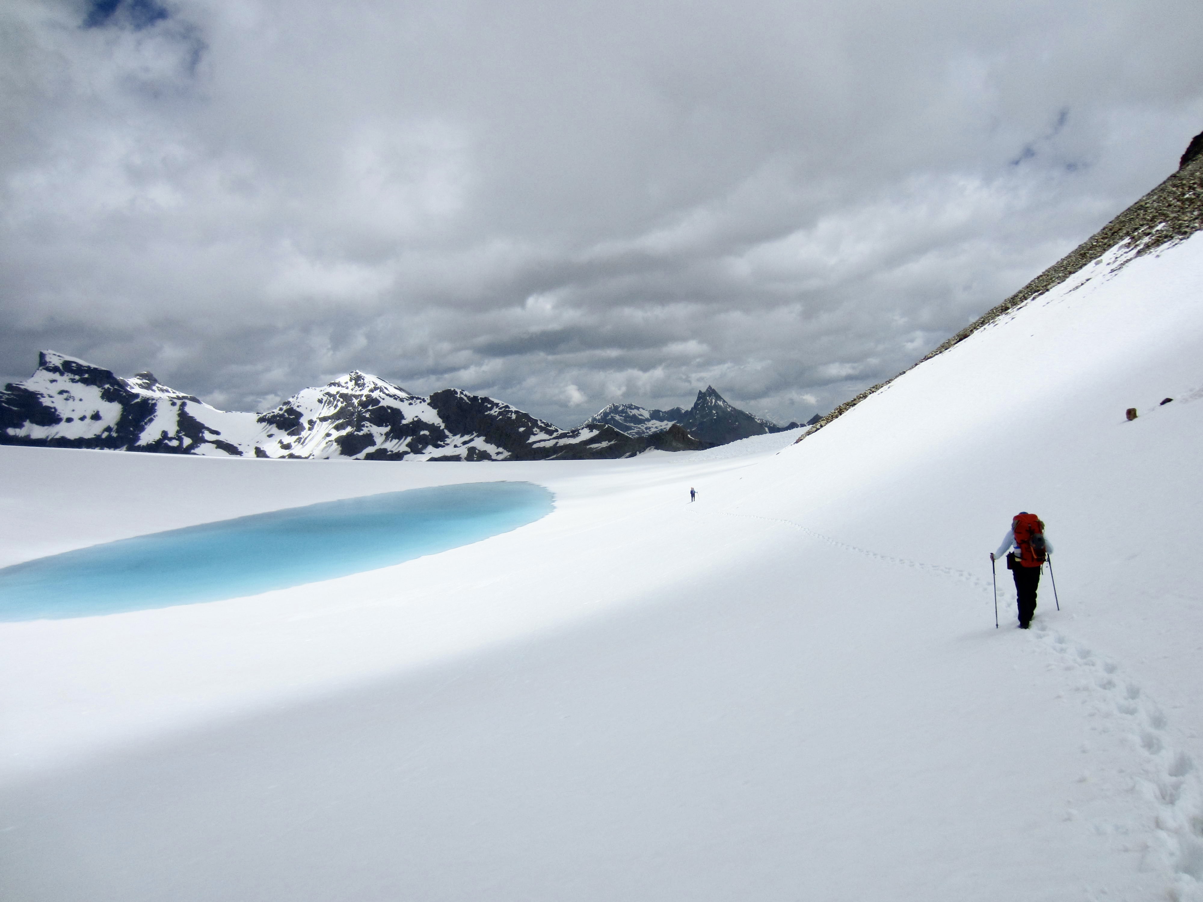 From Mont Rouge Col, we contoured around a turquoise pool sitting on the upper plateau of the Gietroz Glacier. This initially looked to be an easy stroll over to Cheilon Col, but because the previous night’s cloud cover had prevented the snow surface from freezing, it became another post-holing slog.