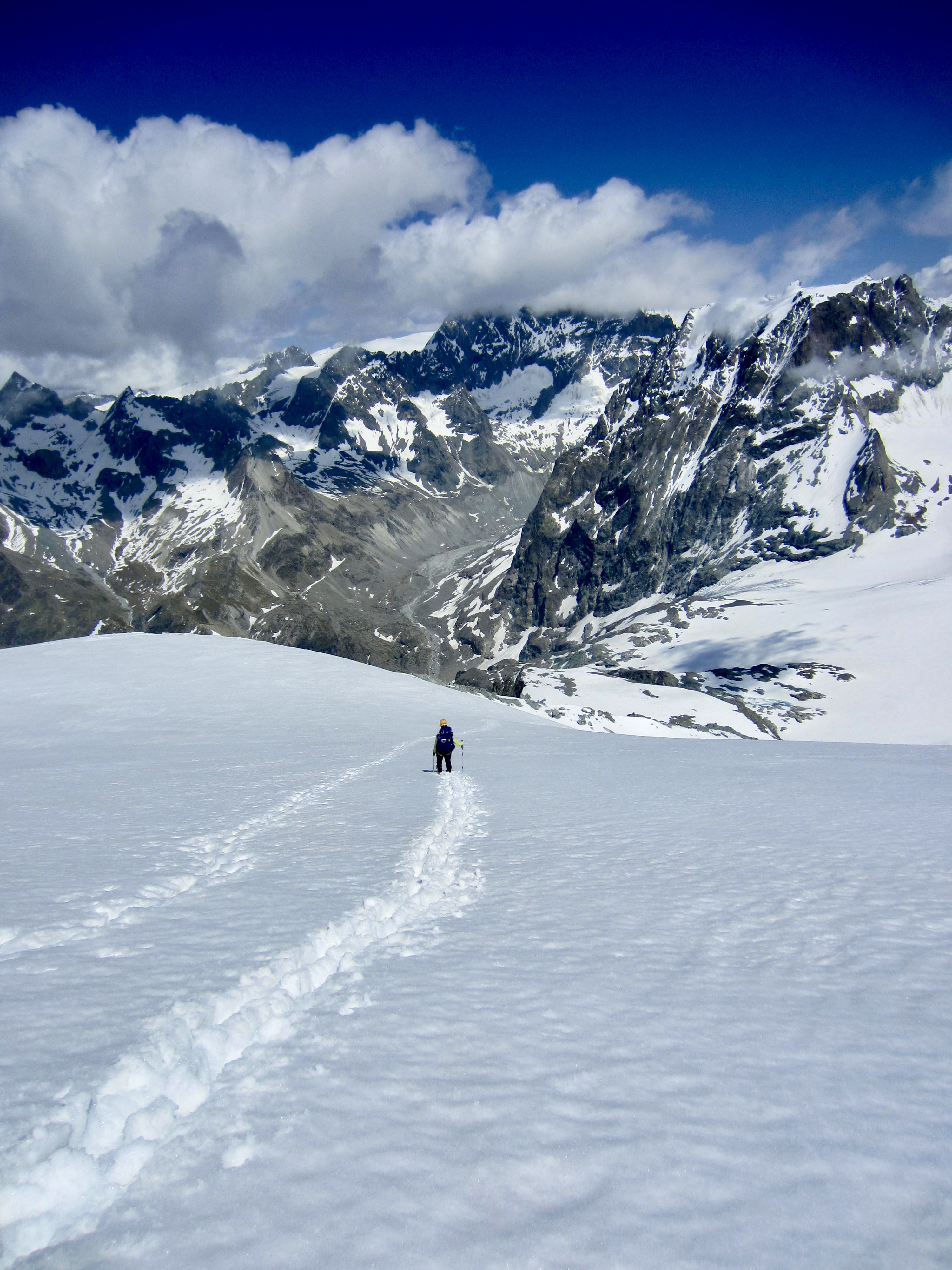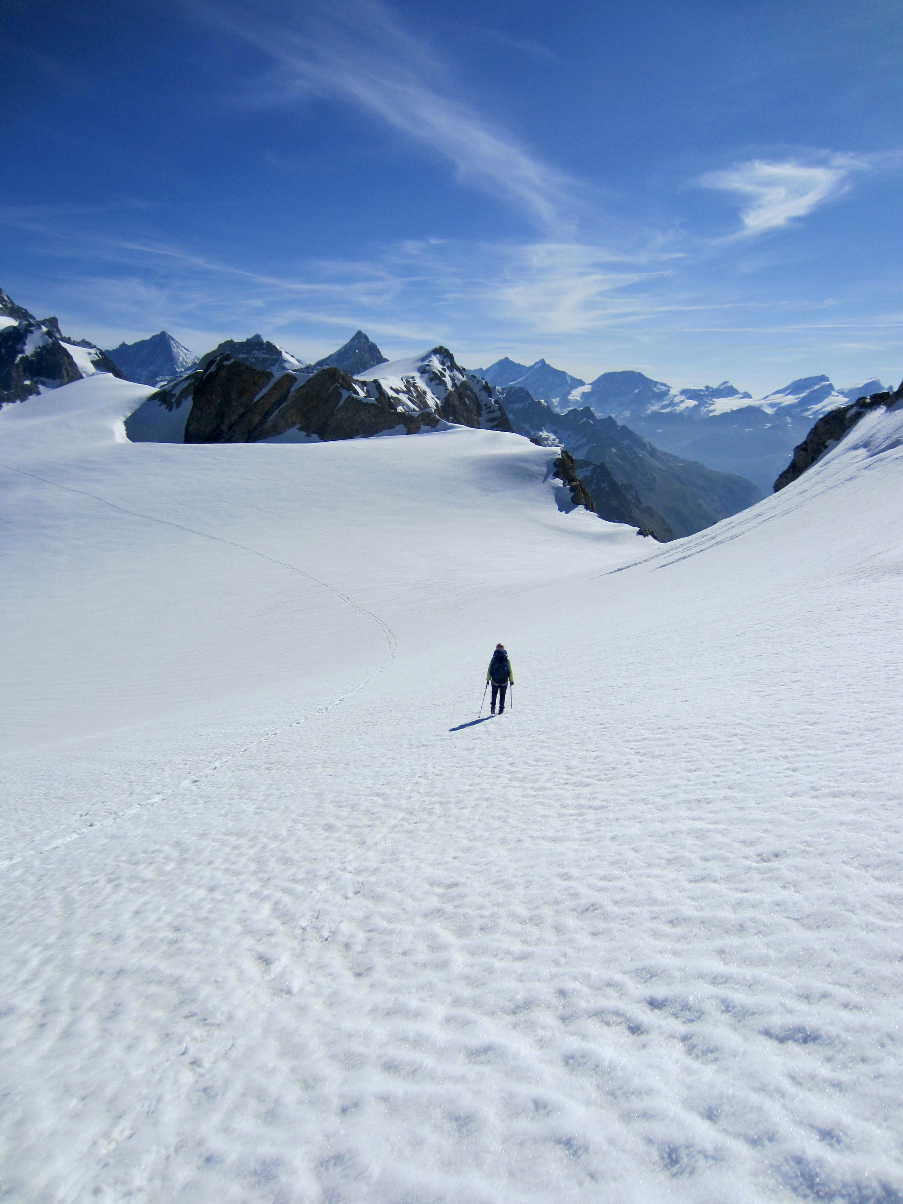 From Arolla Col, we followed a fairly recent boot track down the Upper Piece Glacier. It appeared that these tracks had been made by a party coming up the Lower Piece Glacier to climb Pigne d’Arolla—the “Arolla Pine Cone.”