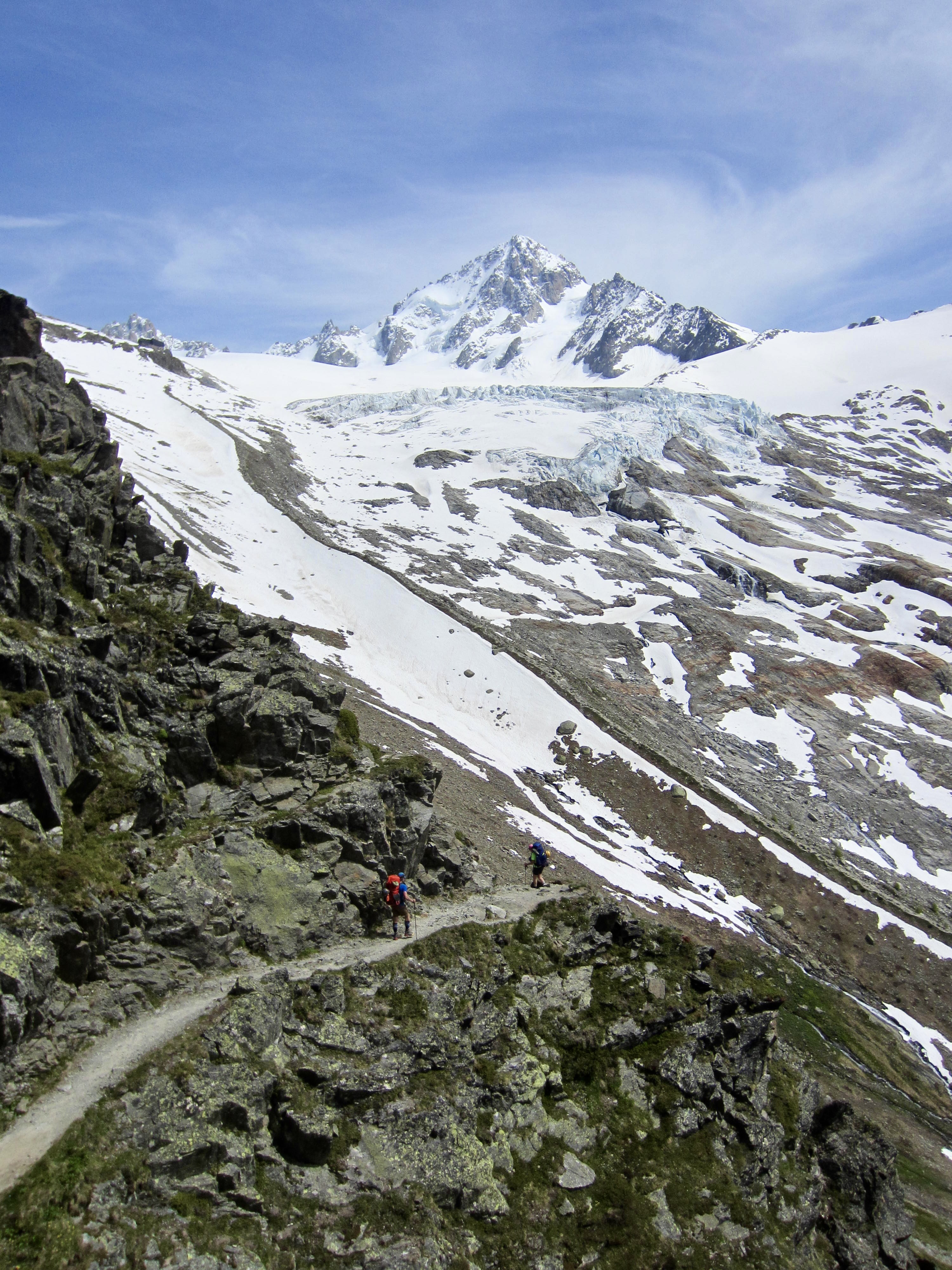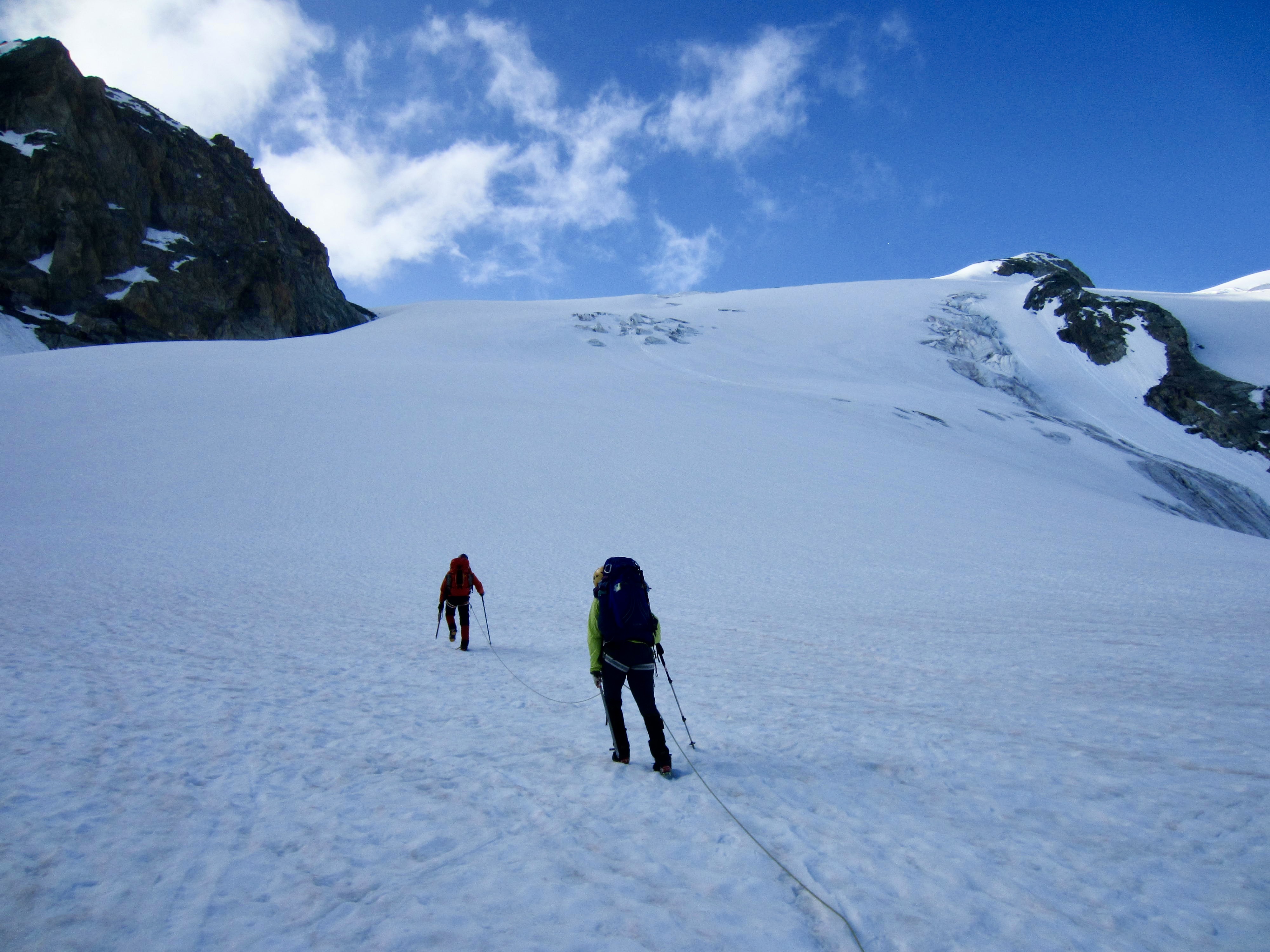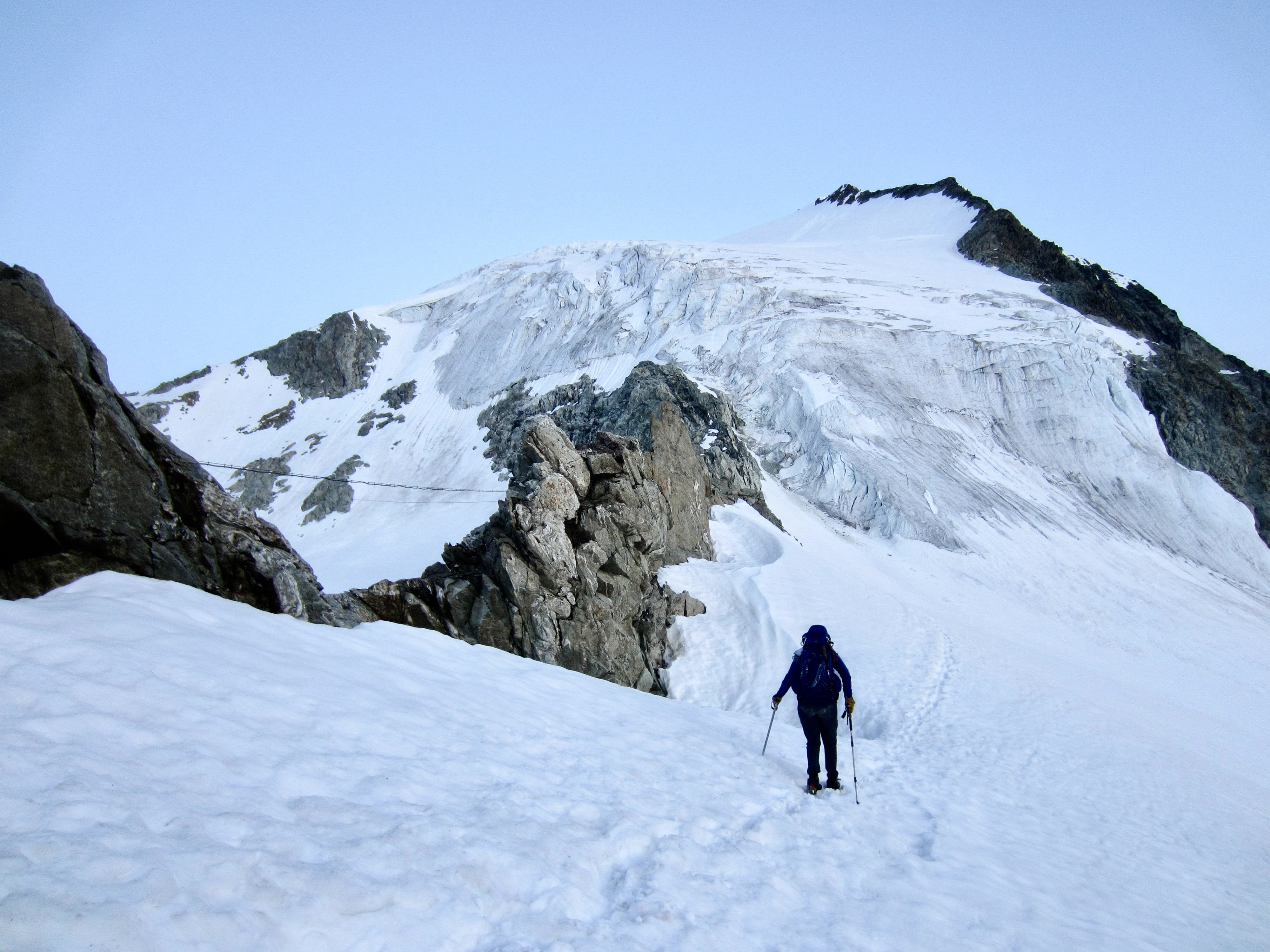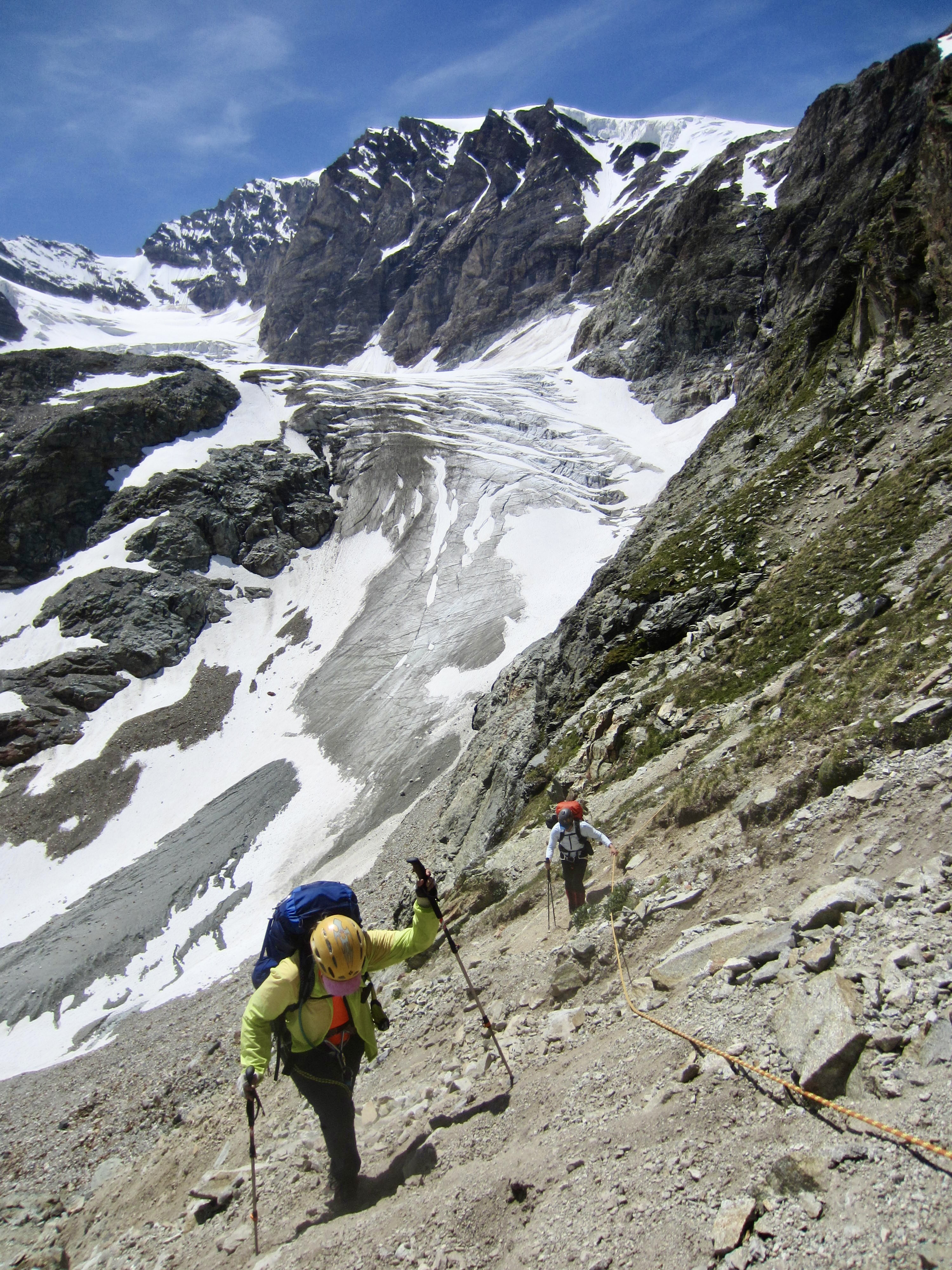 Leaving the hut at 5:30am, we crossed back over the steep snow slope, then walked along a level bench high above the Arolla Glacier. The cloudless sky heralded a beautiful day in the mountains.