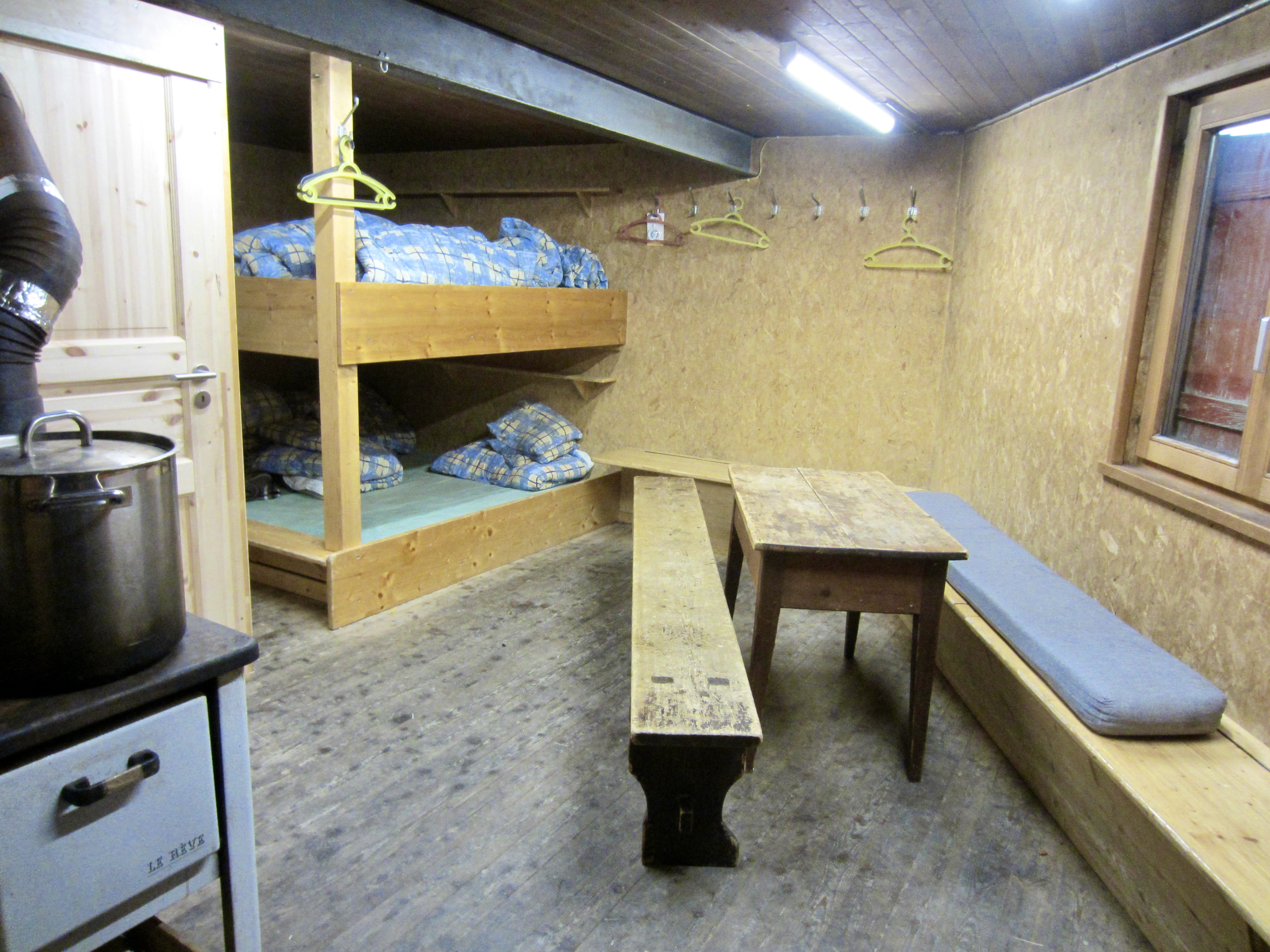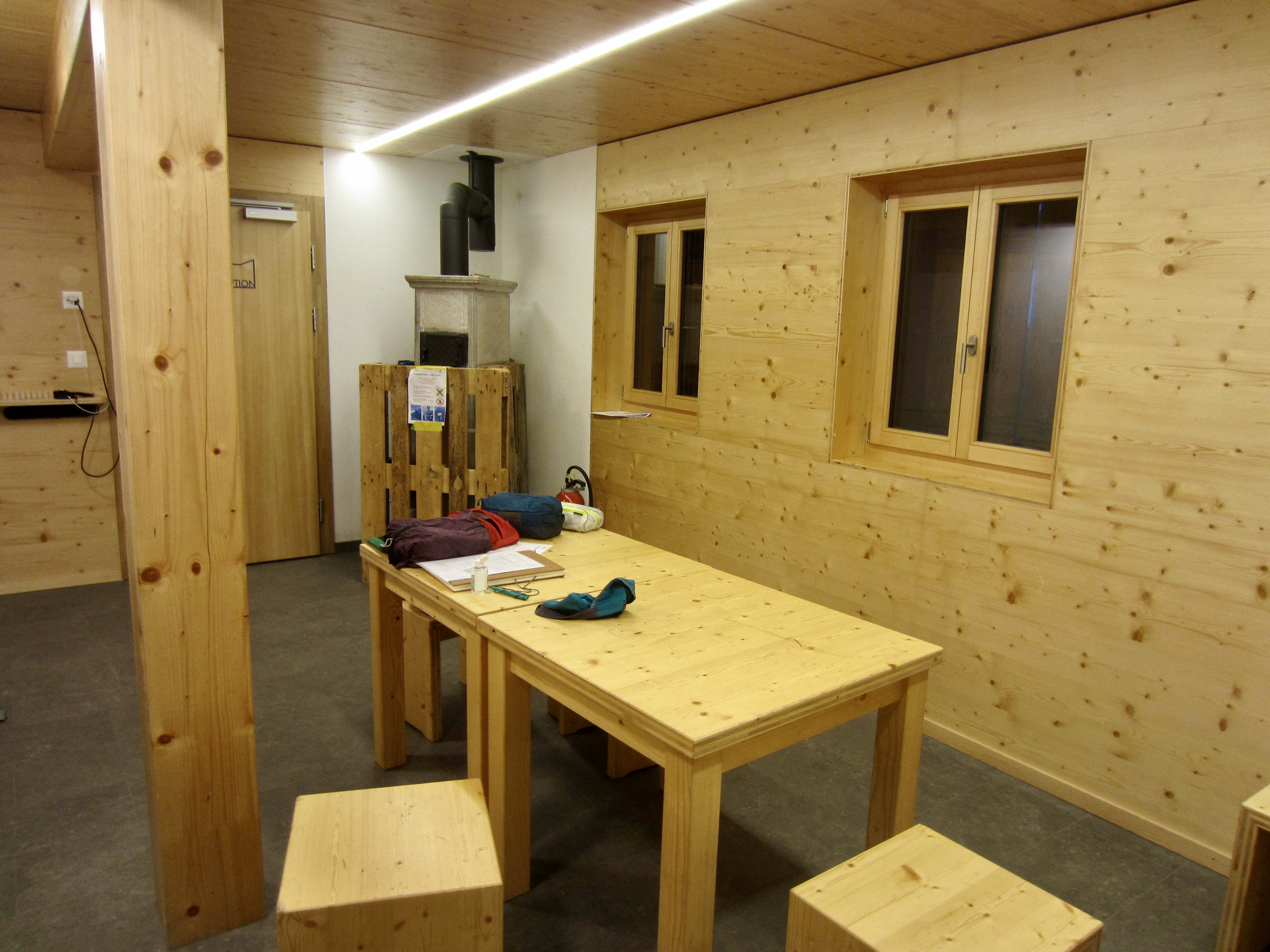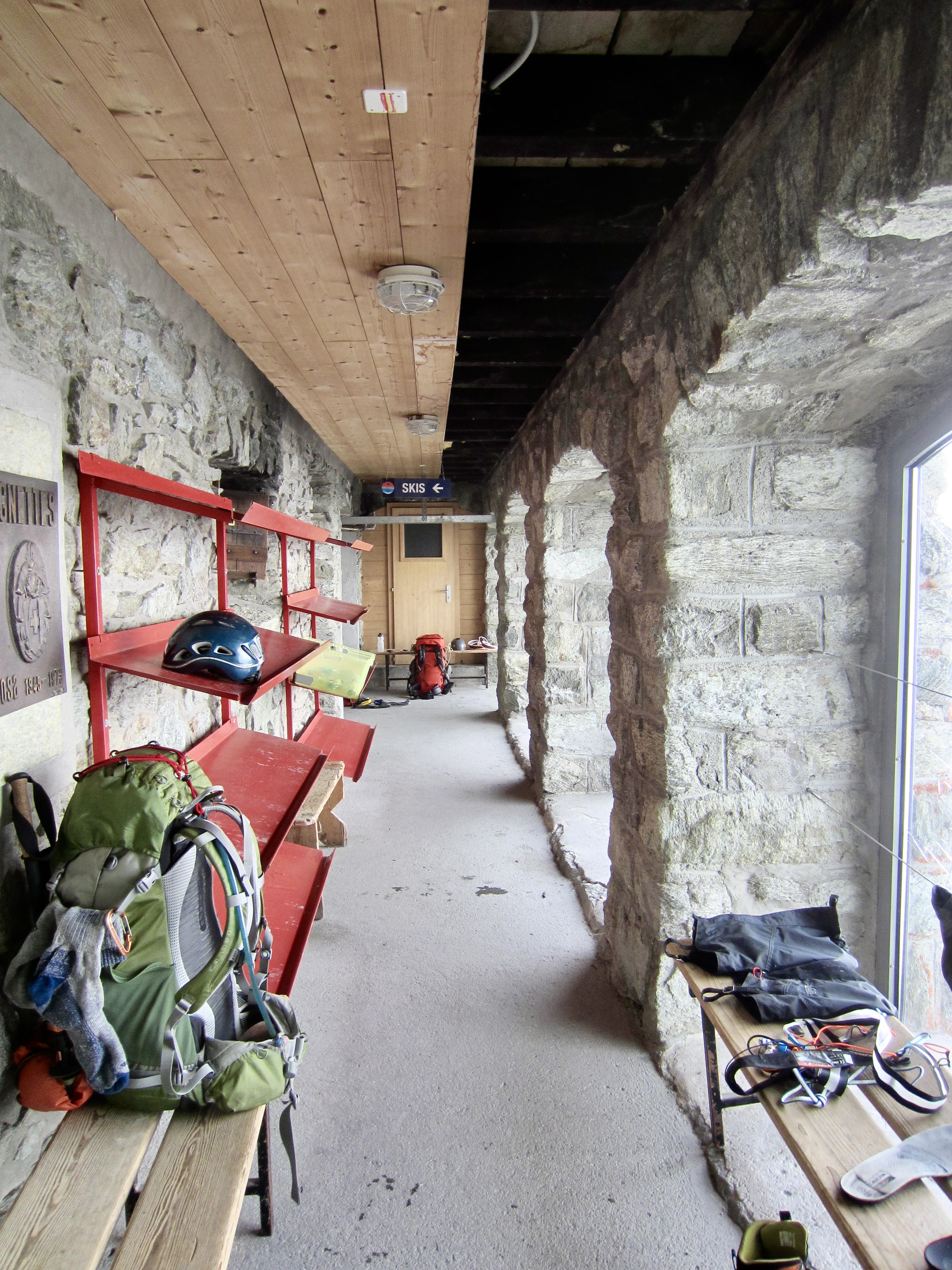 Inside the front door of Vignettes Hut is a long hallway with a row of arched windows overlooking the Arolla Glacier. This visually stunning hallway serves as a gear room for the entire hut. One doorway opens into the actual winter room, which is equipped with two tables, a gas cooktop, and a woodstove. For the first time in the past three nights, we were able to have a hot dinner.