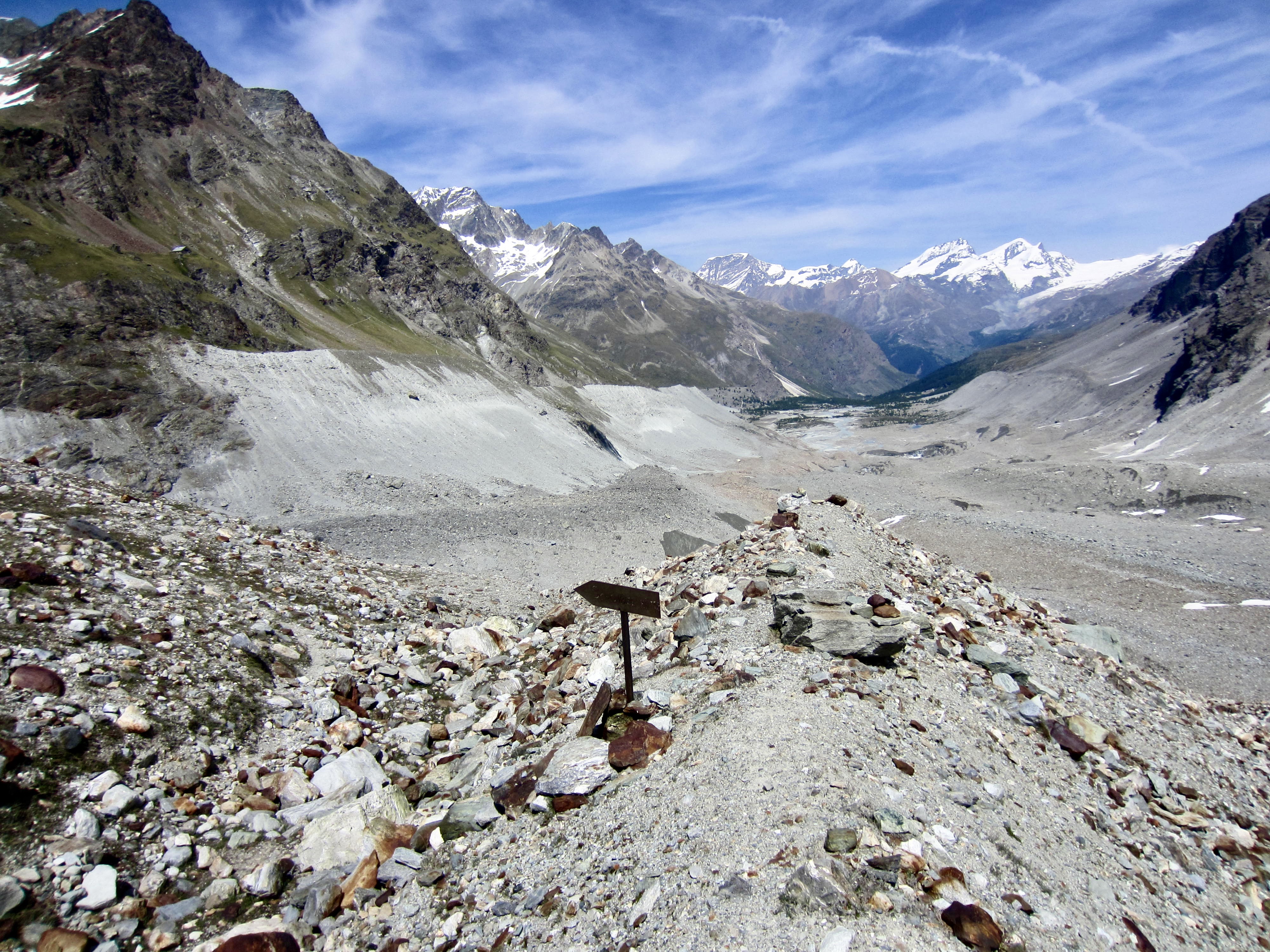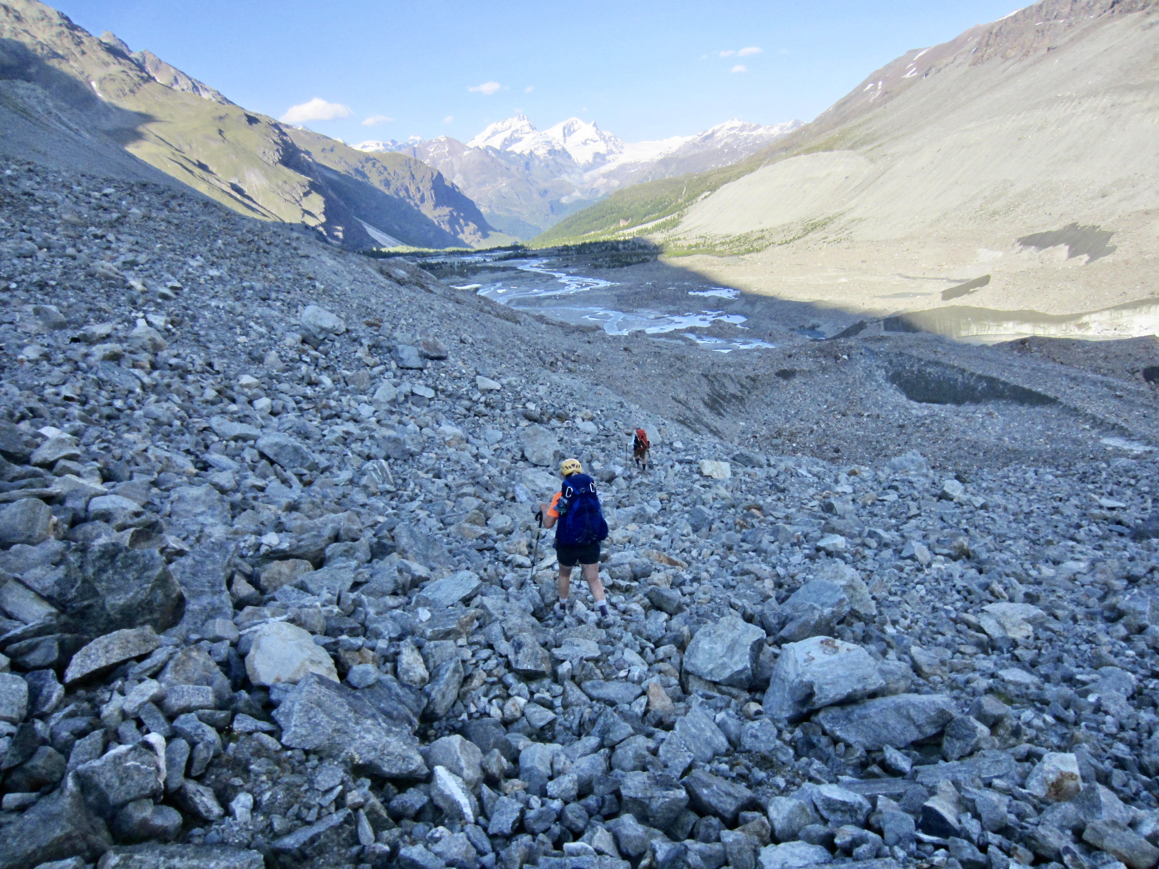 We had expected to find a decent footpath leading up the opposite valley wall and connecting with the Schonbiel Trail that leads out to Zermatt. However, such a path did not exist here; it was just a tall, steep, loose, and treacherous erosion slope. Our only exit option was to head straight down the Zmutt Glacier valley on the moraine slope. We spent the next three hours tediously working through the morainal rubble and post-glacial detritus, continually hopping from one unstable boulder to another while trying not to be crushed.