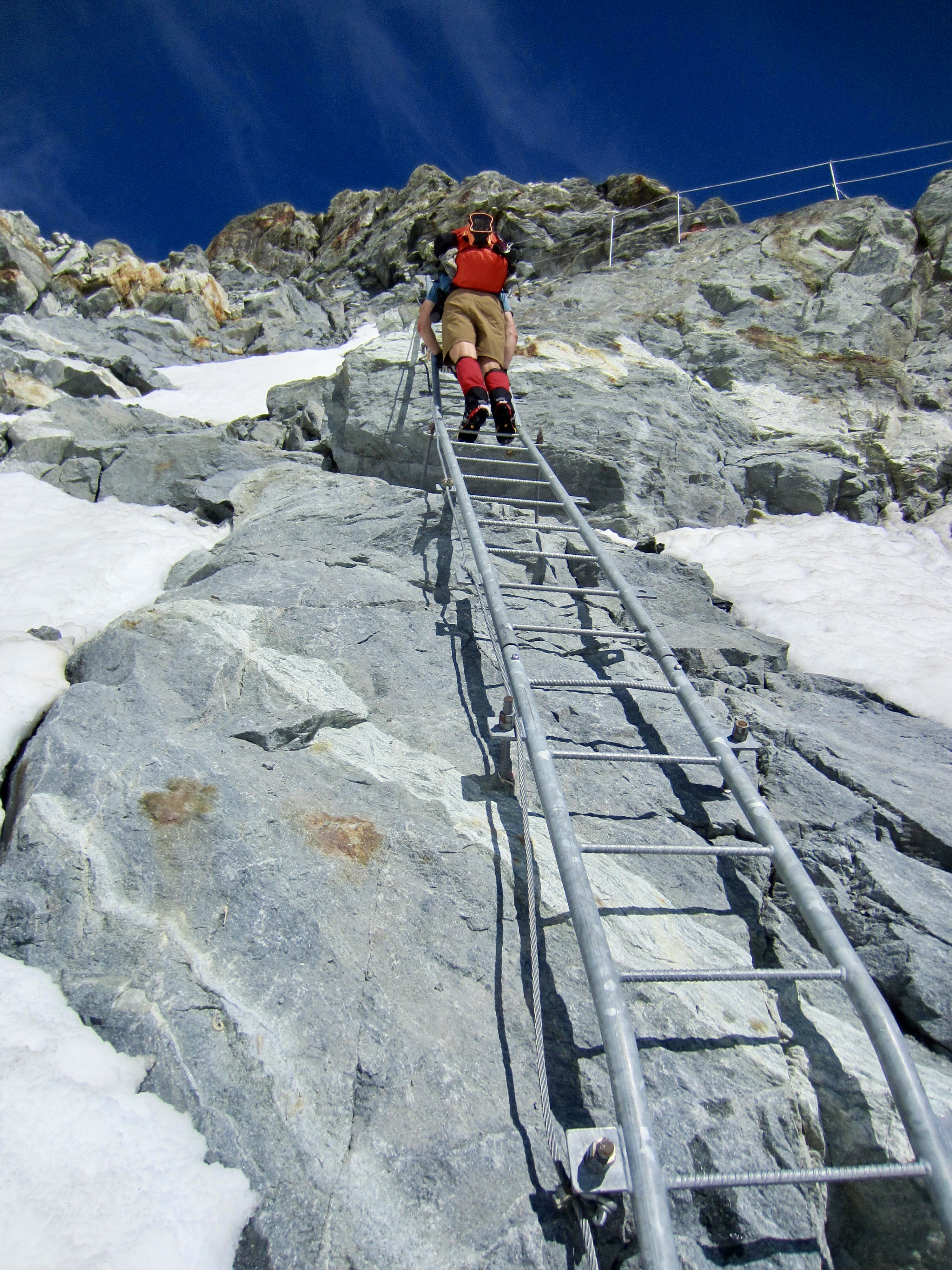 The lower set of ladders ended at a snow patch between two cliff bands. Incredibly, there was another set of ladders bolted to the upper cliff. Our “alpine Disneyland” experience continued!