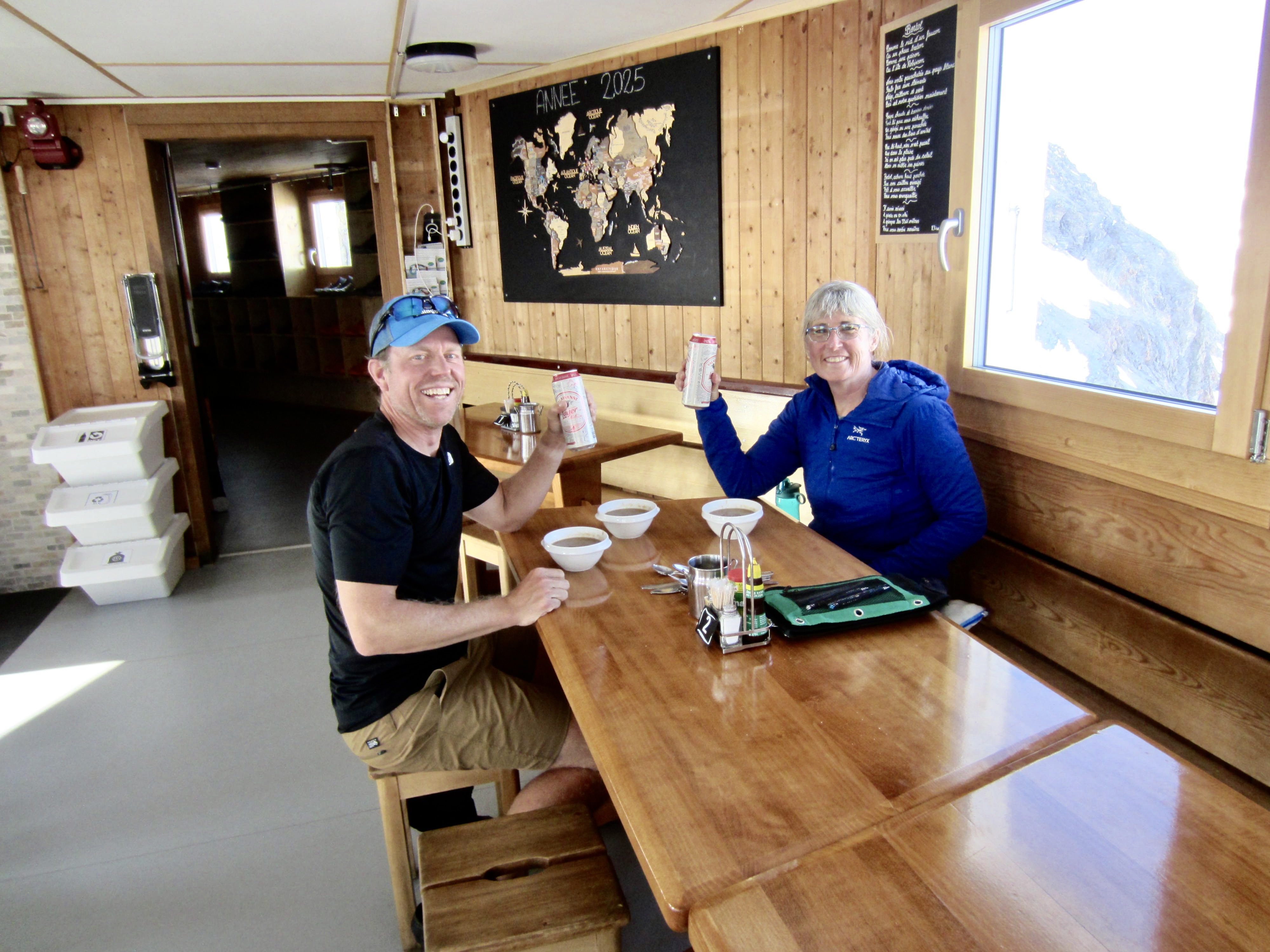 We had been looking forward to a hot meal, so it was distressing and disappointing to learn that we didn’t have dinner reservations, due to an online snafu. Fortunately, a bilingual guest heard about our situation and pleaded with the French-speaking hut manager to fit us in. His pleas were successful, and we were able to enjoy a hearty meal on our final night.