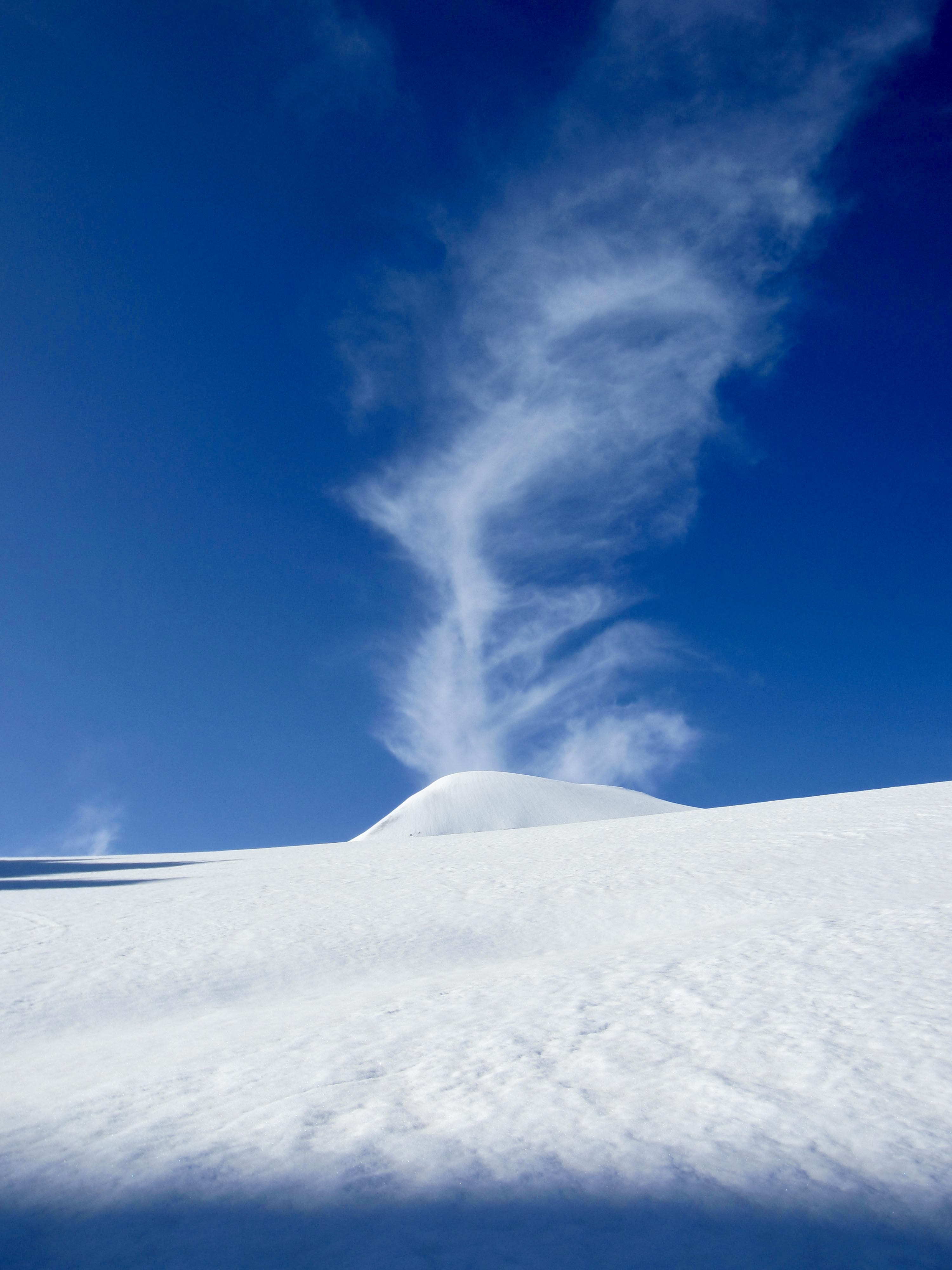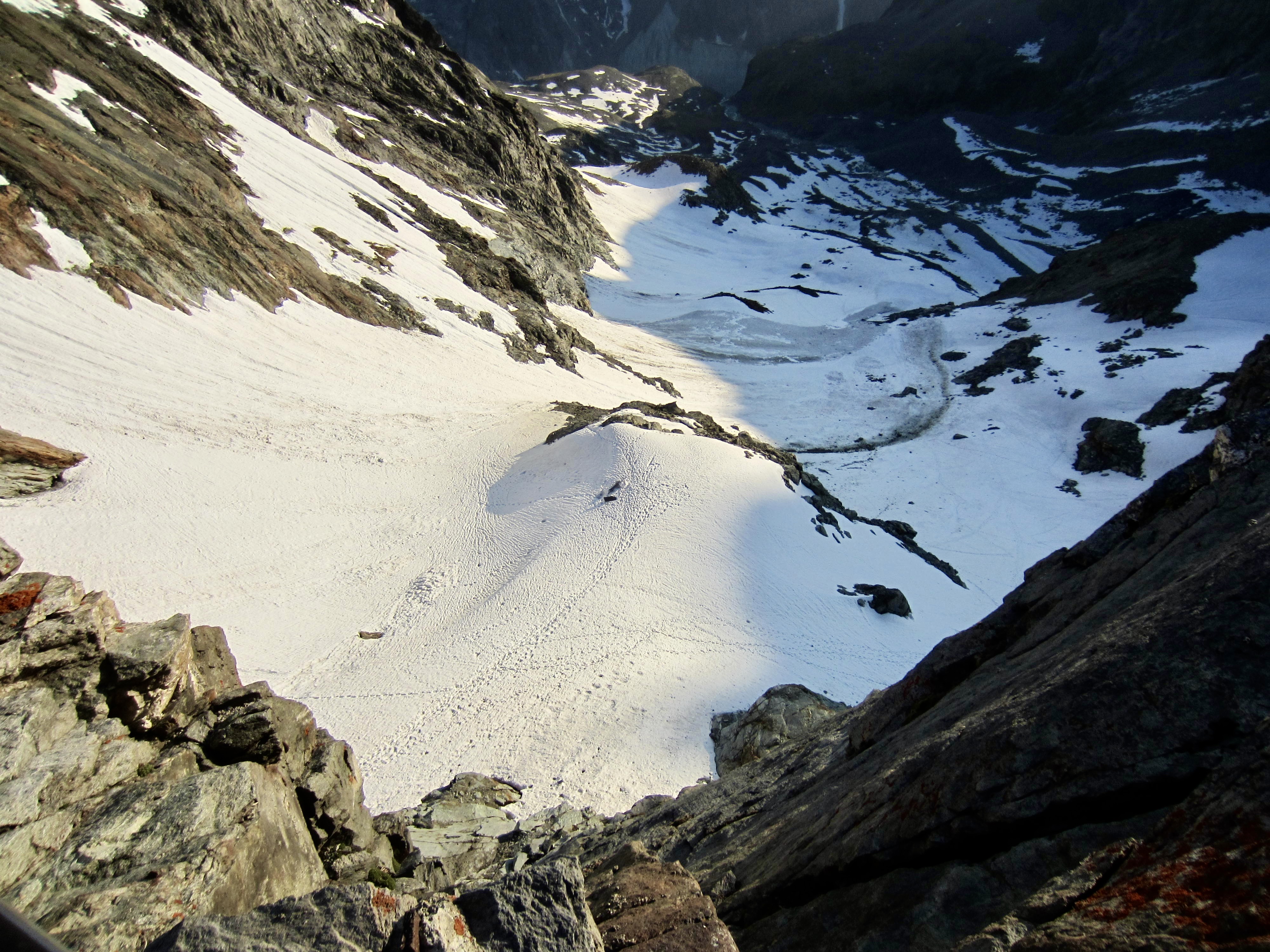 After backtracking to the col, we made a northerly traverse along the base of a long, corniced ridge. It then dawned on us that this ridge is in fact an arm of a nearby peak called La Serpentine. On a map, the peak’s north ridge extends out like a serpent.