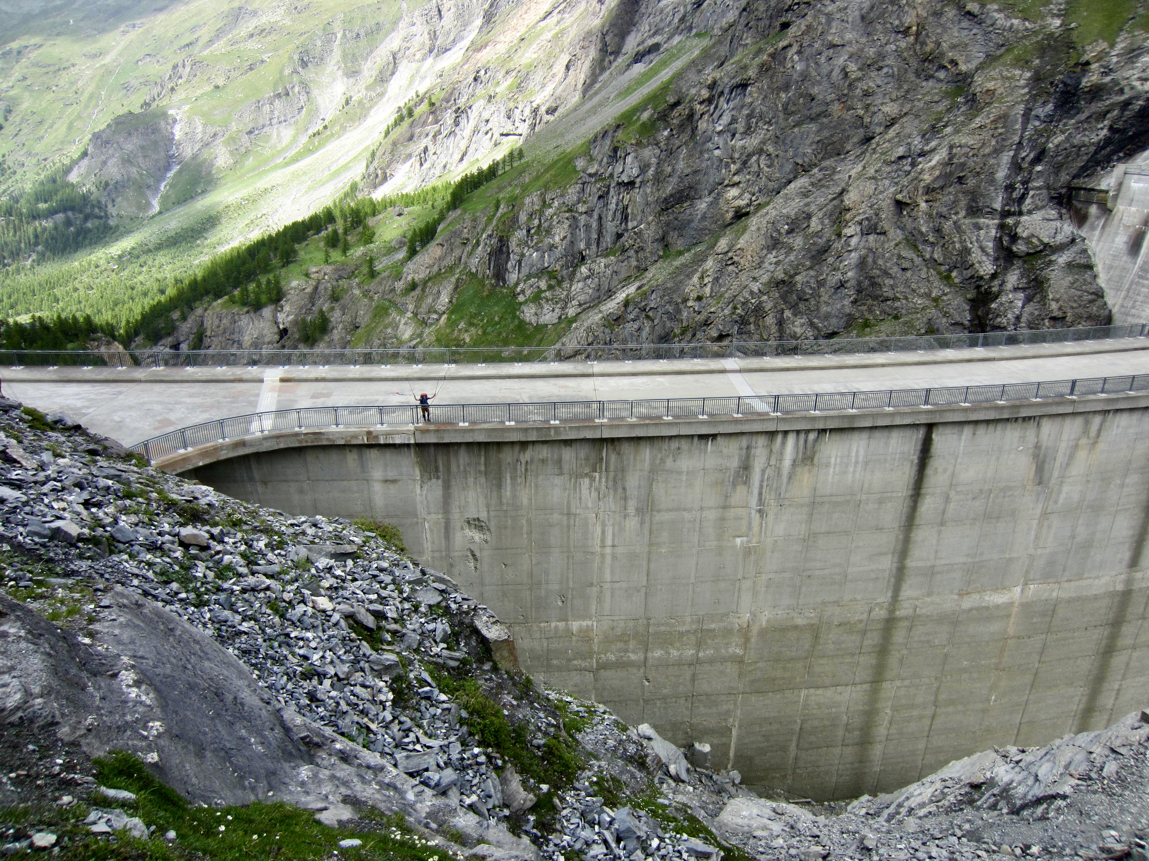Minutes later, we were all happily tromping across the top of Mauvoisin Dam. This marvel of engineering and construction measures 1700 feet / 520 meters long by 820 feet / 250 meters high, which currently makes it the eighth highest dam in the world. The fact that it serves as a key segment of a formal hiking trail puts it in the same special category as Ross Dam in the North Cascades.