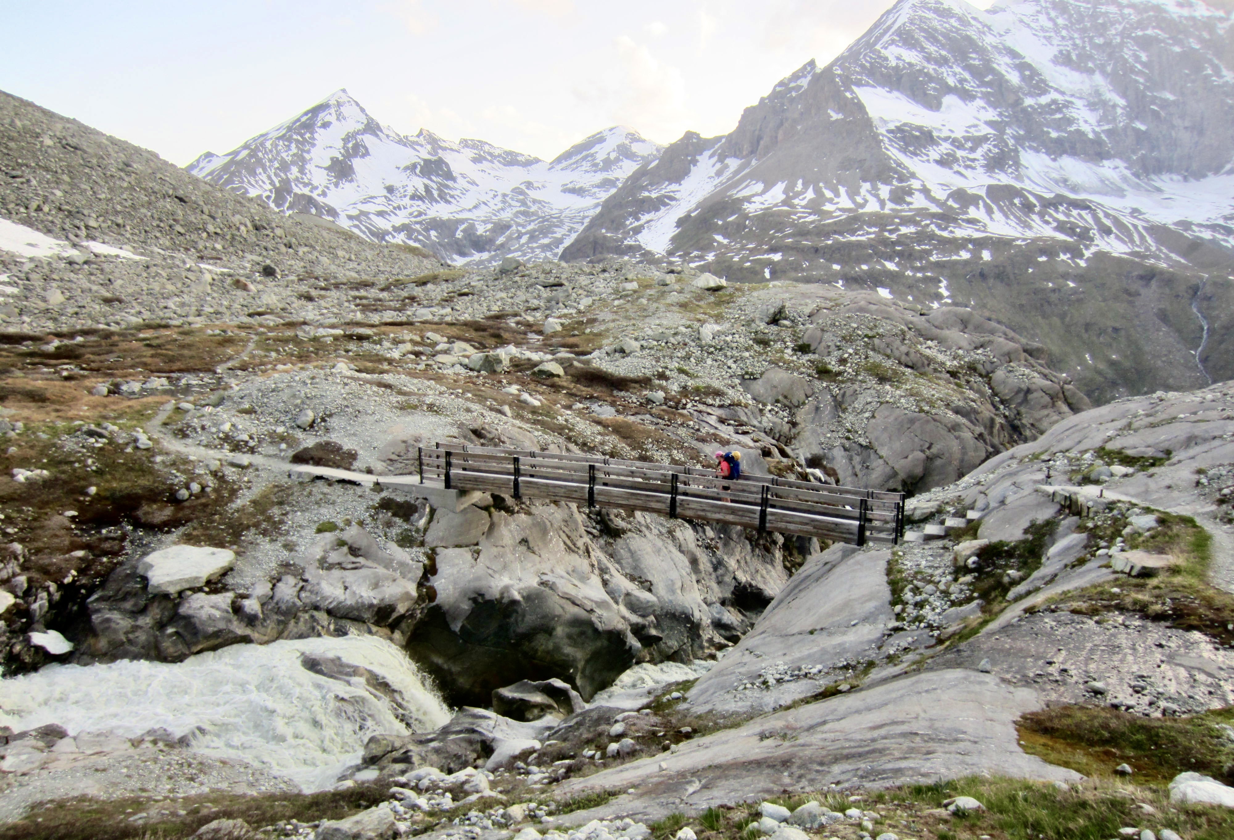 Our gradual ascent ended at 8,600-foot / 2,600-meter Tsofeiret Col. From here, a steep, eroded trail led us down the other side and across the deep gorge of Brenay Creek on a high girder bridge. In fading light, we finally arrived at Chanrion Hut.