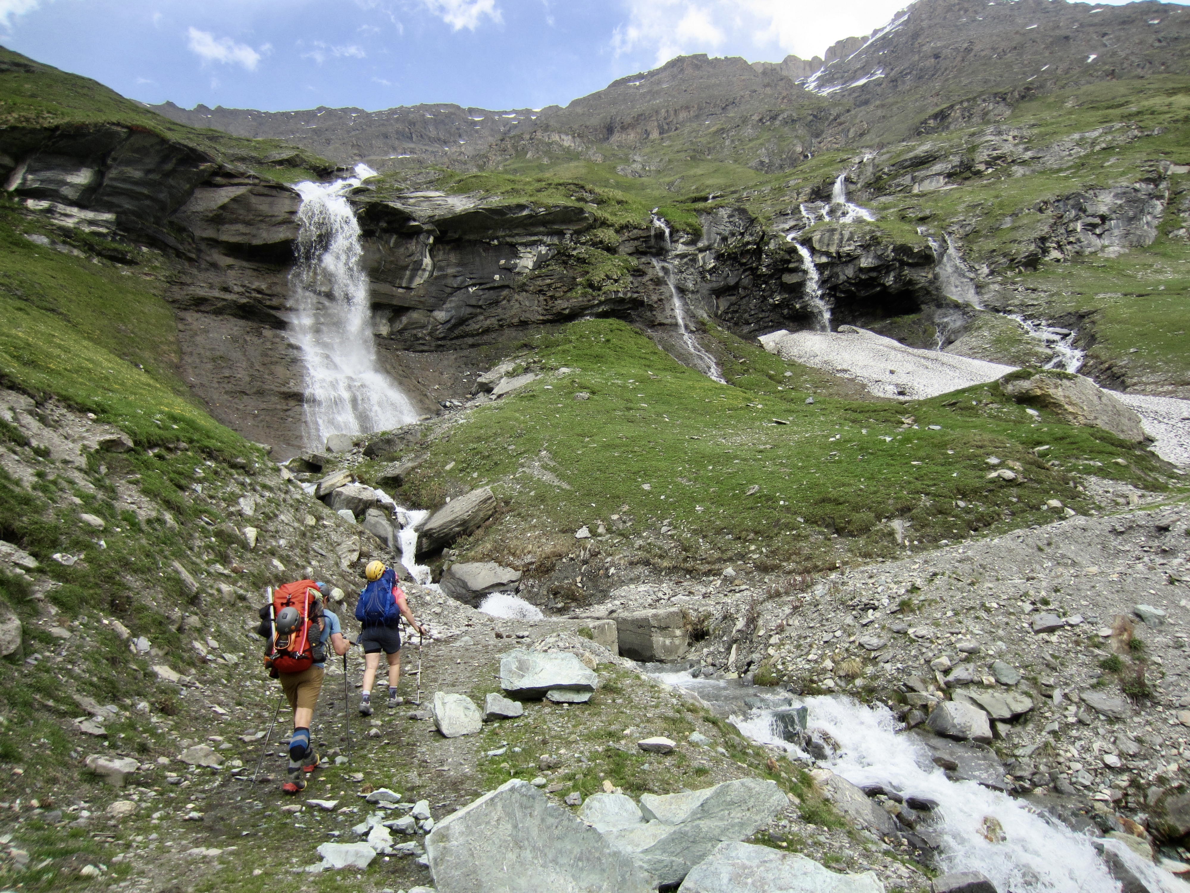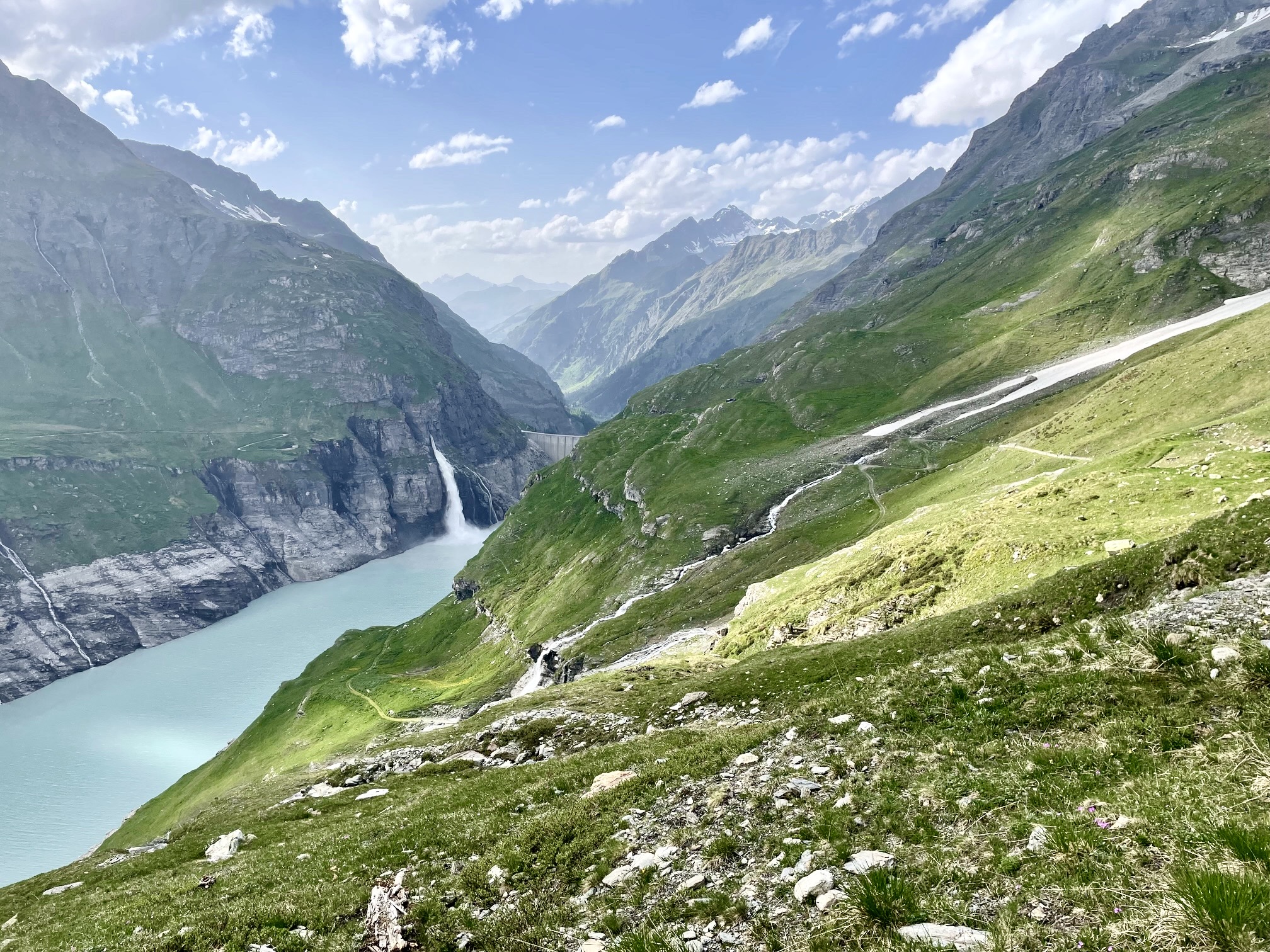 The old roadway eventually transitioned to a single-track trail that climbed onto a grassy hillslope. Far below, we could see numerous streams plunging into Mauvoisin Lake. The largest one of these shot out of a cliff-face tunnel like a giant firehose.