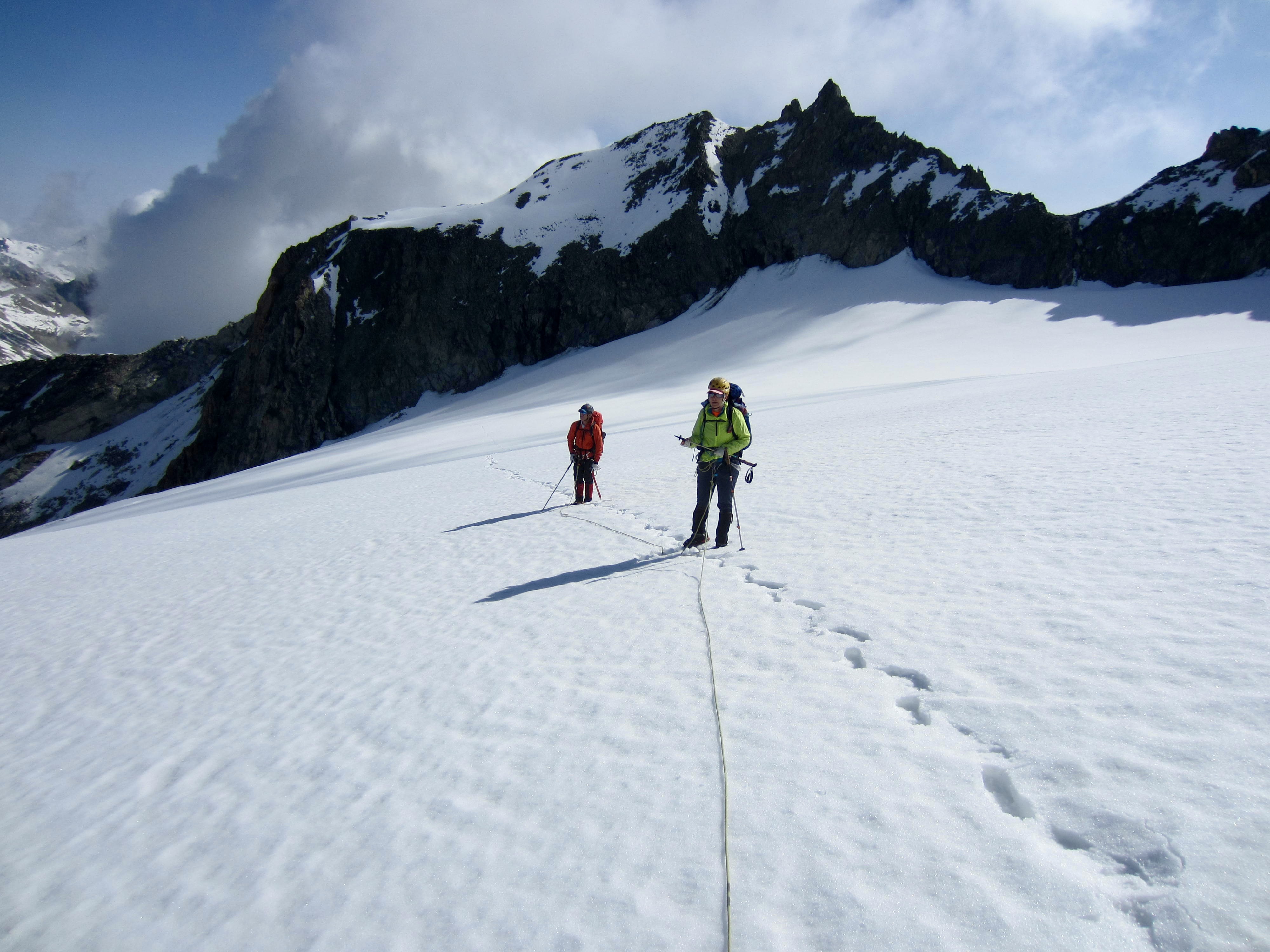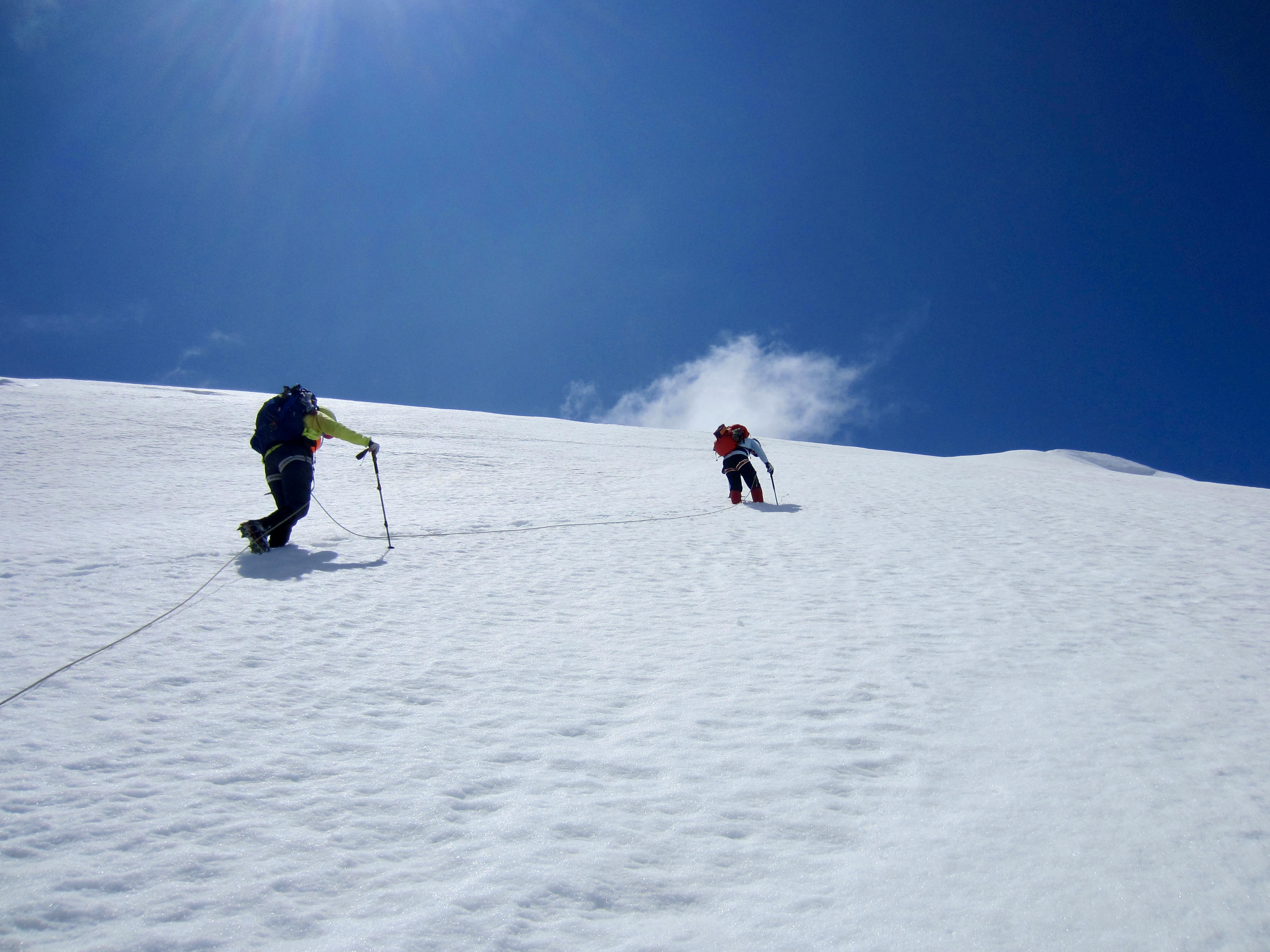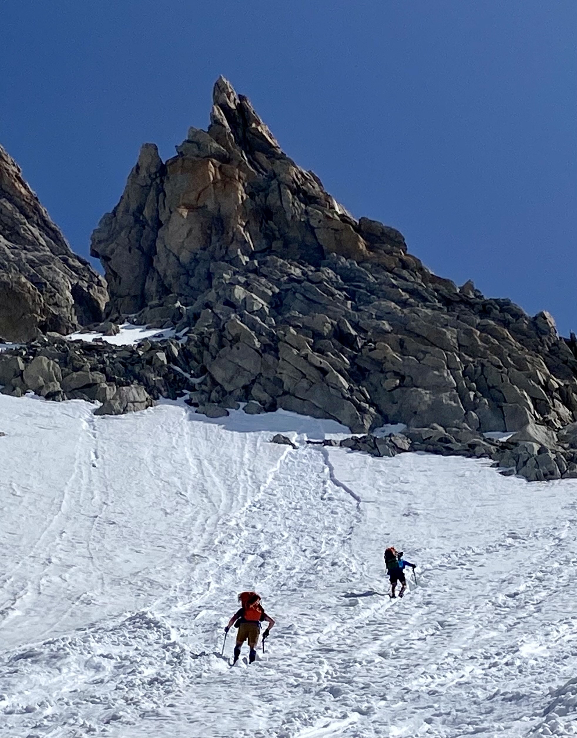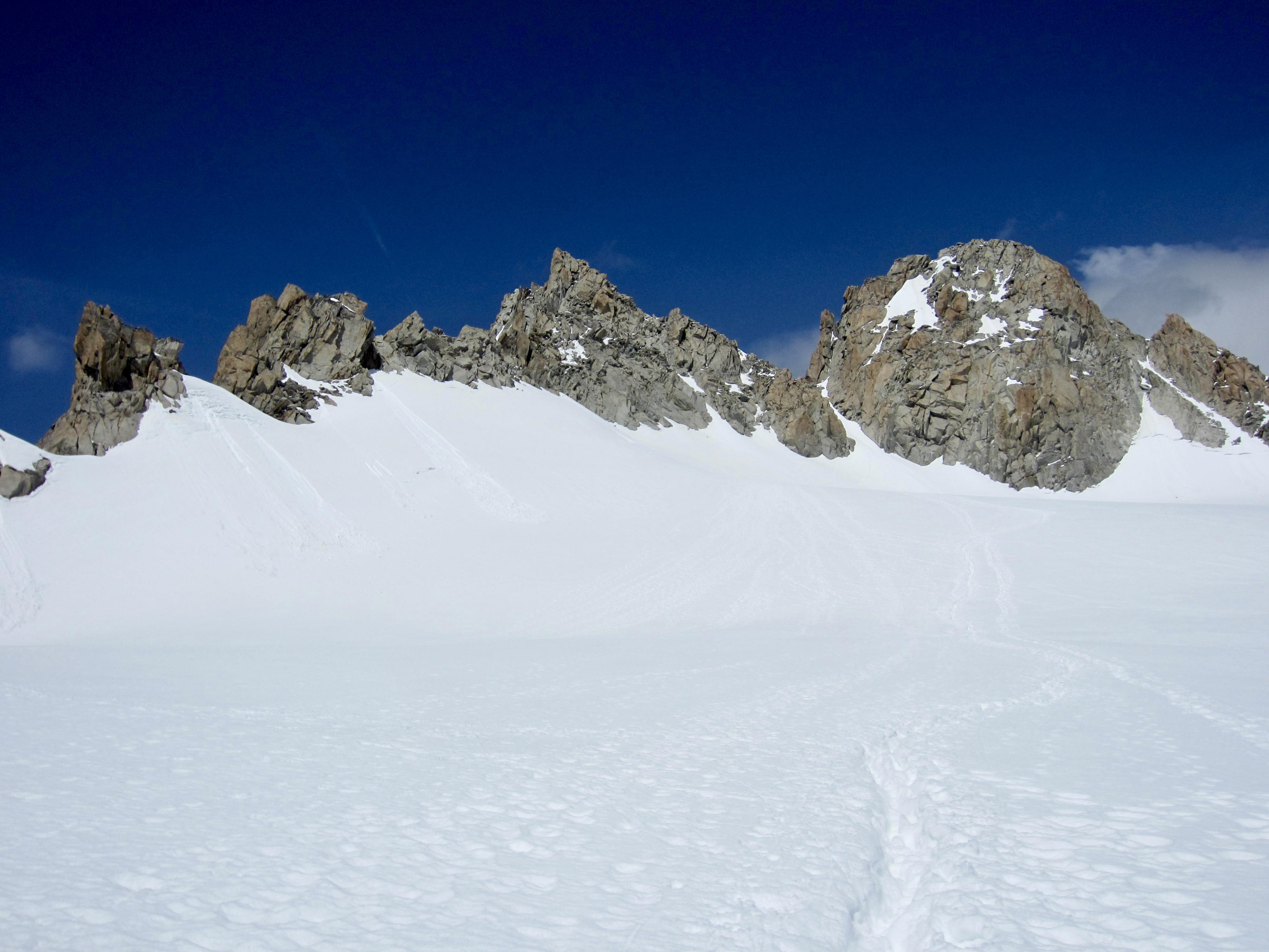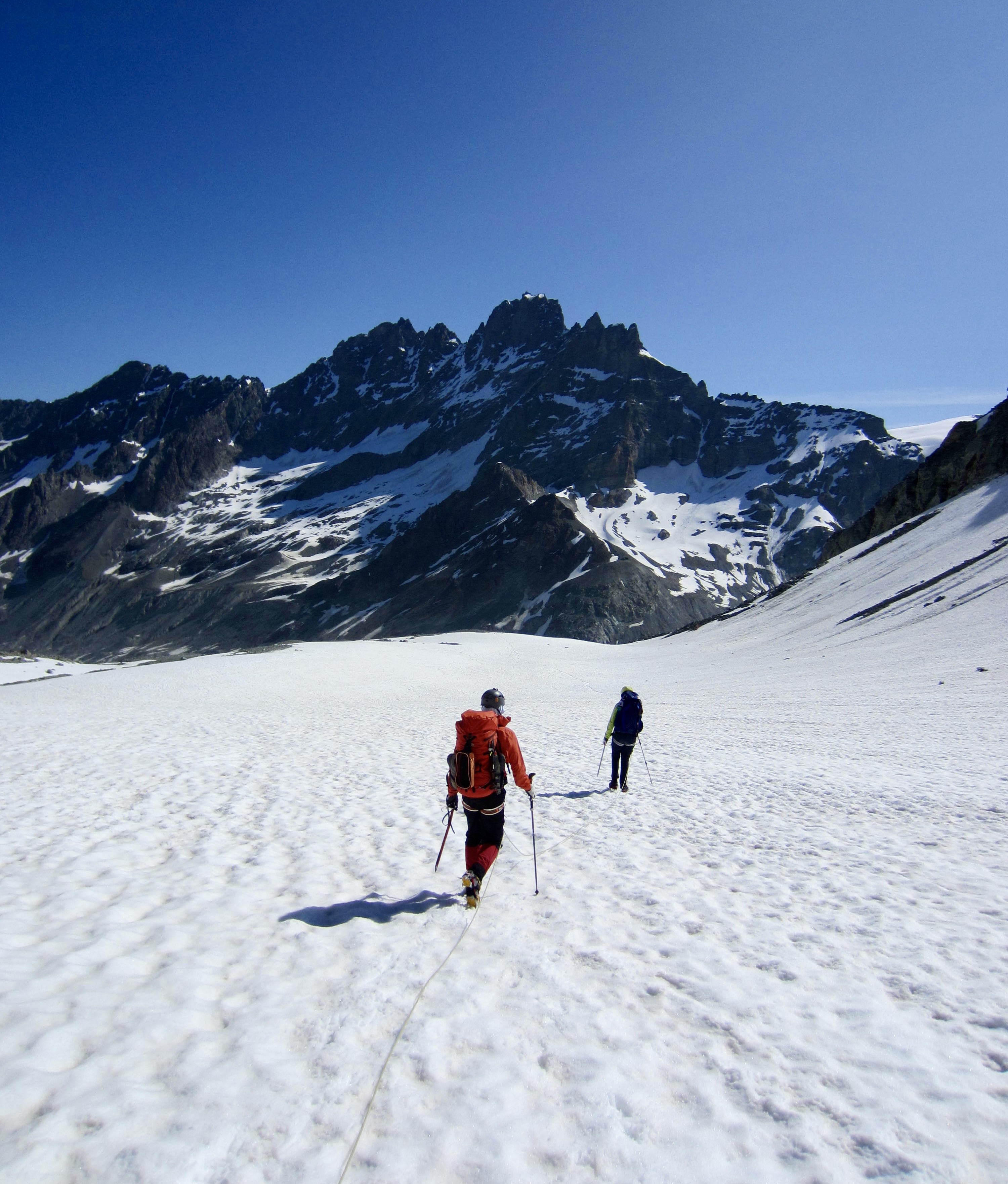 Before long, we began encountering numerous groups of guided climbers coming down the glacier. Apparently, they had already tucked in their chosen peaks and were returning to the hut and, in many cases, hiking back to town. One guide looked askance at our casual approach and submitted his opinion with a heavy French accent: “In my mind, you are crazy!” Hmmm. Did he know something we didn’t?