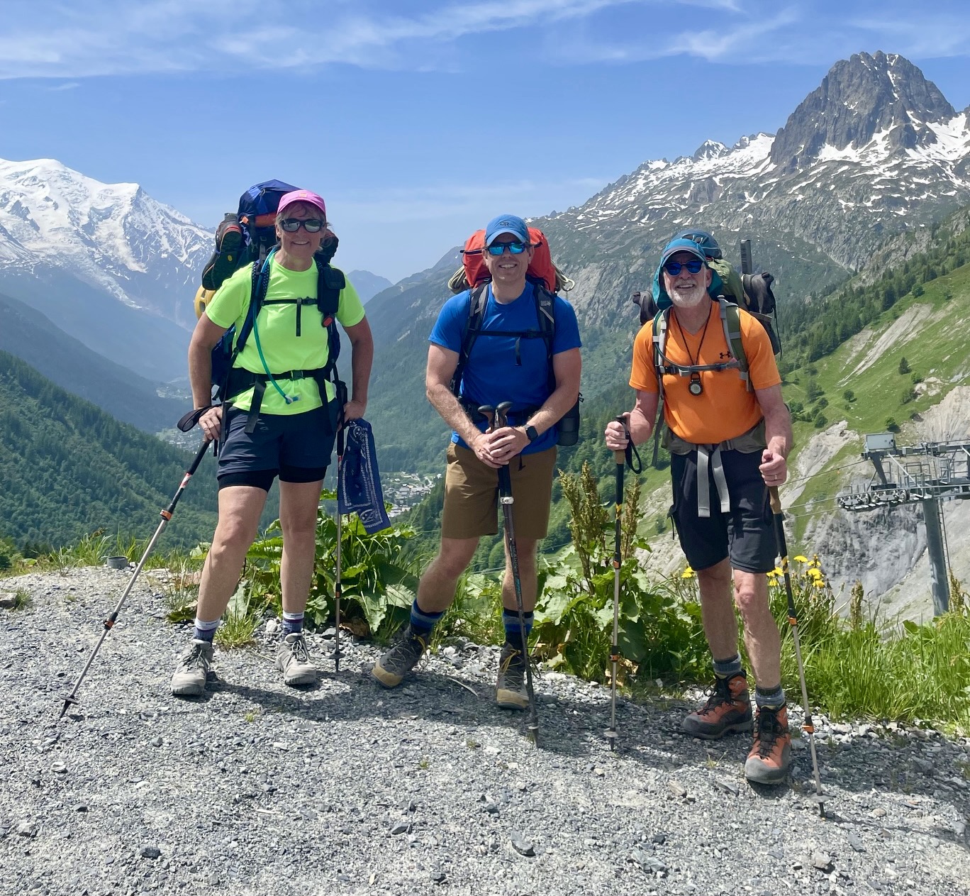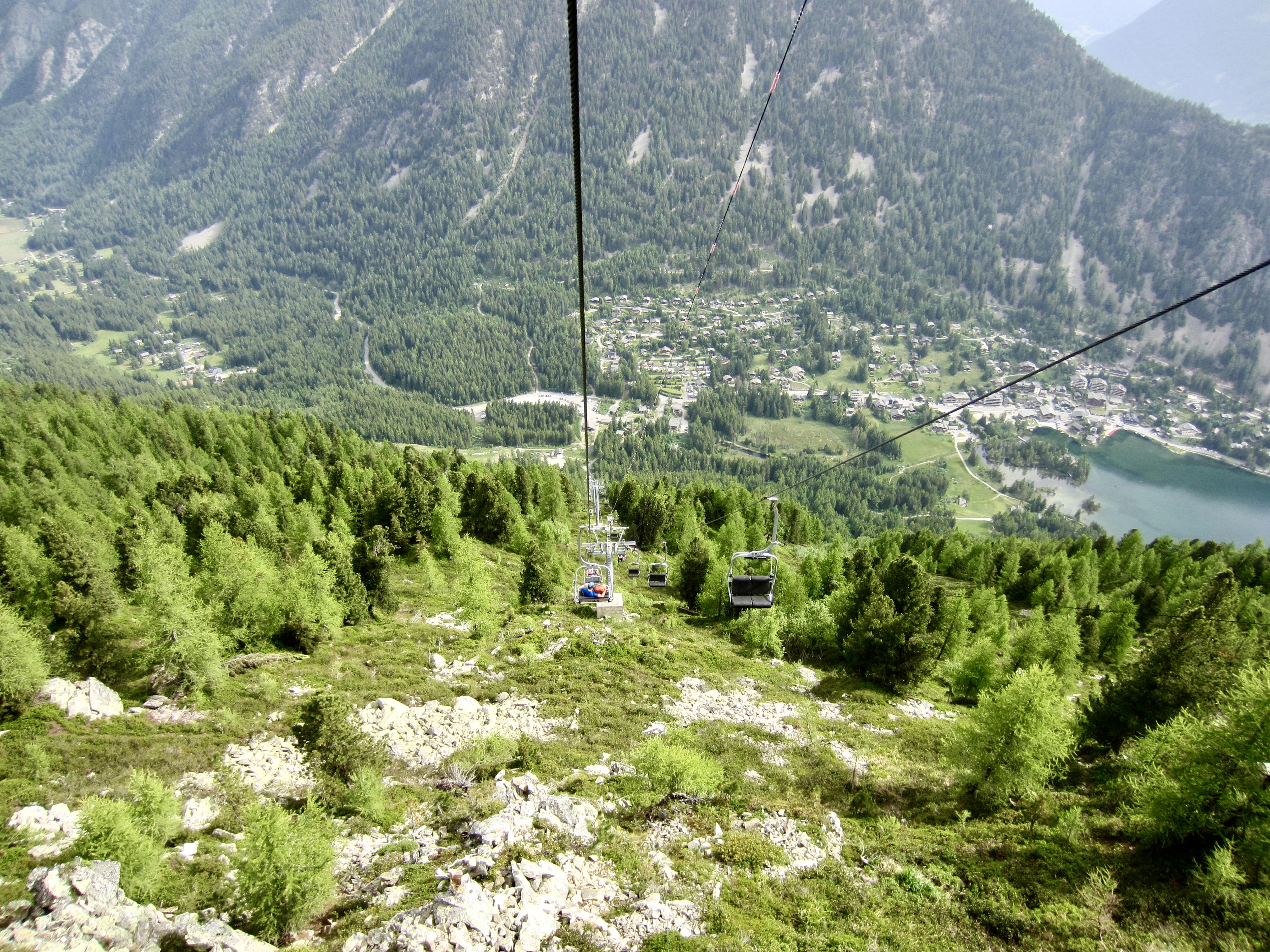 La Breya Chairlift dropped us 2300 vertical feet / 700 vertical meters in a breathtakingly short distance. It was the steepest chairlift ride any of us had ever taken, and we were very happy that it was equipped with safety bars to keep our bodies and backpacks on the seats! At the base station, we strolled into Champex-Lac to grab lunch and a taxi.