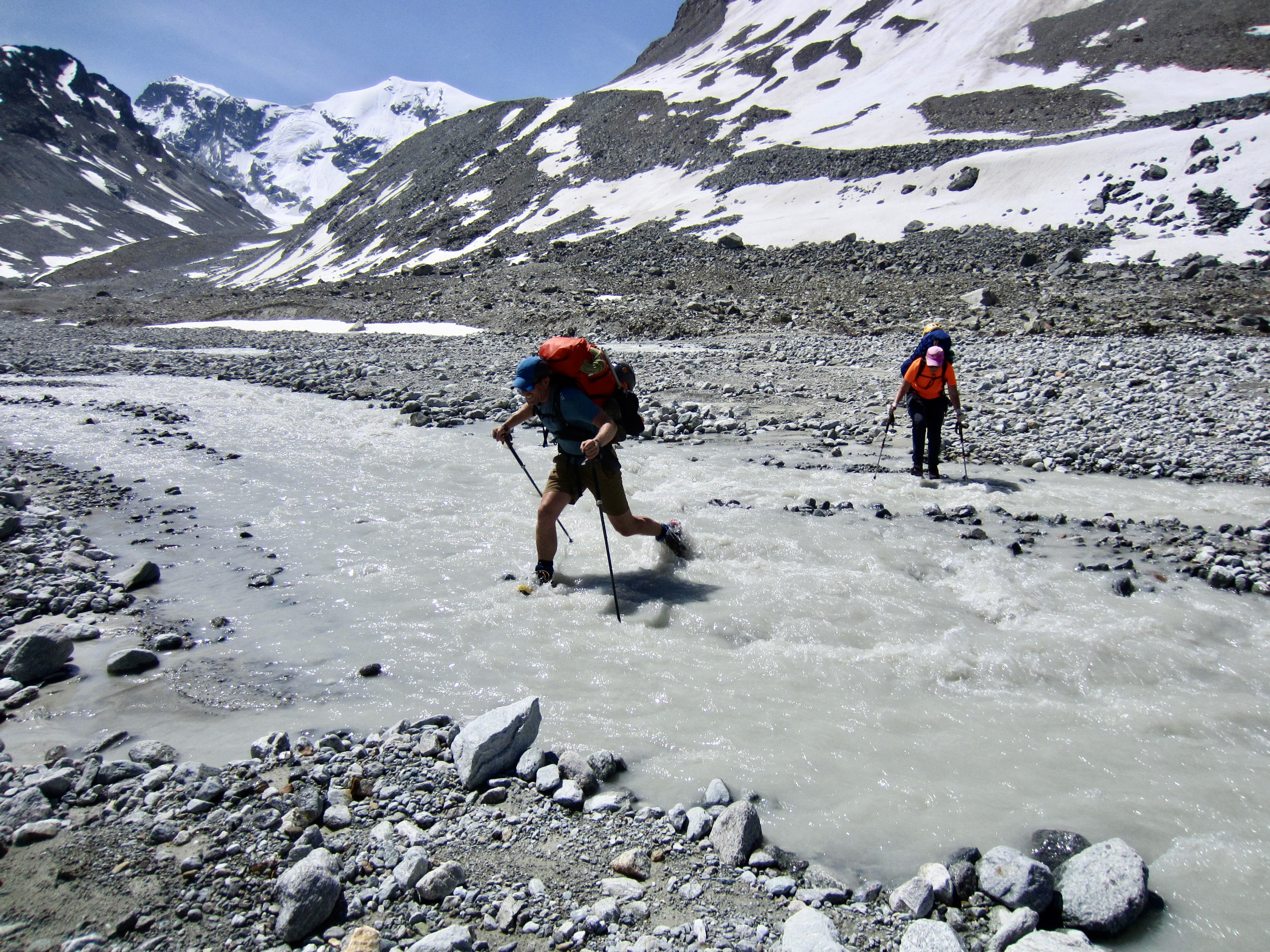 Before long, we realized that our path had deflected us onto the wrong side of the braided outwash stream. Getting to the other side required rock-hopping or fording six or seven individual braids. I guess we were destined to have wet boots on every day of the traverse!