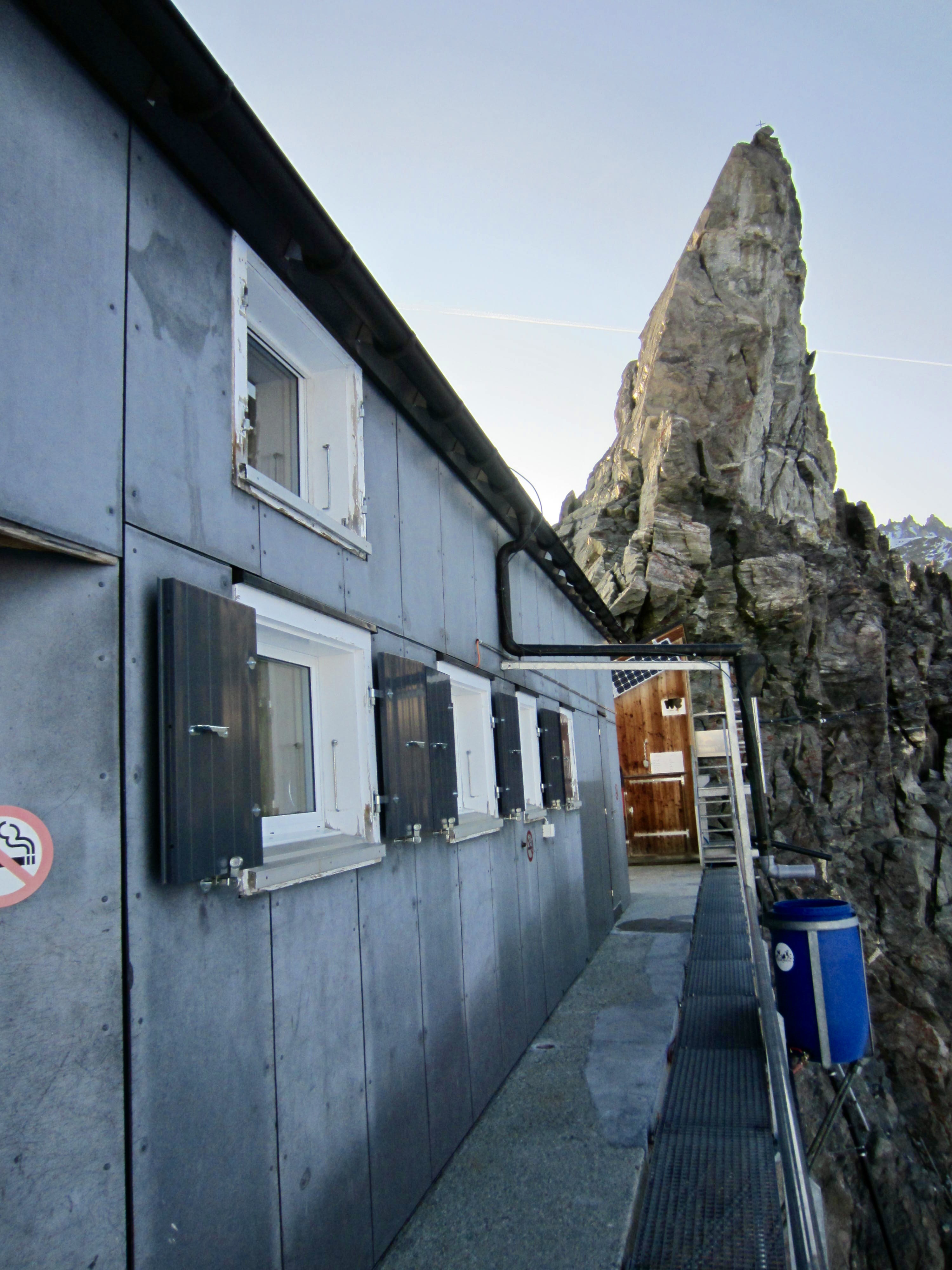 Climbing multiple ladders while wearing a heavy pack at an elevation of nearly 11,000 feet / 3,350 meters is quite exhausting. We were breathing heavily by the time we stepped onto the hut’s metal balcony at 6:00pm. As would be expected, views were marvelous in all directions.