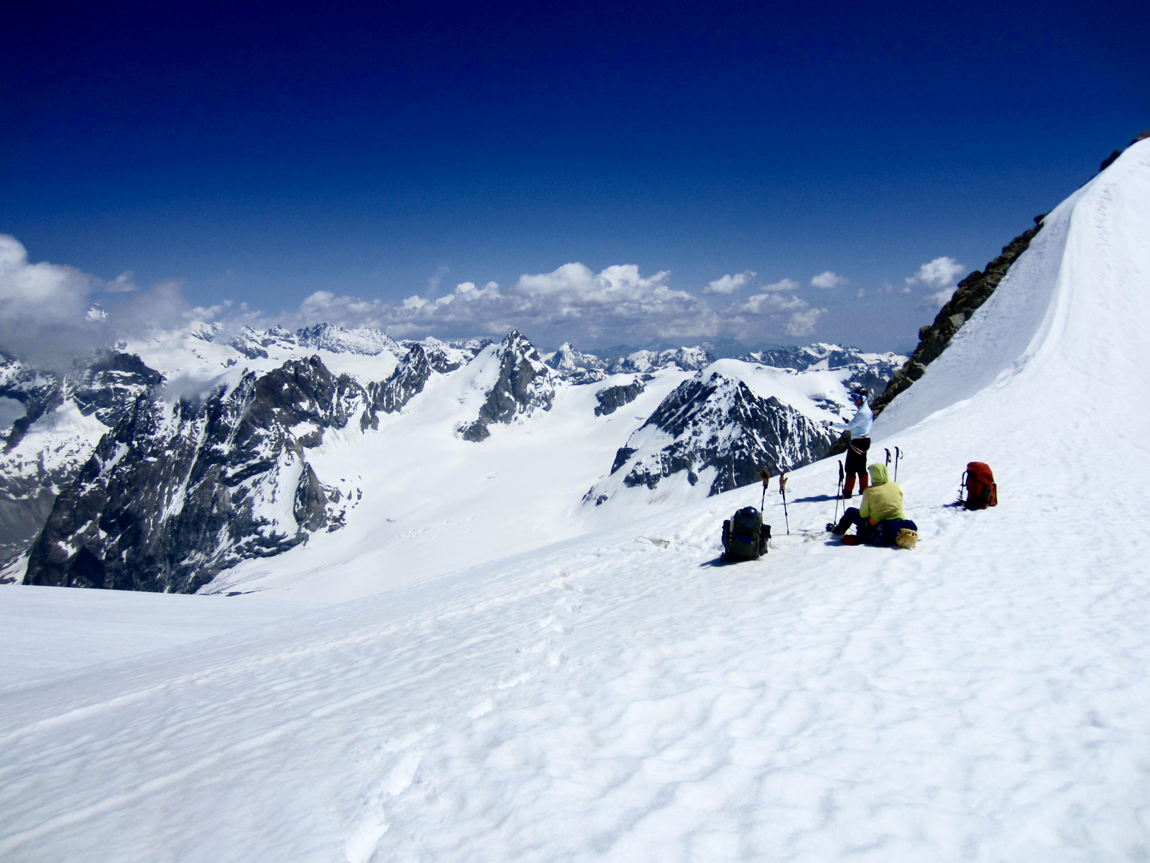 During our morning ascent, we reveled in the perfect snow conditions, flawless weather, and grand scenery. This turned out to be the most glamorous portion of our entire traverse, and we stopped at Eveque Col to soak in the wonderful ambiance.