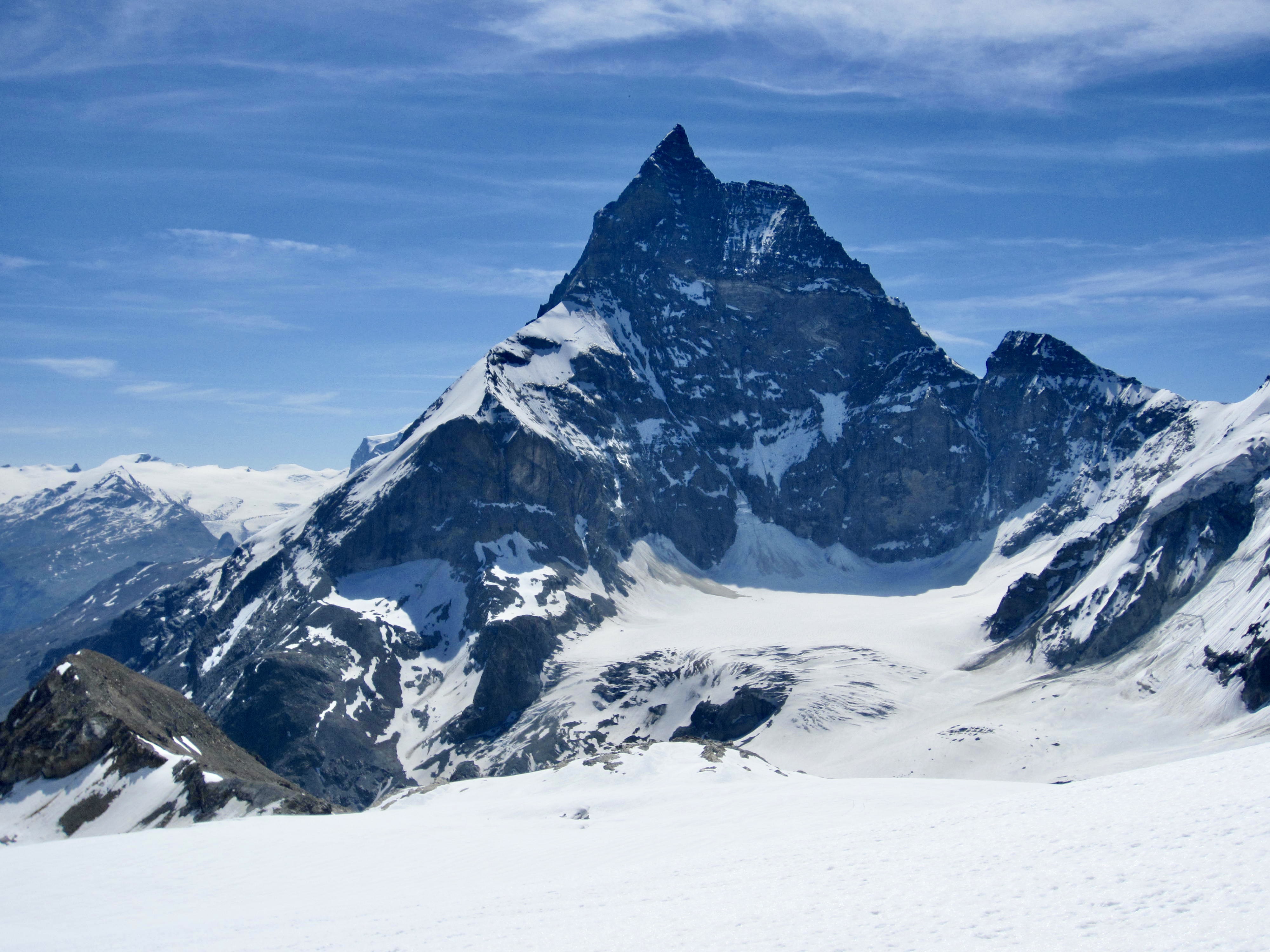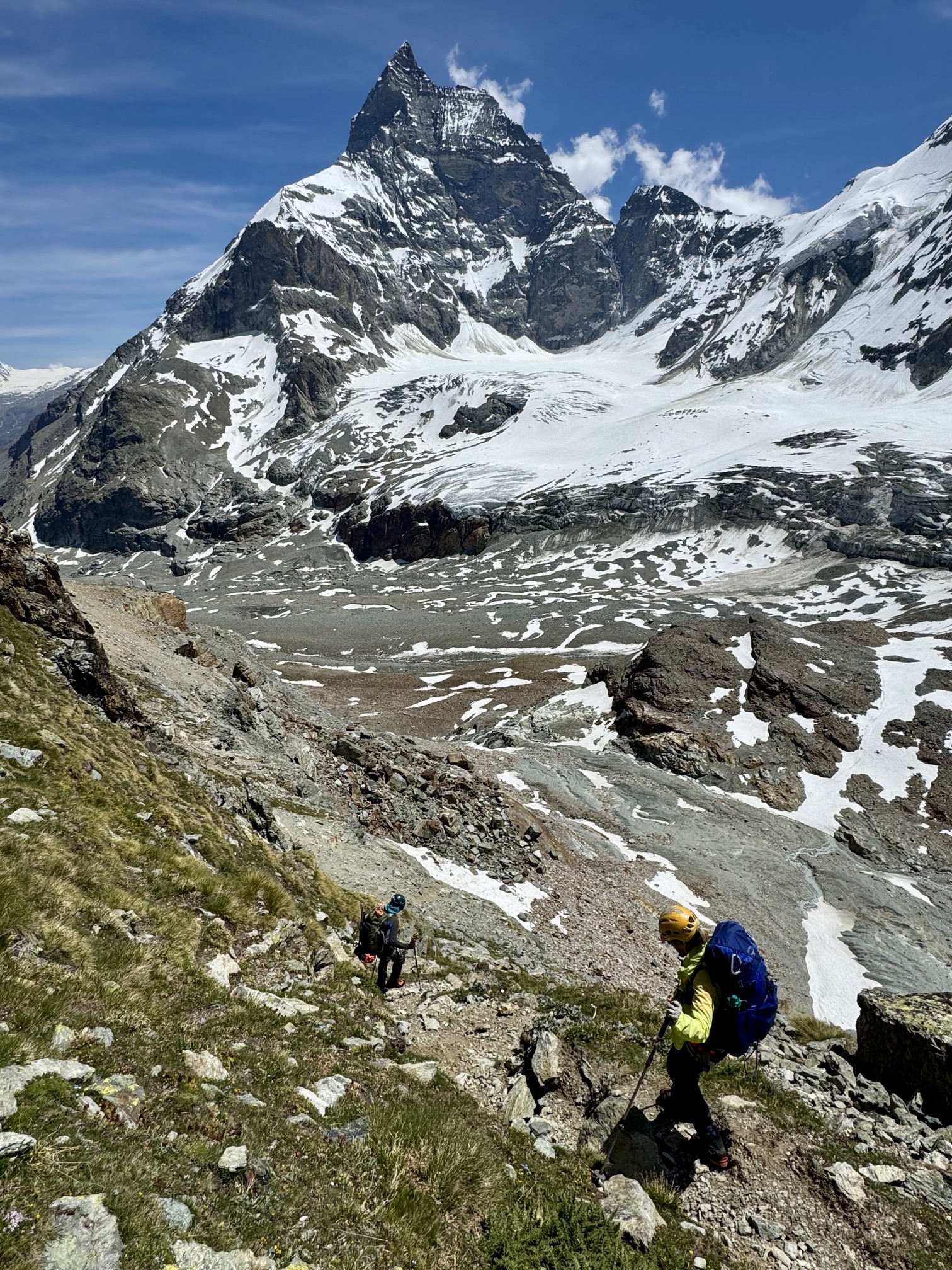 Tete Blanche Col provided our first full view of the Matterhorn. From this close-up vantage, the massive west face sweeps upward until culminating in a sharp summit horn. It was a jaw-dropping sight!