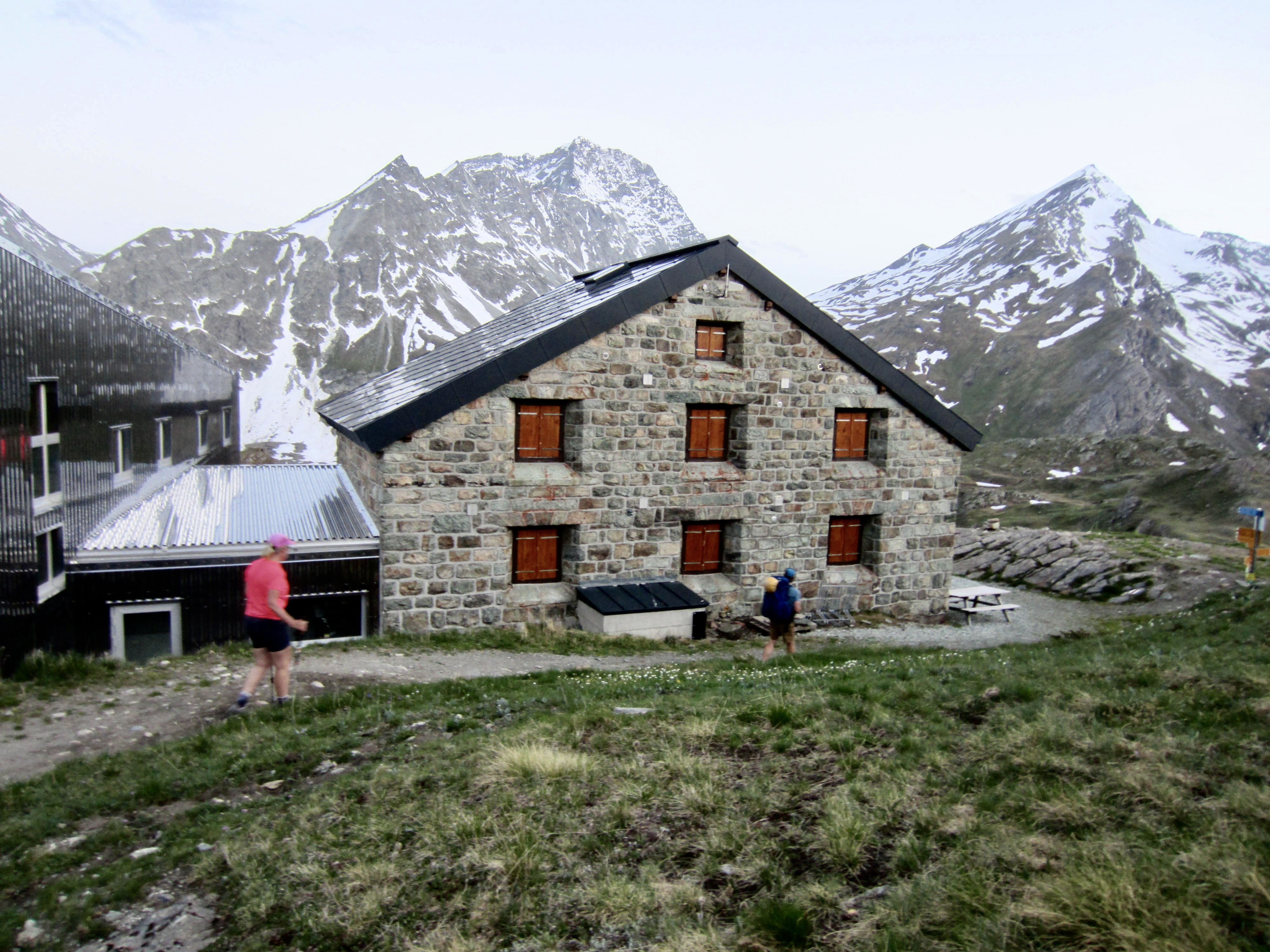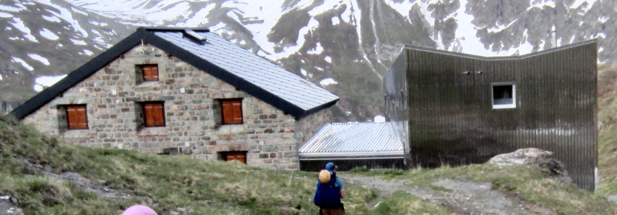 The recent renovation of Chanrion Hut not only included remodeling the historic stone building but also constructing a new steel-sided addition. The great difference in their design and materials creates an interesting—perhaps even bold—architectural contrast. I liked how the two separate building shapes are reflected in the hut’s new logo.
