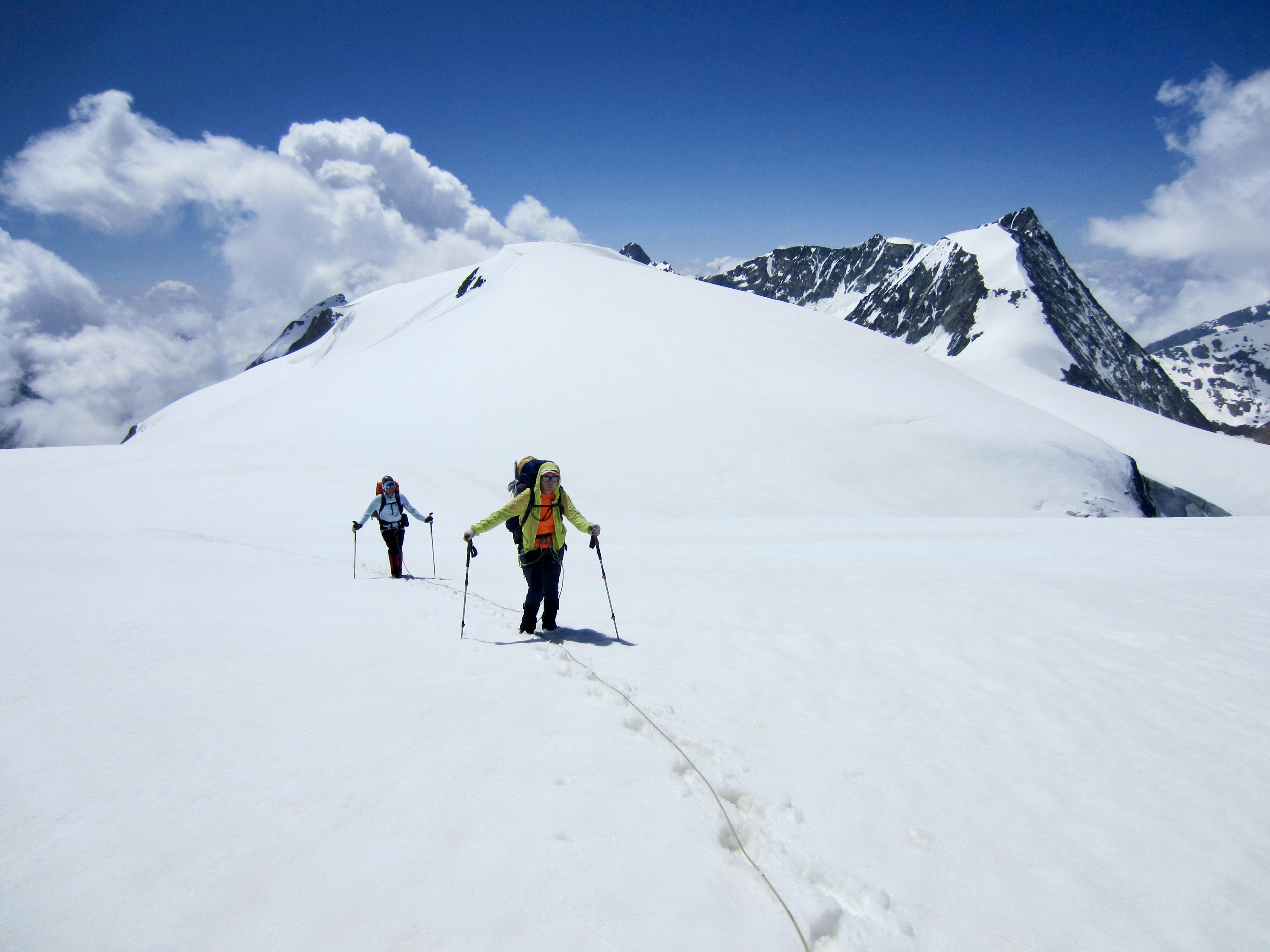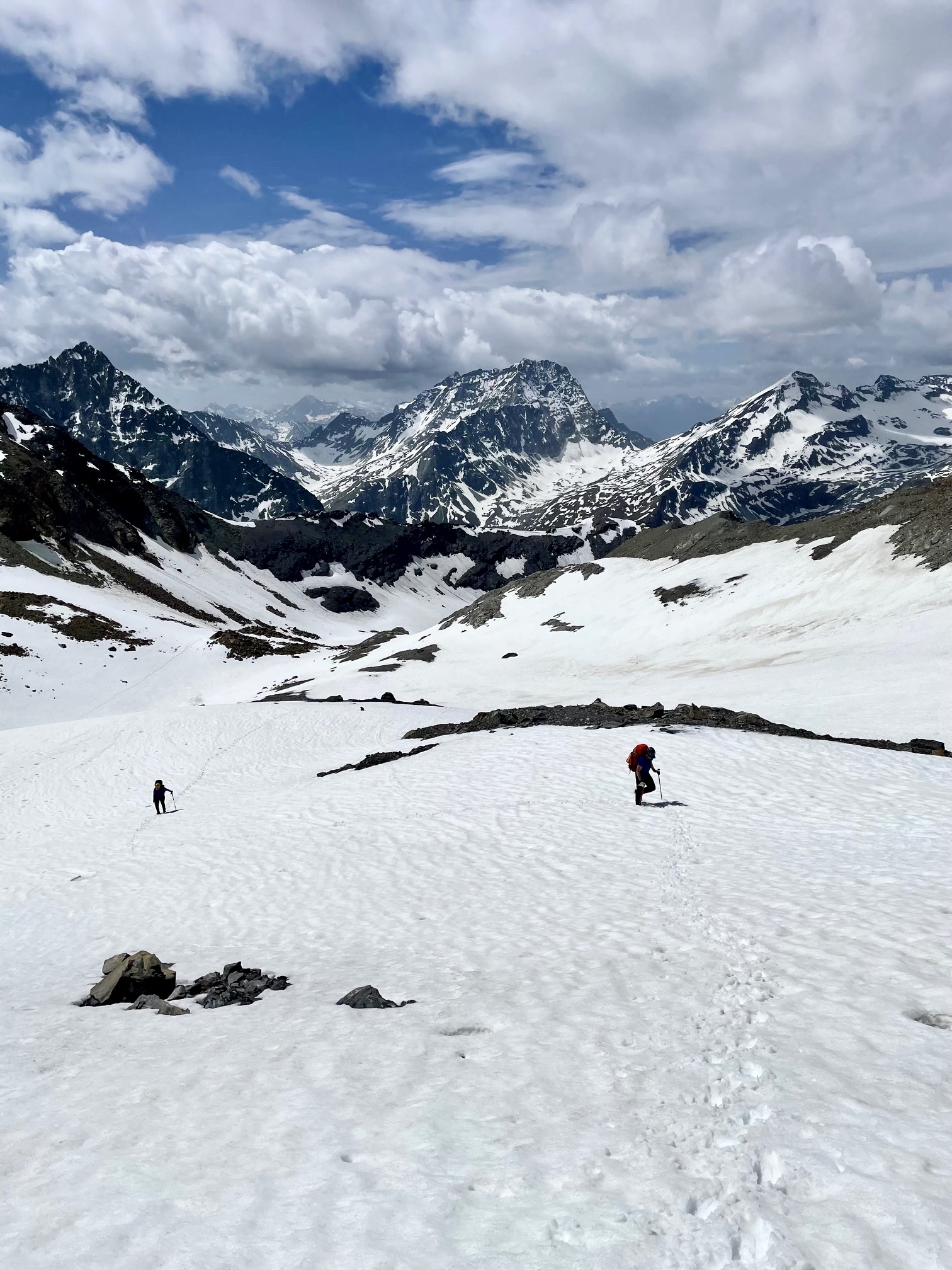 Eileen, Jon, and I scheduled our Haute Route traverse for the middle of June in order to take advantage of ample snowcover, stable weather, and long daylight. For the most part, this early-season strategy worked very well for us. Almost everything above 9,000 feet / 2,700 meters along the traverse was covered by snow, which usually offered easy travel, especially during the morning hours (however, we often experienced post-holing conditions due to afternoon softening). Our weather was generally very stable, with mostly sunny days and only one day of rain.