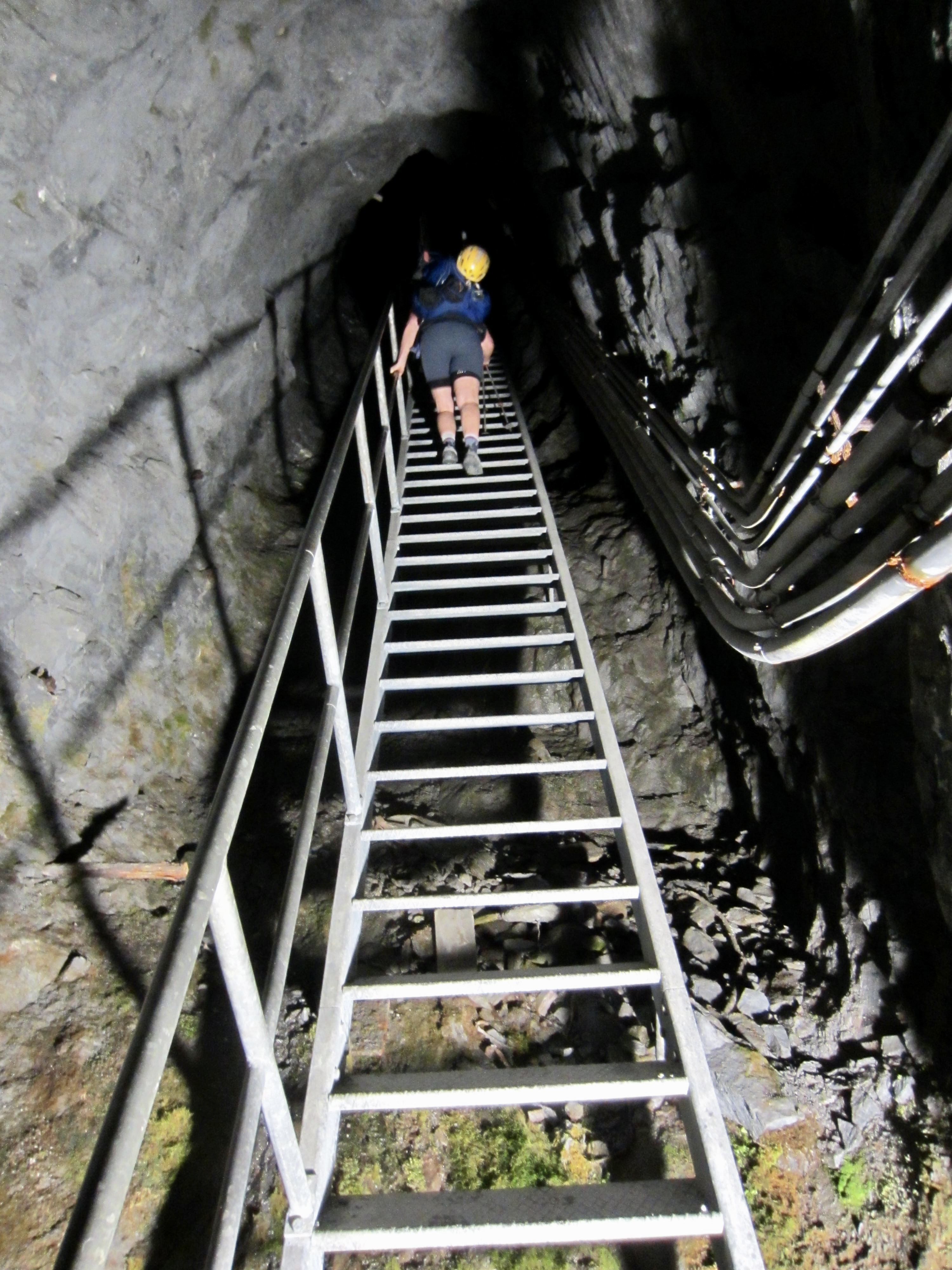 For a full half-hour, we plodded through the tunnel, steadily gaining elevation and occasionally passing side tunnels. This was definitely not a typical approach hike! Then it got even stranger when we came to a long, steep, steel stairway leading into a pitch-black shaft. I pulled out my headlamp and we gingerly headed upward, now feeling uncertain where our route would take us.