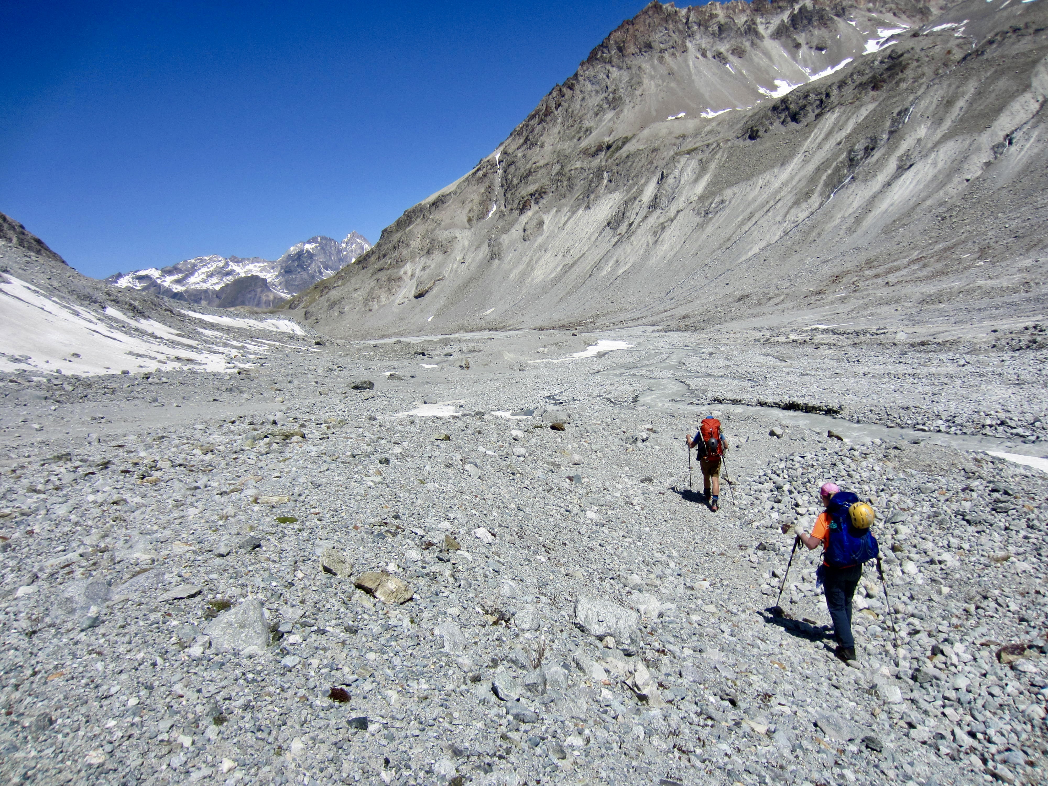 A glacier terminus always presents an uncertain situation with many possible problems. The Haut Arolla Glacier terminus, however, consisted of a low-angle ice shield that easily led onto a broad outwash plain. We picked up a vague path and followed it down the plain.