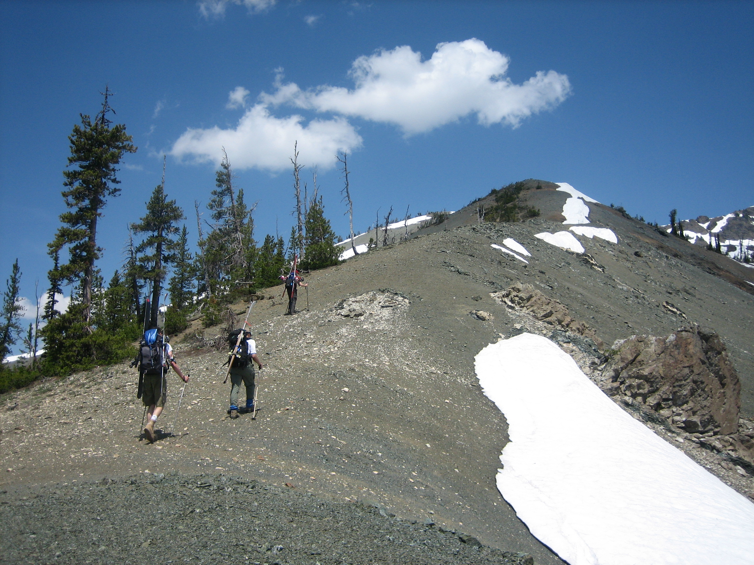Starting at the Boulder DeRoux Trailhead, we hiked almost 2 miles up Trail #1392 toward Gallagher Head Lake, then cut northeasterly cross-country to Point 5202. The heat was stifling on this mostly open hillslope, but we eventually got onto the mountain’s curving south ridge (“South Hawkins Arm”) with a welcome breeze.