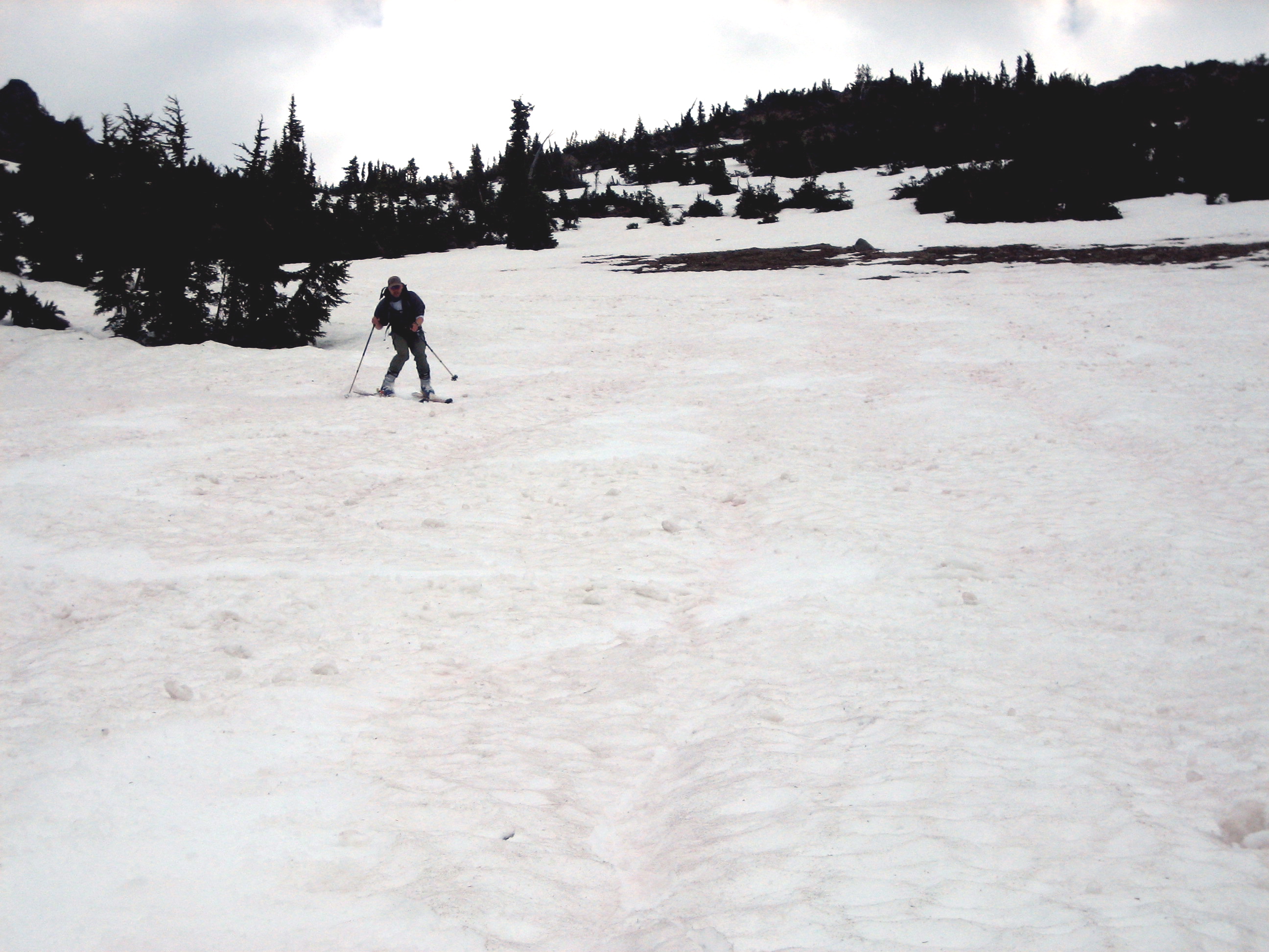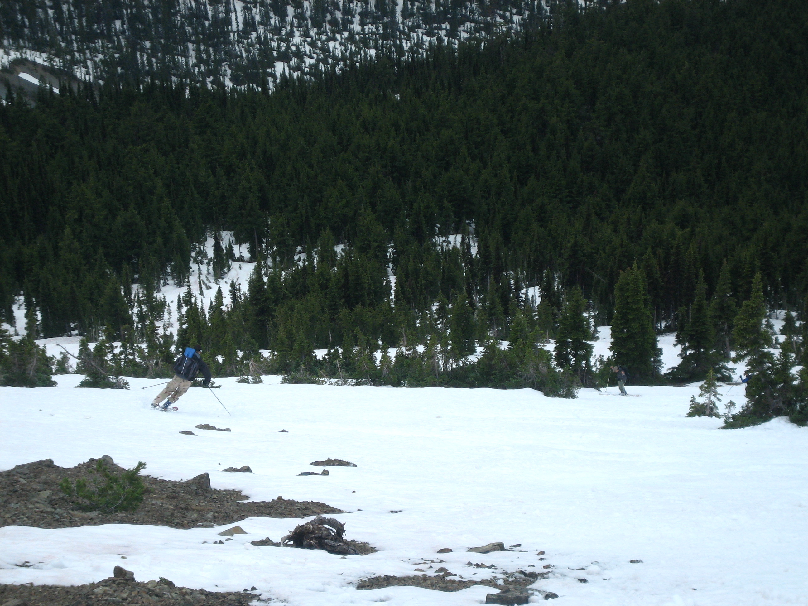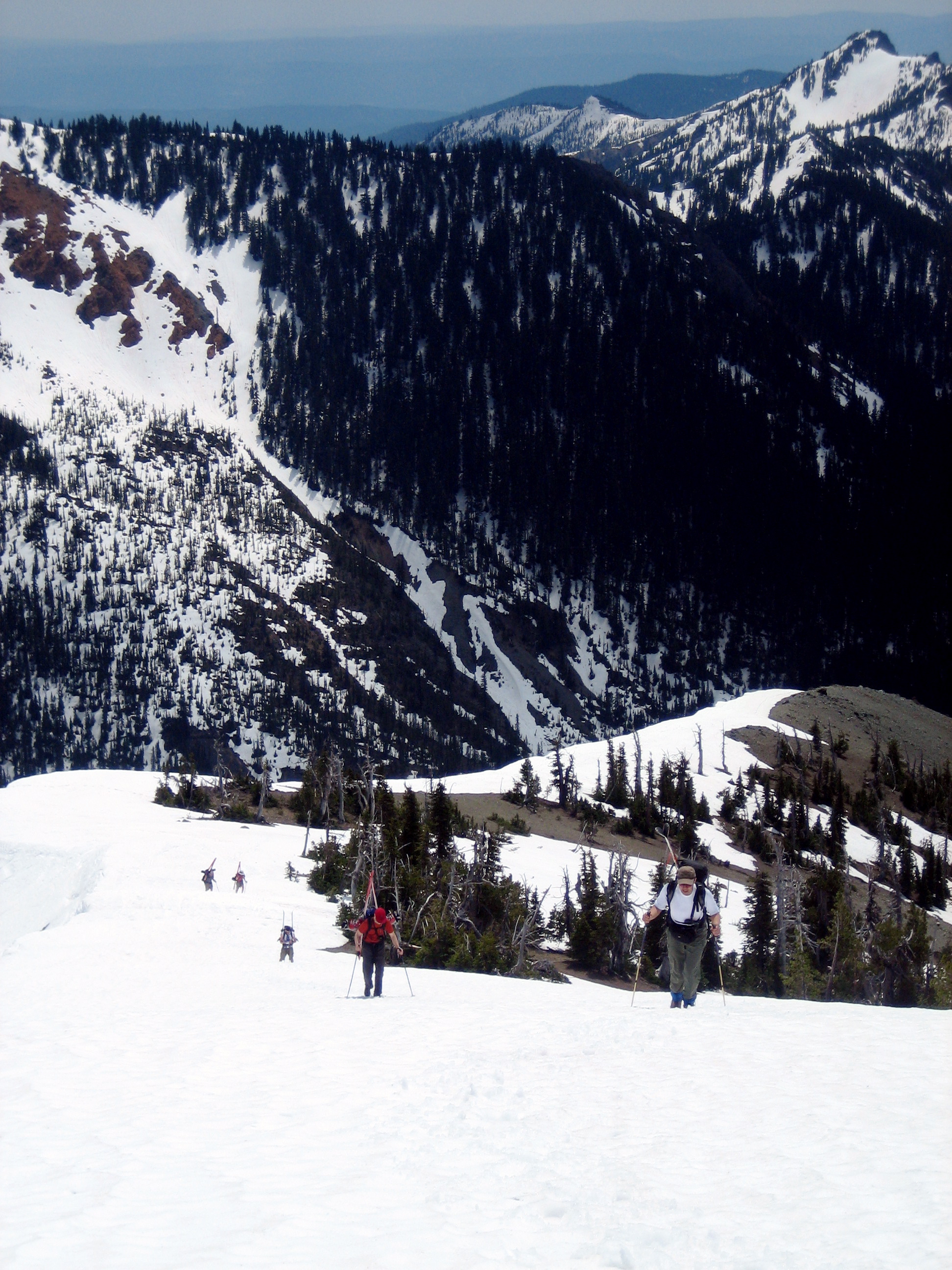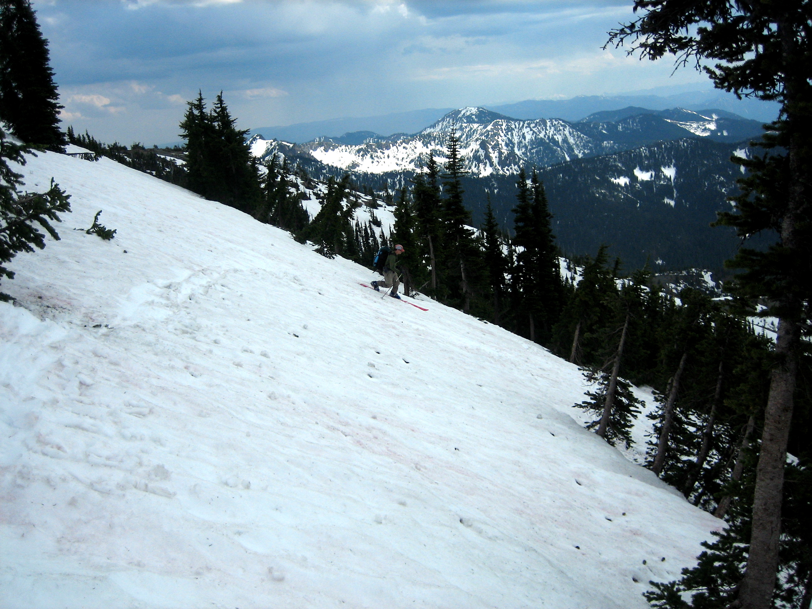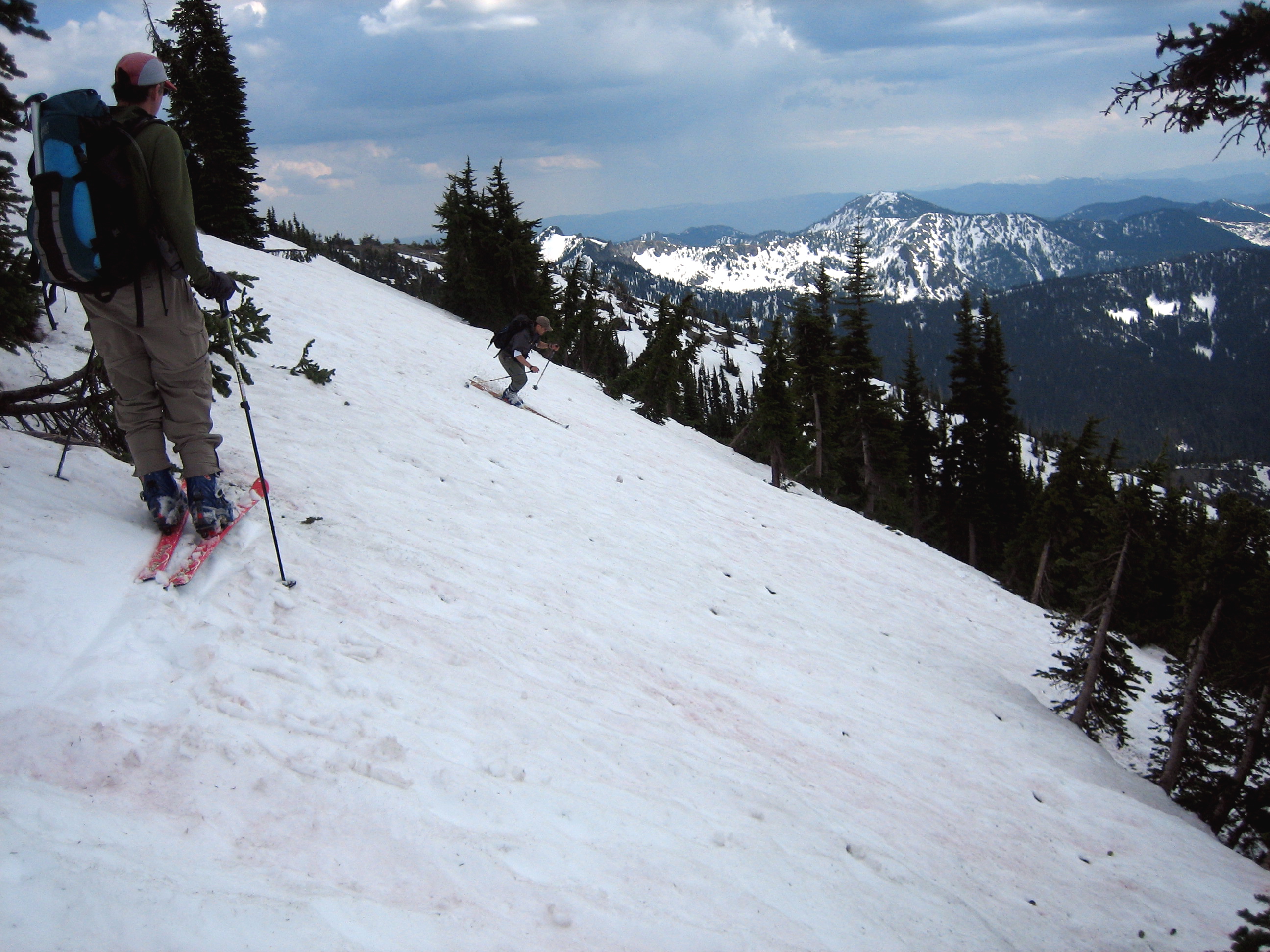 For our descent, we donned skis just below the summit ridge and headed straight down the southwest slope for 700 feet. When trees closed in, we traversed over to the southwest ridge (“Southwest Hawkins Arm”) and skied a snow ribbon down to 5500 feet.