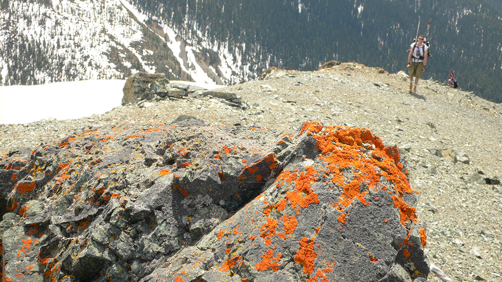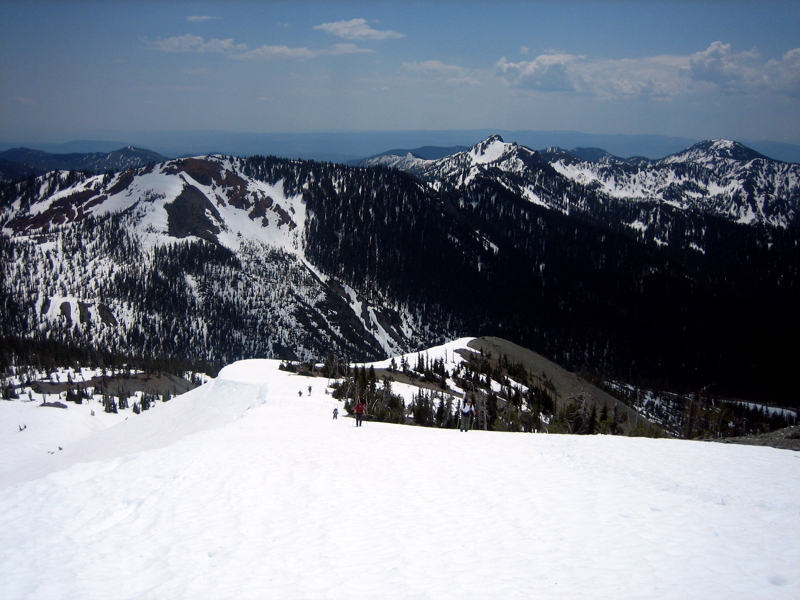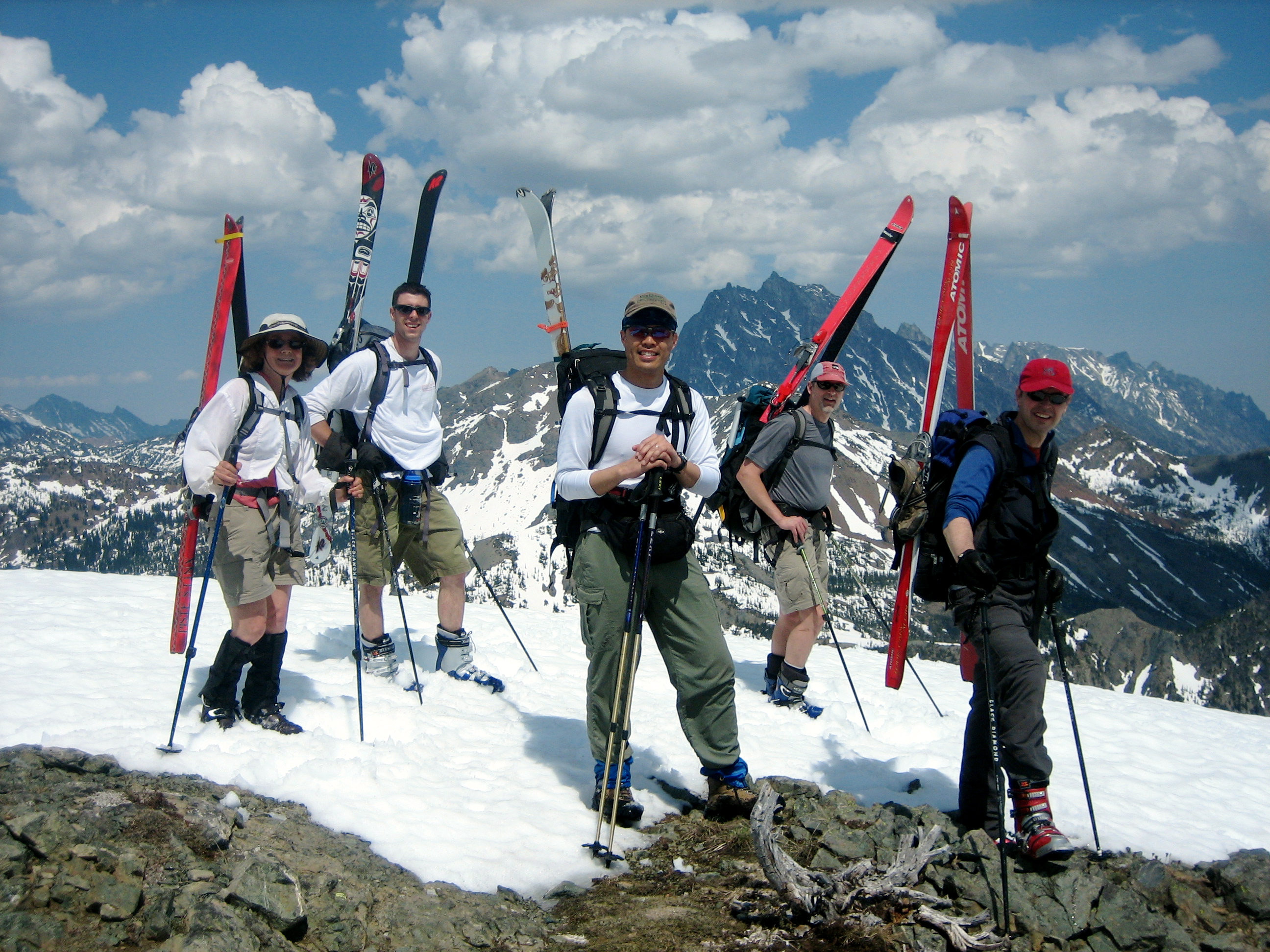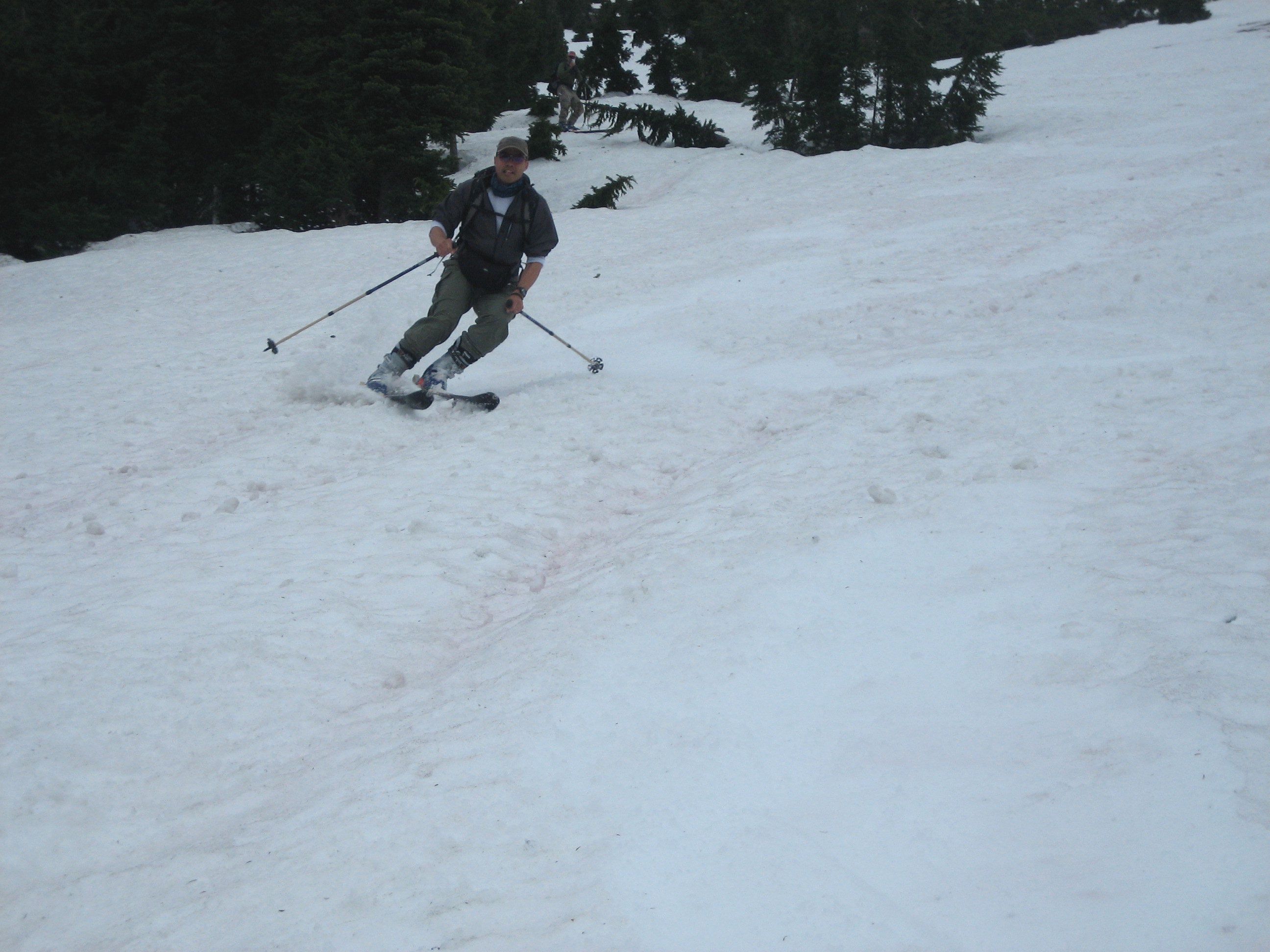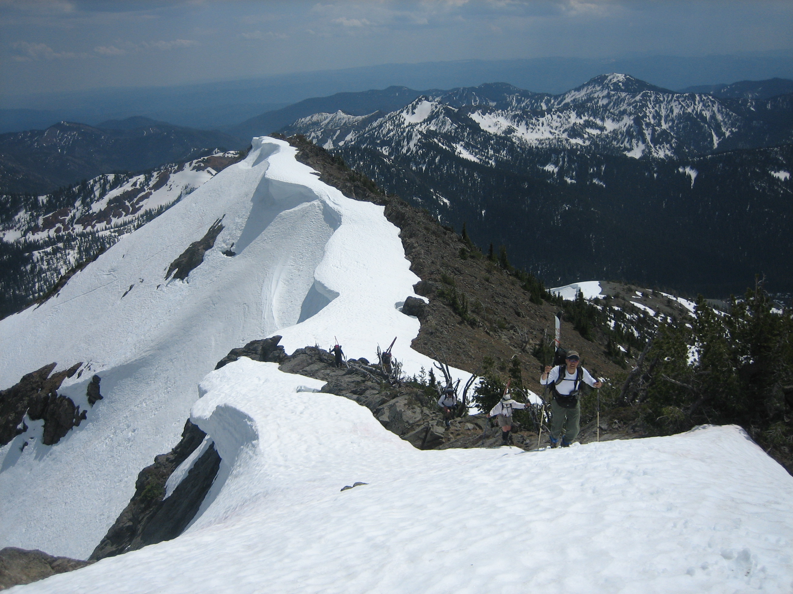 For our descent, we donned skis just below the summit ridge and headed straight down the southwest slope for 700 feet. When trees closed in, we traversed over to the southwest ridge (“Southwest Hawkins Arm”) and skied a snow ribbon down to 5500 feet.