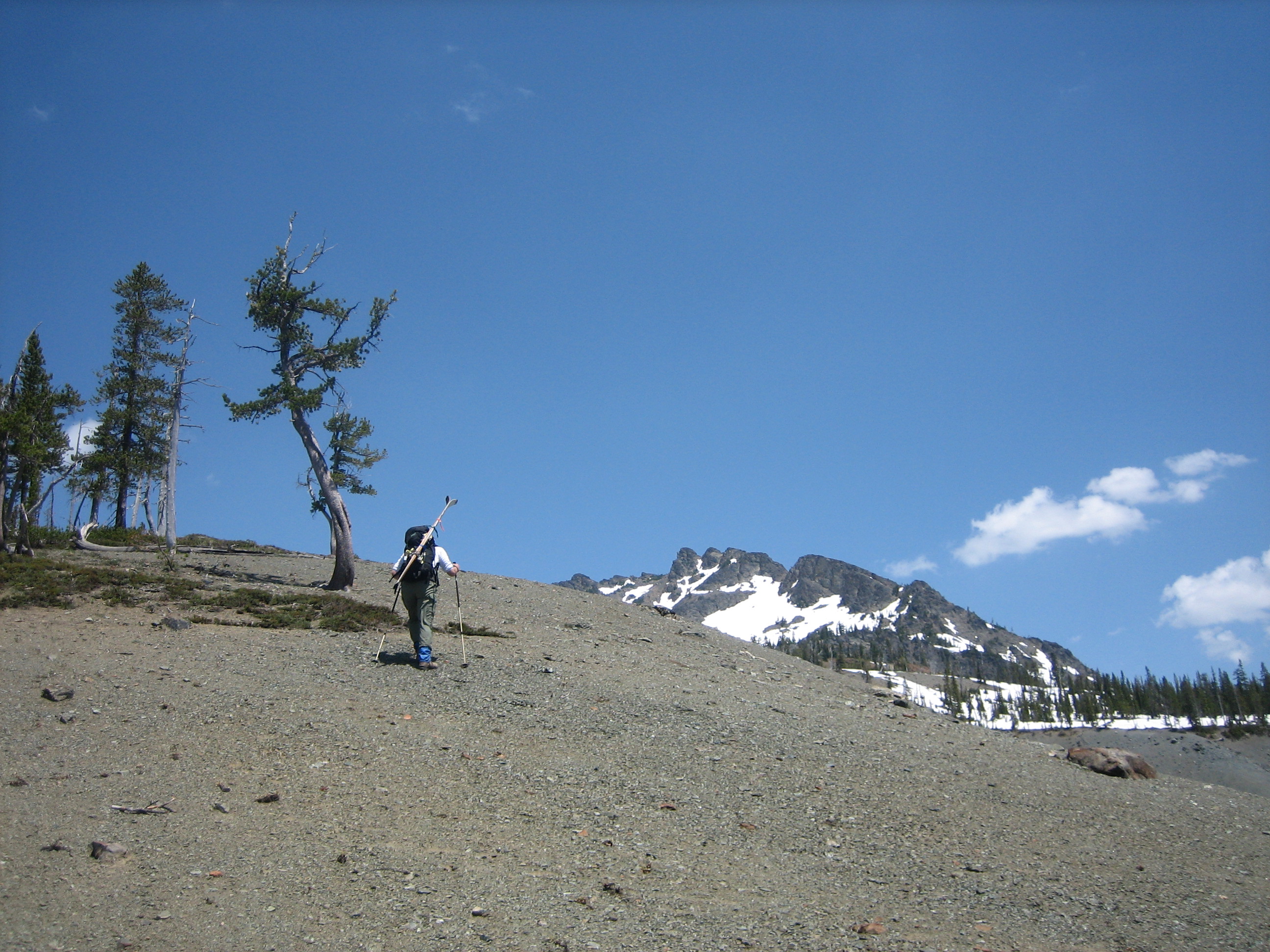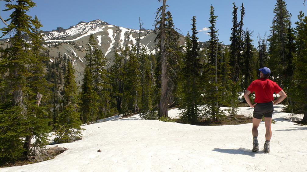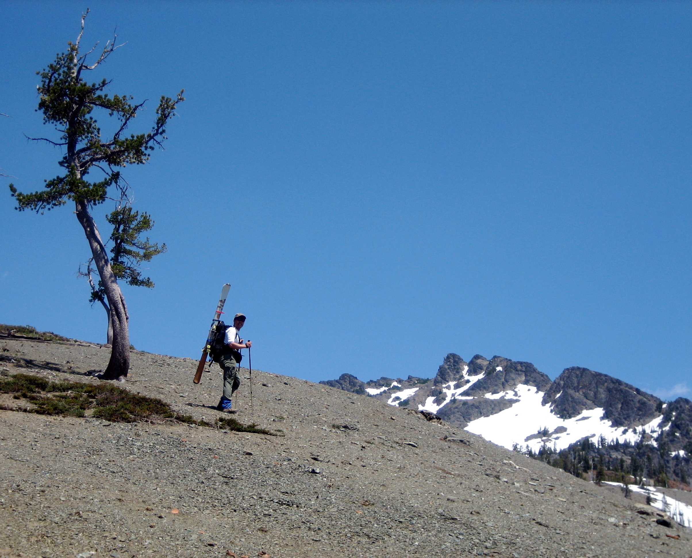 From snow’s end, it was a westerly boot plunge to the trail in broiling late-afternoon sun, thereby closing our loop, followed by an easy mile of hiking back to the trailhead (2.5 hours down). All in all, this was the kind of trip only a dedicated ski-mountaineer could love—and we did!