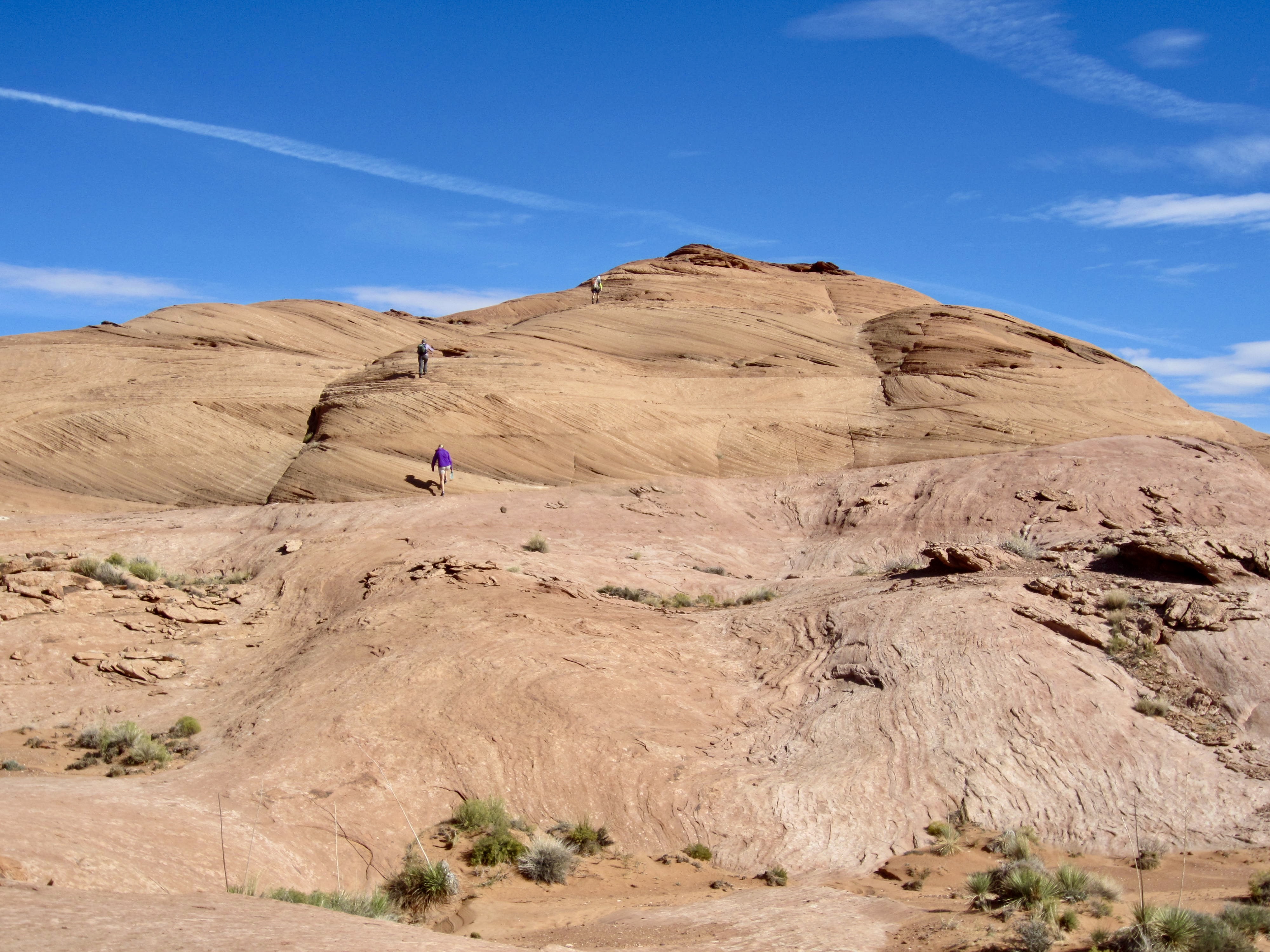 Eileen, Steve, Deb, and I began our exploration by hiking and scrambling out to a rocky viewpoint overlooking Lake Powell. Like many man-made reservoirs, this one has a complex shoreline with innumerable bays, inlets, peninsulas, and islands. Several houseboats were visible as tiny specks on the water surface below.