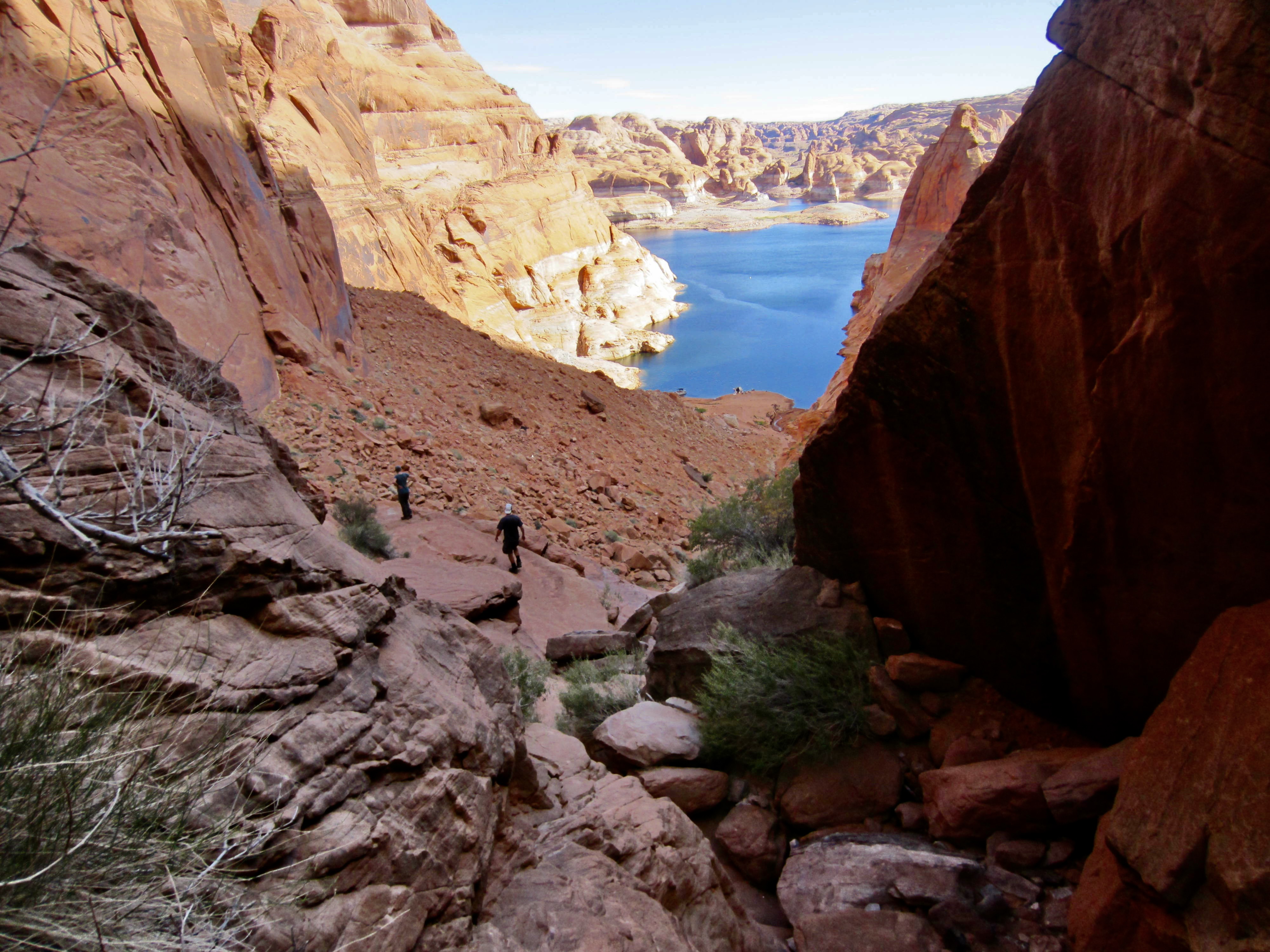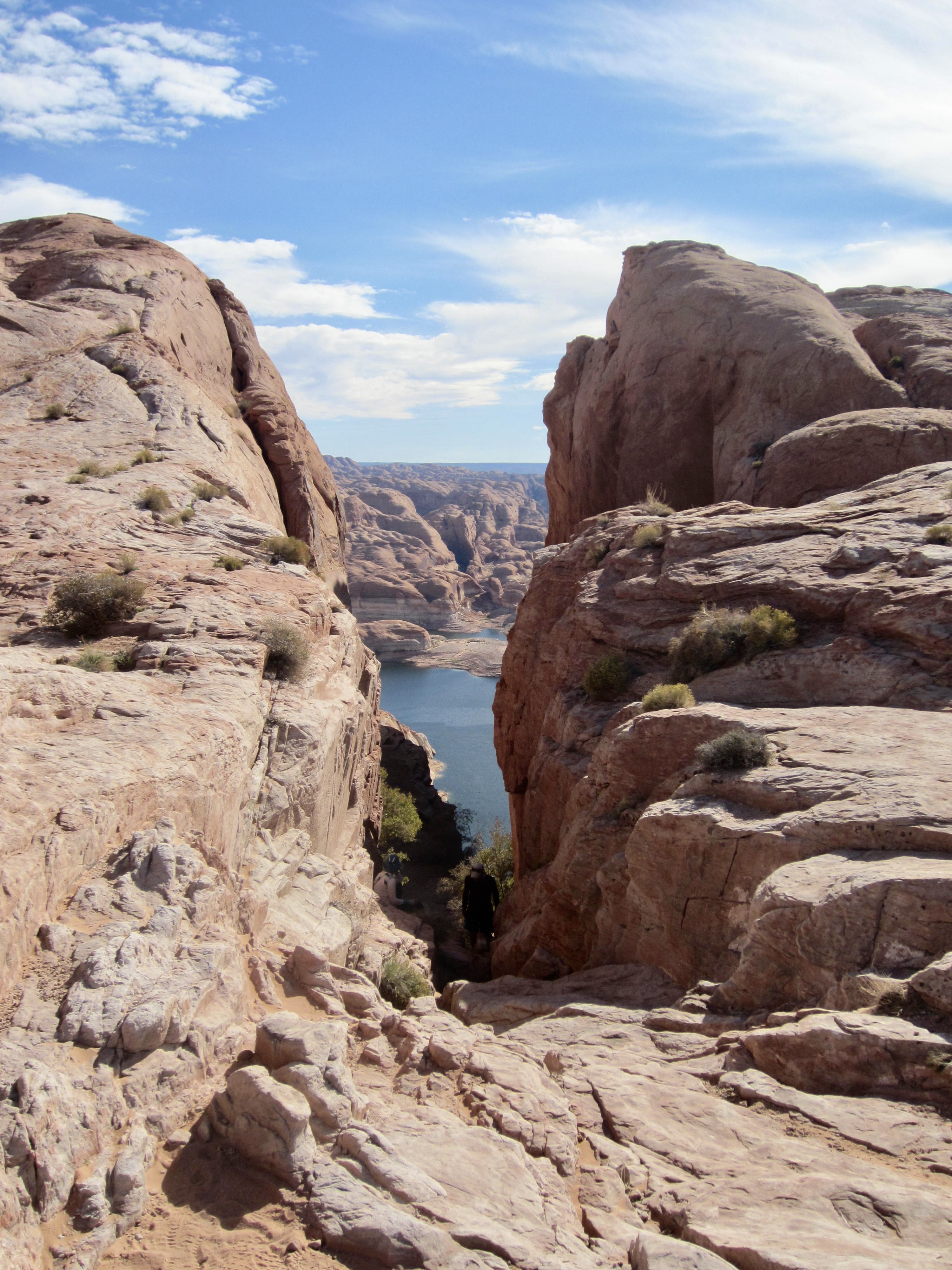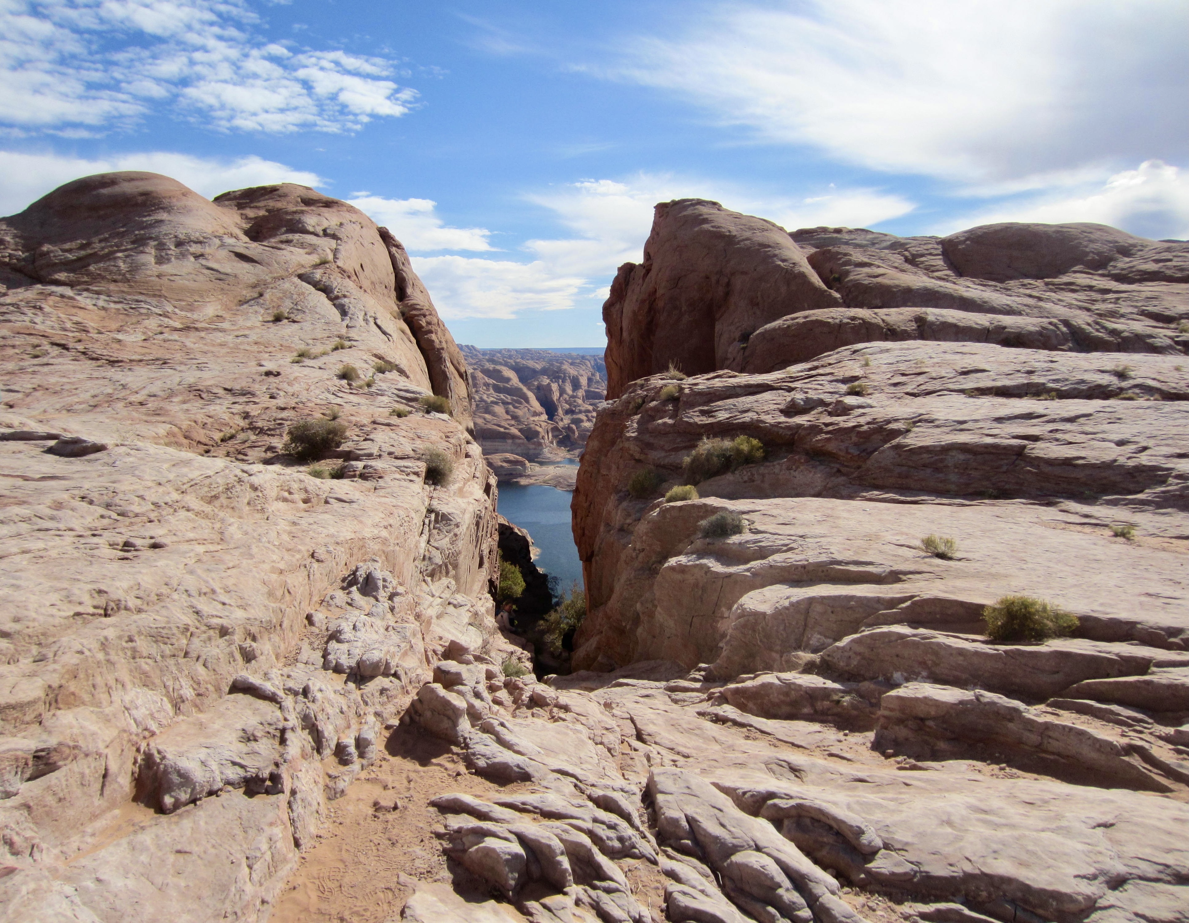 From the trailhead, Hole-in-the-Rock can be seen as a narrow cleft in a low sandstone ridge about 100 yards away. A brass benchmark bearing an elevation of 4329 feet is embedded in the rock on the right side of this cleft, and a commemorative plague is mounted on the left side. The rock walls are etched with the names of some of the early pioneers. We peered through the cleft and saw a steep canyon leading down to the shimmering blue water of Lake Powell far below. By chance, another group of four explorers was just scrambling up through the cleft, having accessed the canyon bottom via kayak.