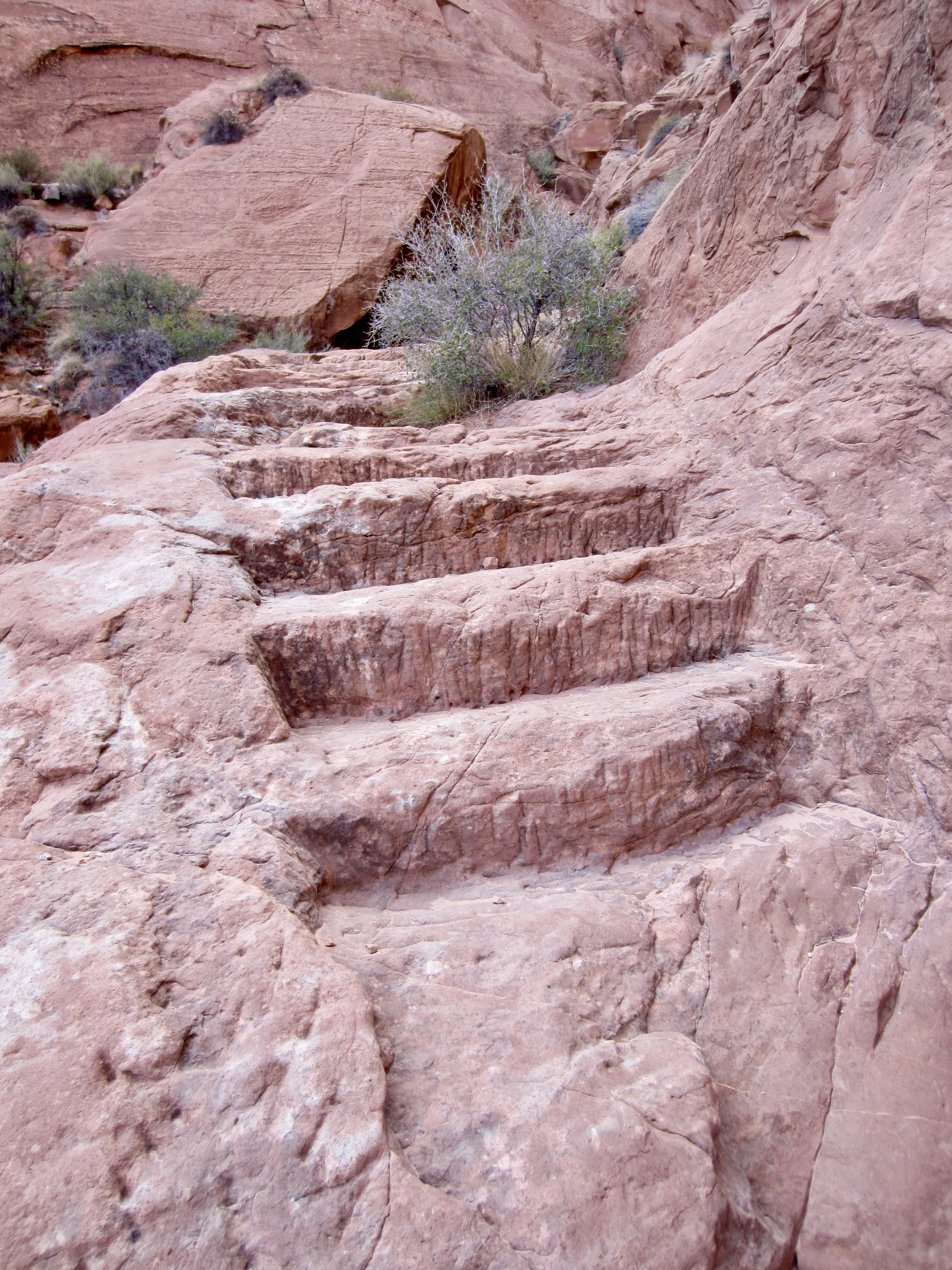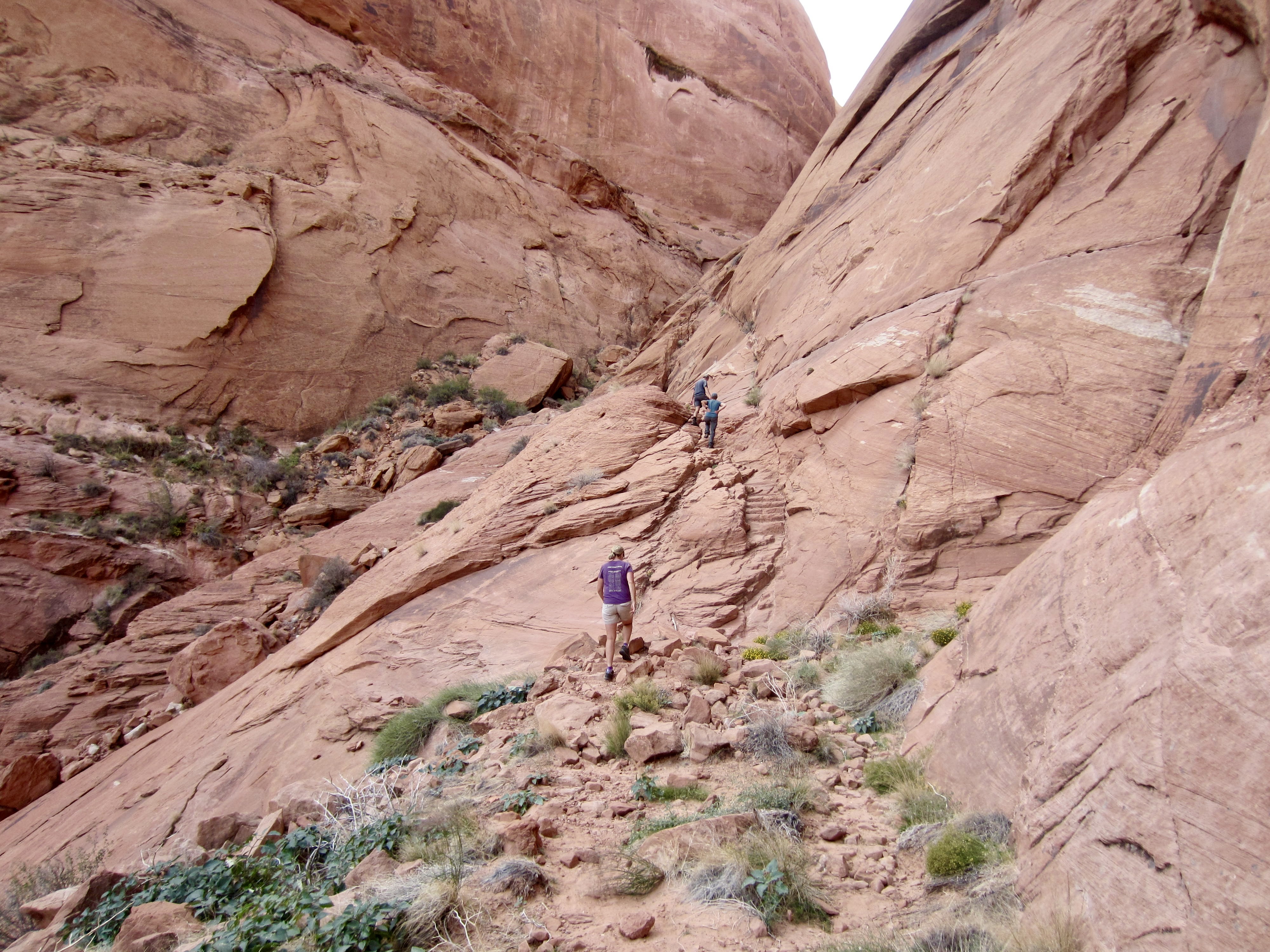 About halfway down, the canyon opened up and eased back considerably, transitioning to a moderately steep talus-and-scree slope. We were happy to find crude trail switch-backing down the slope, along with many steps carved into zones of solid rock. These steps were quite puzzling; we had read that the Mormon pioneers did a lot of blasting to gain passage, but it seemed unlikely that they would devote such detailed labor to a temporary route. Mystery solved: we later learned that prospectors and miners came through here in the early 1900s and improved the Mormon trail.