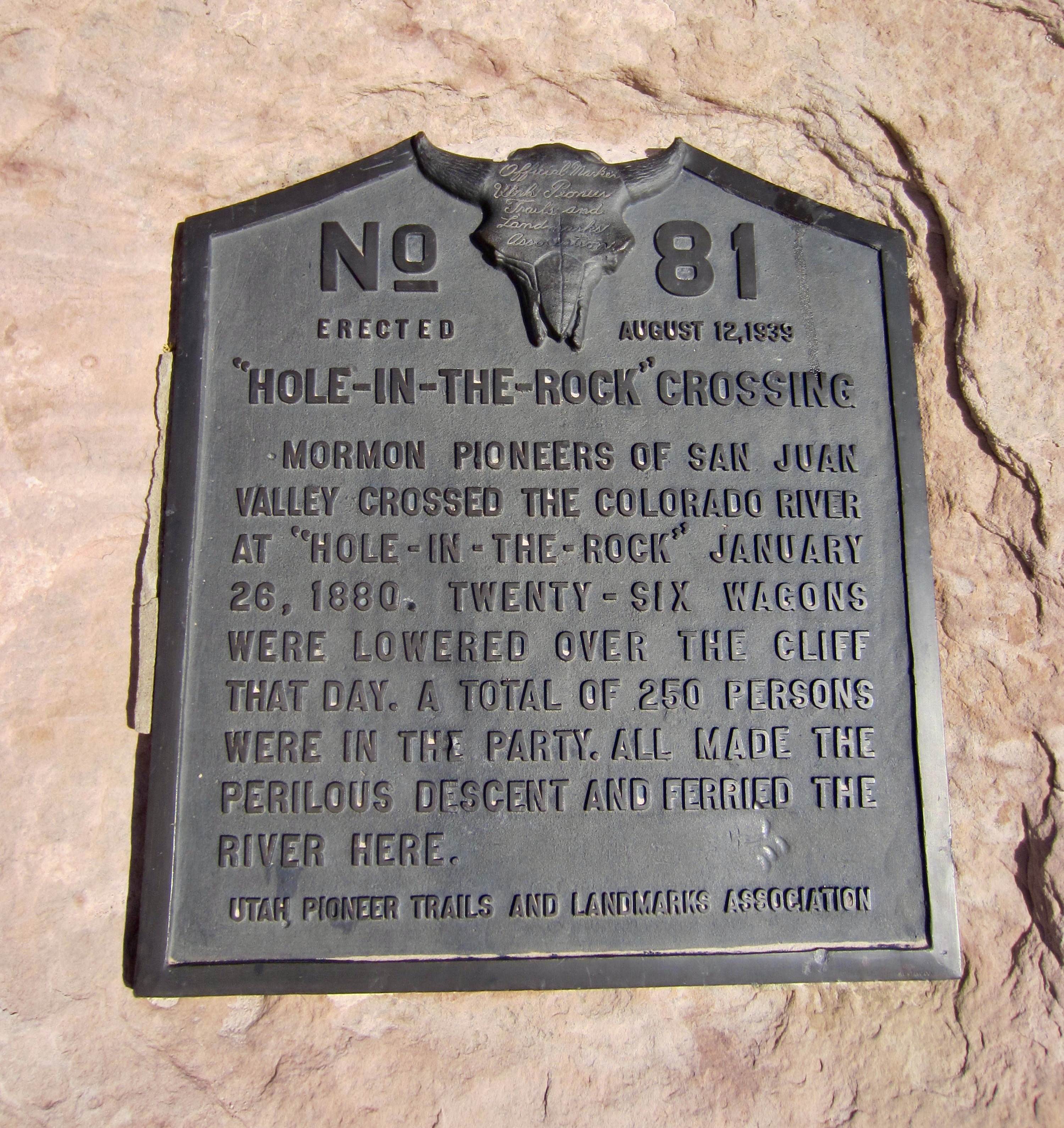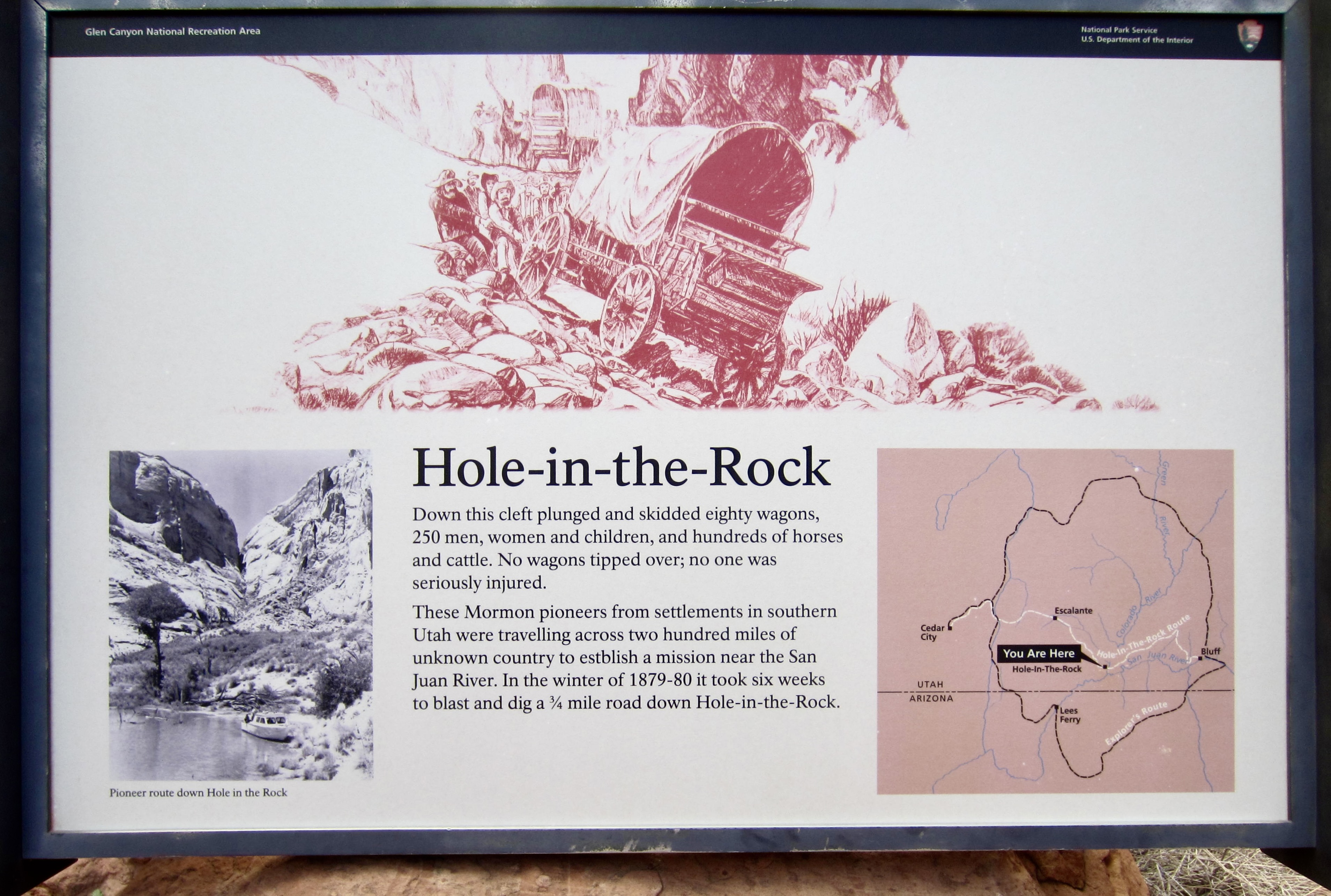 Hole-in-the-Rock is historically important because it served as a key access route for Mormon pioneers traveling eastward across southern Utah during the winter of 1879-80. At that time—long before the construction of Glen Canyon Dam and subsequent formation of Lake Powell—it appeared to be the best place to cross the Colorado River. In a display of great determination, the pioneers reportedly spent six weeks blasting rock and preparing the canyon for passage, and when done, they lowered dozens of wagons, 250 people, and hundreds of stock animals down to the river, then floated across on a ferry.