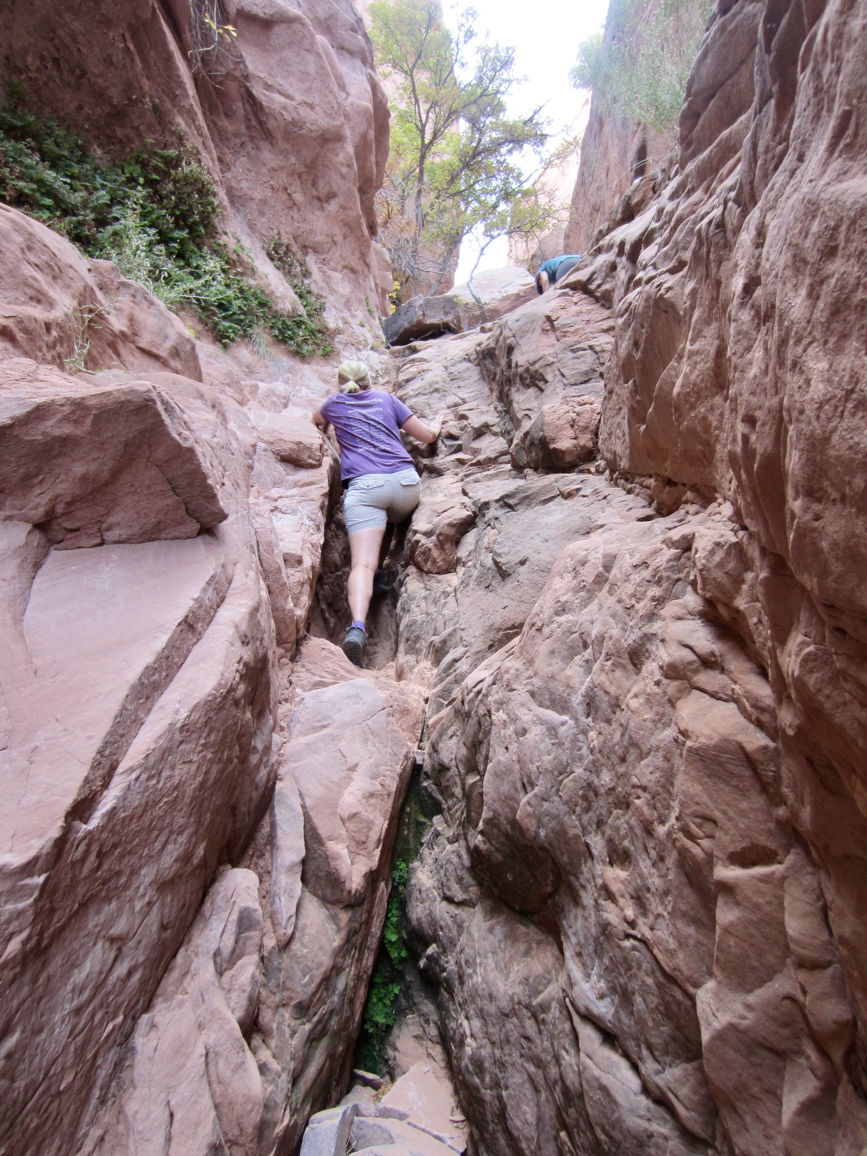 After returning to the Hole-in-the-Wall benchmark, we dropped into the narrow canyon and began carefully scrambling downward. The sandstone is generally quite solid, and the scrambling was very enjoyable, with continual Class 3 moves. The crux is a near-vertical 10-foot step in a narrow slot, where a short rope would likely be appreciated by many explorers.