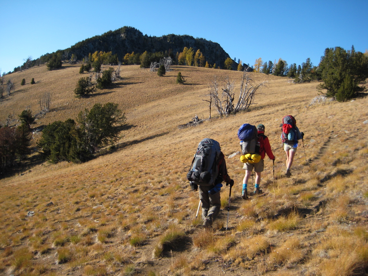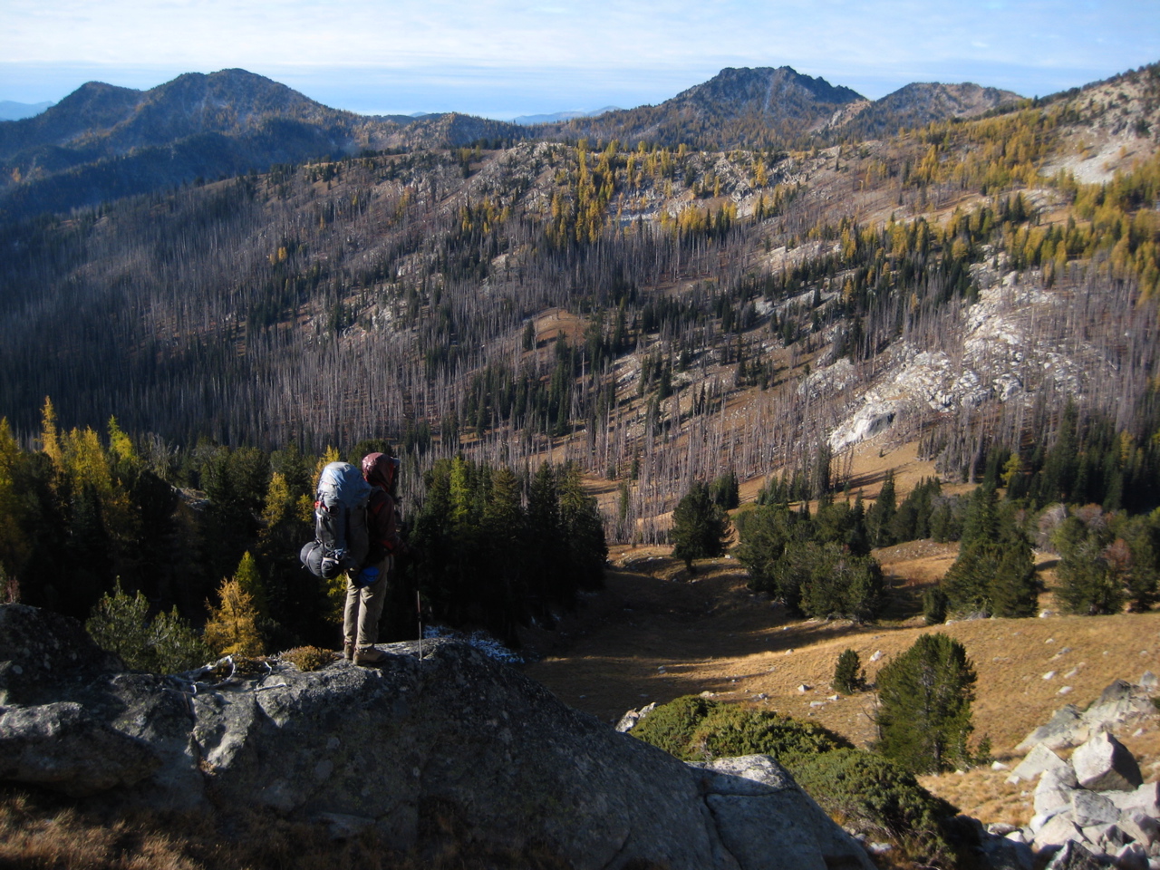 In search of more golden larches, I did a delightful backpacking loop in the southern Sawtooth Mountains last weekend with Eileen, Jim A, and Fay. I had always been put off by the prospect of a long approach drive on a bad road, but Charlie Hickenbottom recently reported that the Grade Creek Road is in good condition. We found the road to indeed be long but very driveable.