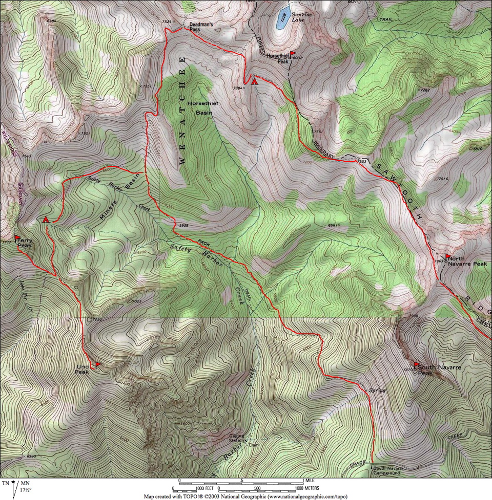 Way Points: Navarre Pass & Sawtooth Ridge & Little Horsethief Basin & Horsethief Basin & Deadmans Pass & Miners Basin & Upper Miners Basin & Safety Harbor Creek (trail hike)