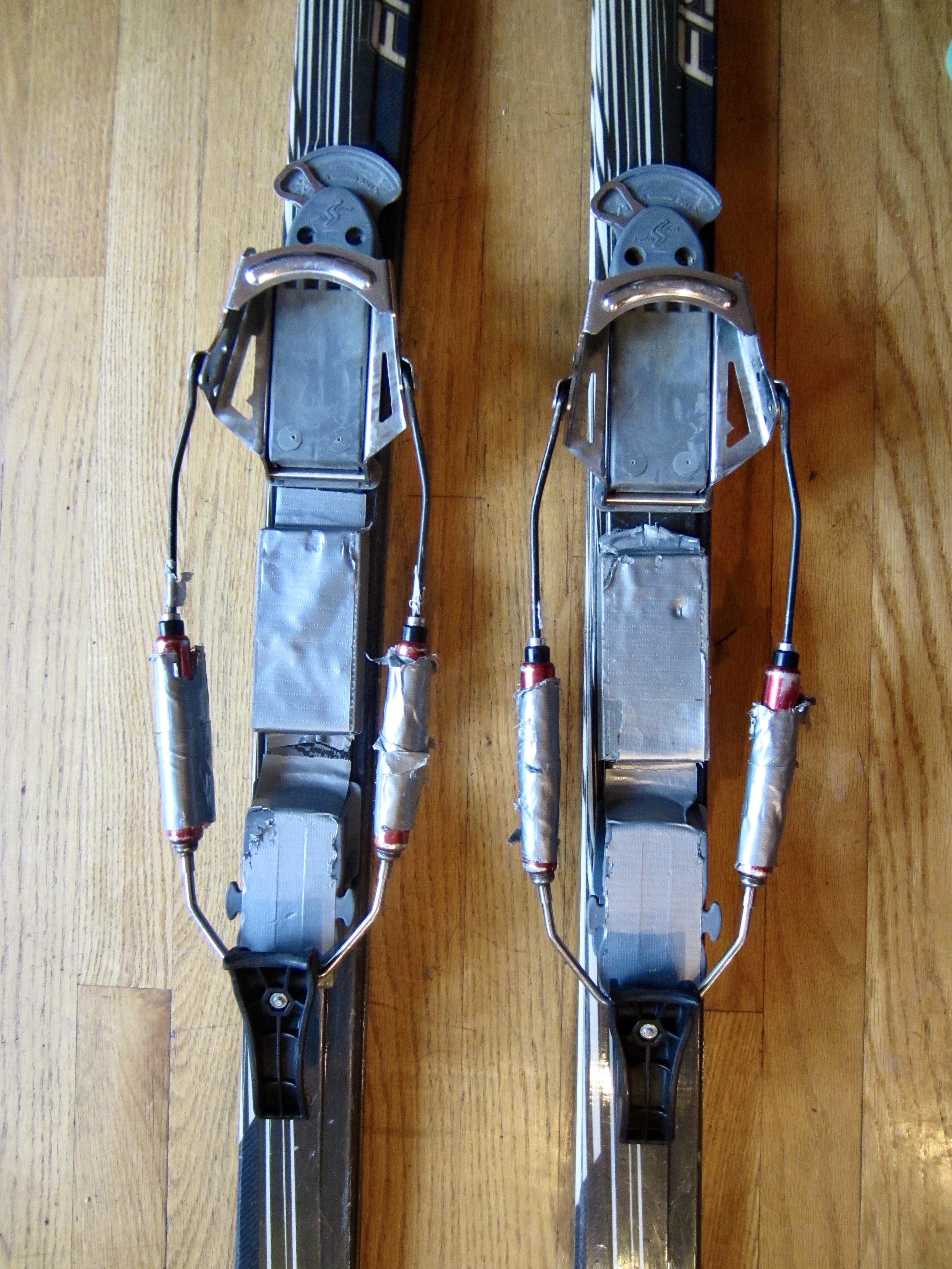A simple fix for this very irritating problem is to install some sort of shim underneath the mid-boot area of each ski, as pictured below. I use a Voile plastic riser plate for this purpose, but it would be equally effective to screw or glue a small block of wood onto the ski. In either case, it is helpful to cover the shim with slippery duct tape to reduce snow buildup.