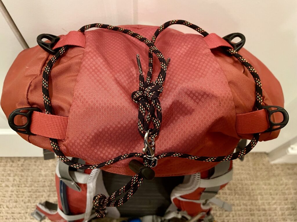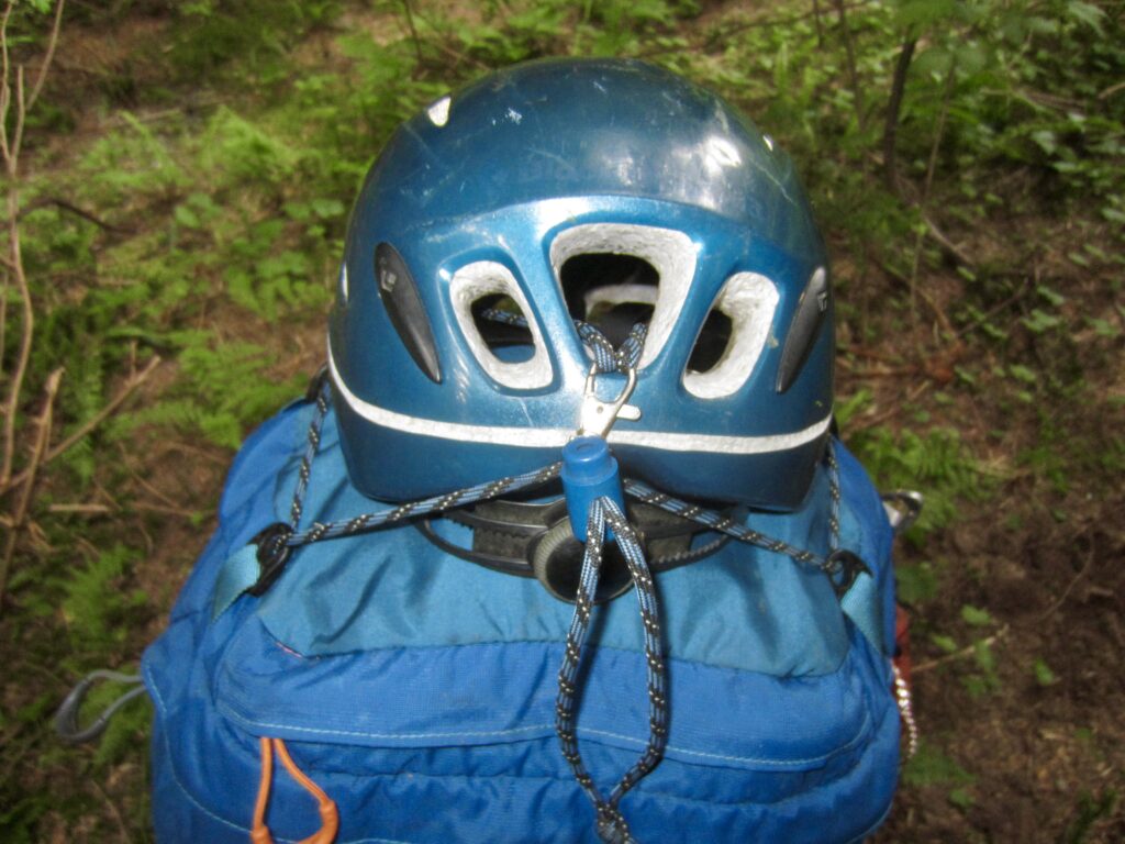 Some technical climbing packs are equipped with a dedicated attachment system for helmets. This might consist of a small elastic “helmet hammock” or a special arrangement of straps. However, most multi-purpose rucksacks and backpacks—and even many climbing packs—do not come with any specific means of attaching a helmet. After years of trying different ways to attach my climbing helmet, I devised a very simple and inexpensive system suitable for any pack that is equipped with attachment loops on the top lid and for any helmet that has ventilation holes.