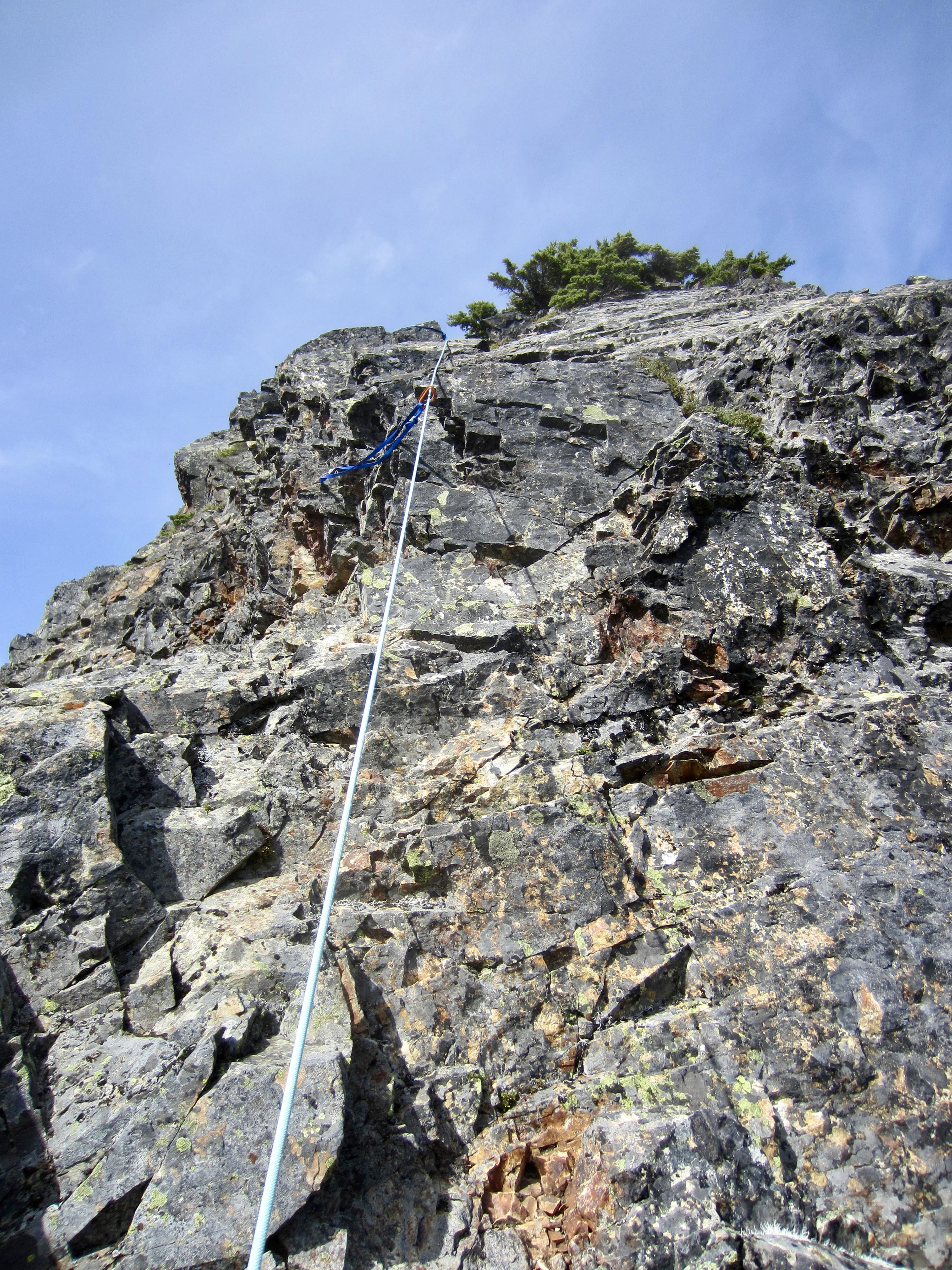 For protection on the east ridge and on the summit block, we used our standard “alpine half-rack,” which comprises five stoppers (even-numbered pieces ranging from #2 to #10) and two small cams (#0.5 and #0.75). We also used six runners (three singles and three doubles) for slinging horns and extending pro. Although fairly spartan, we found this collection to be adequate.
