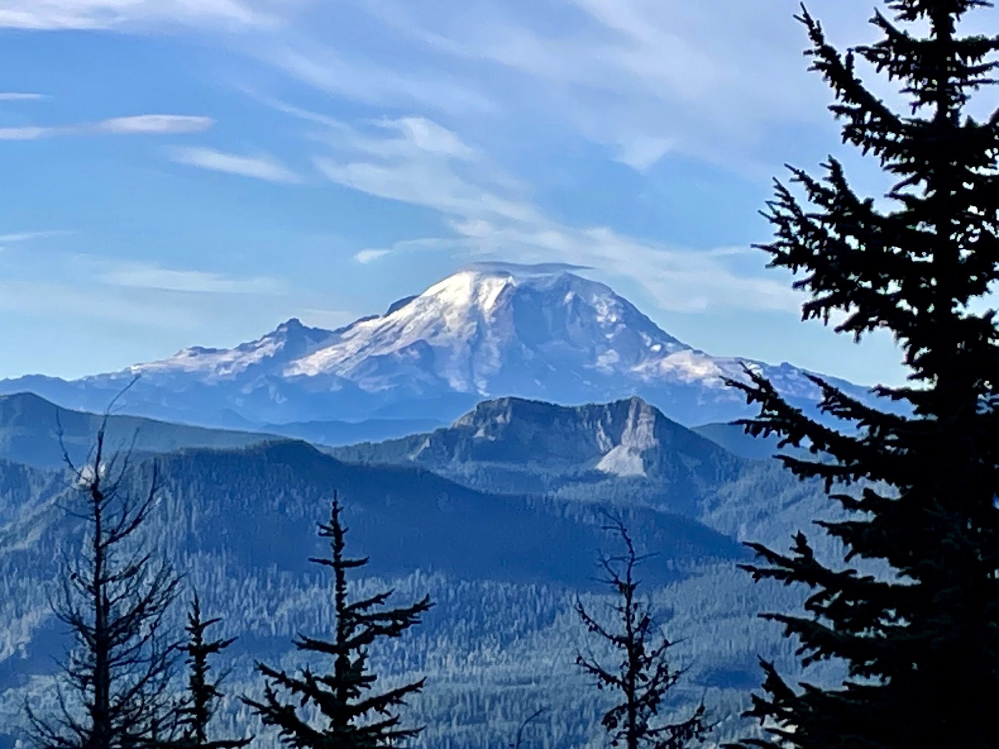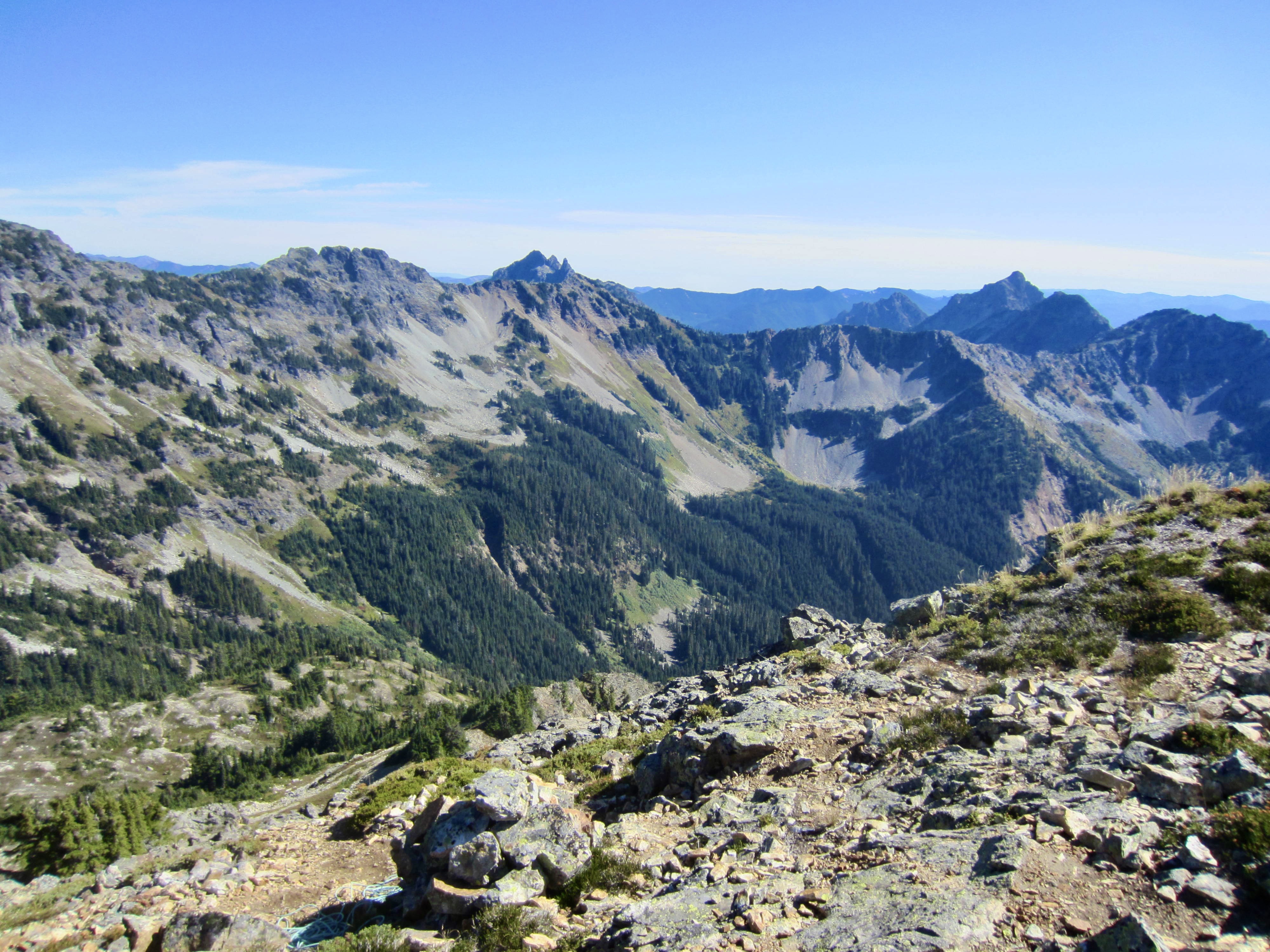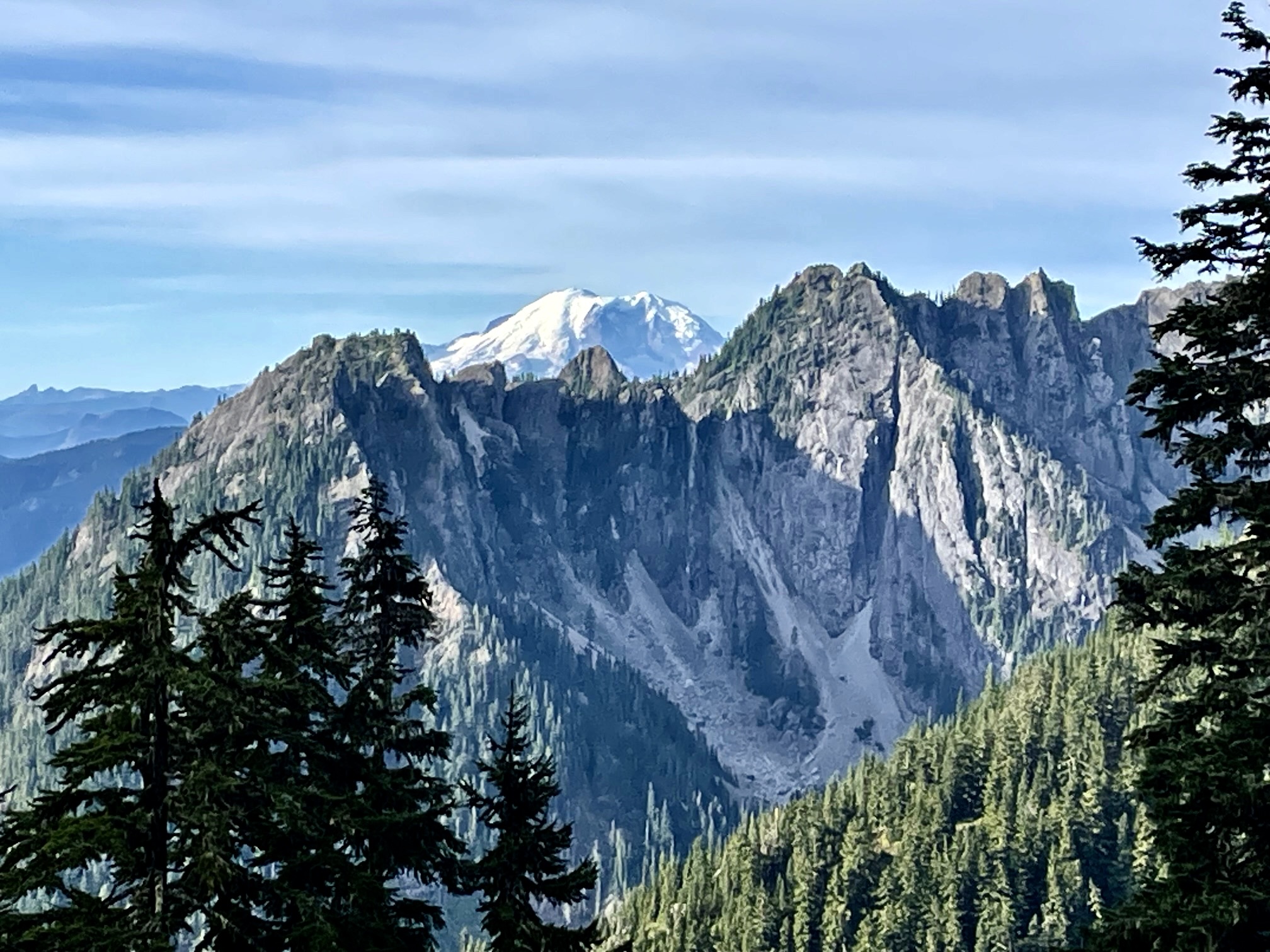 Visibility was excellent, so we could gander at many other peaks in the rugged Snoqualmie Range. These included Chimney Rock, Lemah Mountain, Chikamin Peak, Mt. Thomson, and Chair Peak. Far to the south was a gleaming-white Mt. Rainier, and far to the north was a somber-gray Glacier Peak.