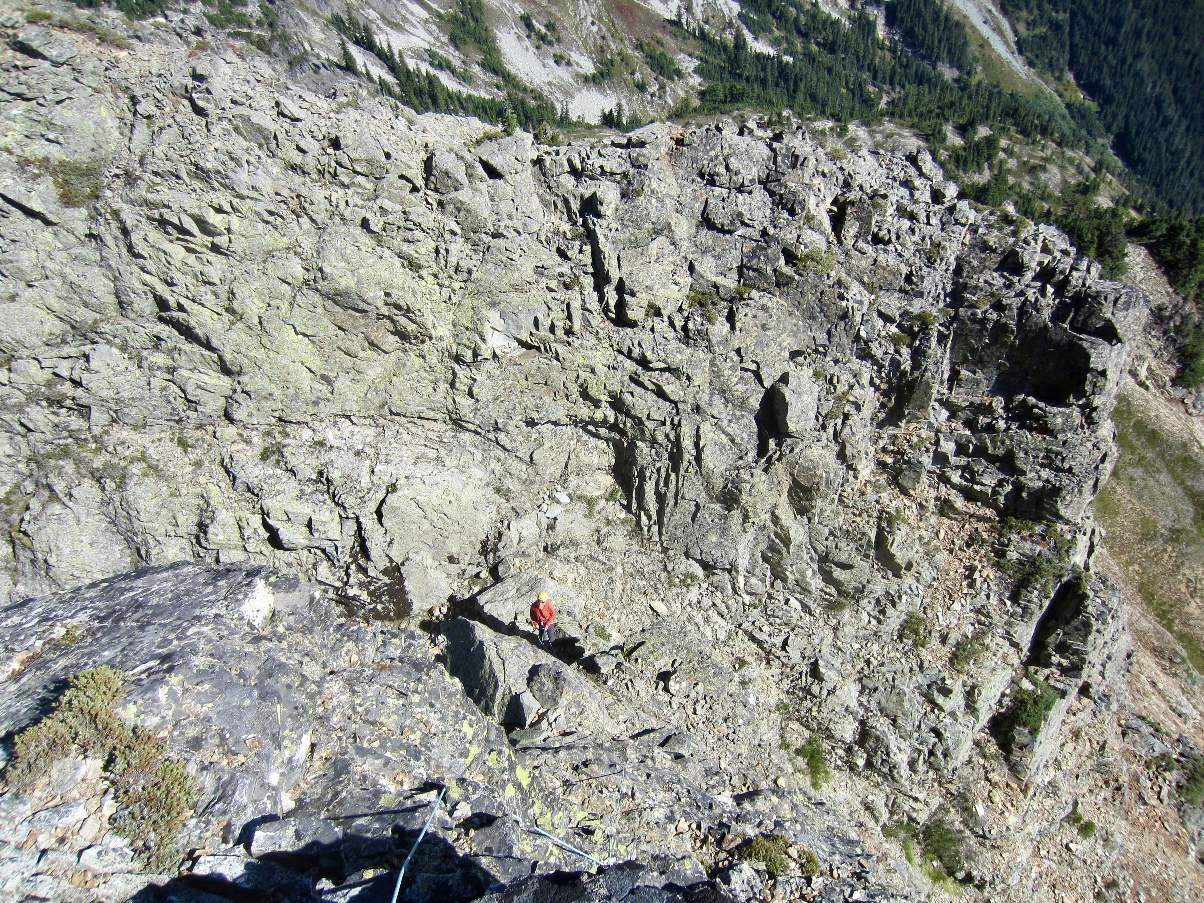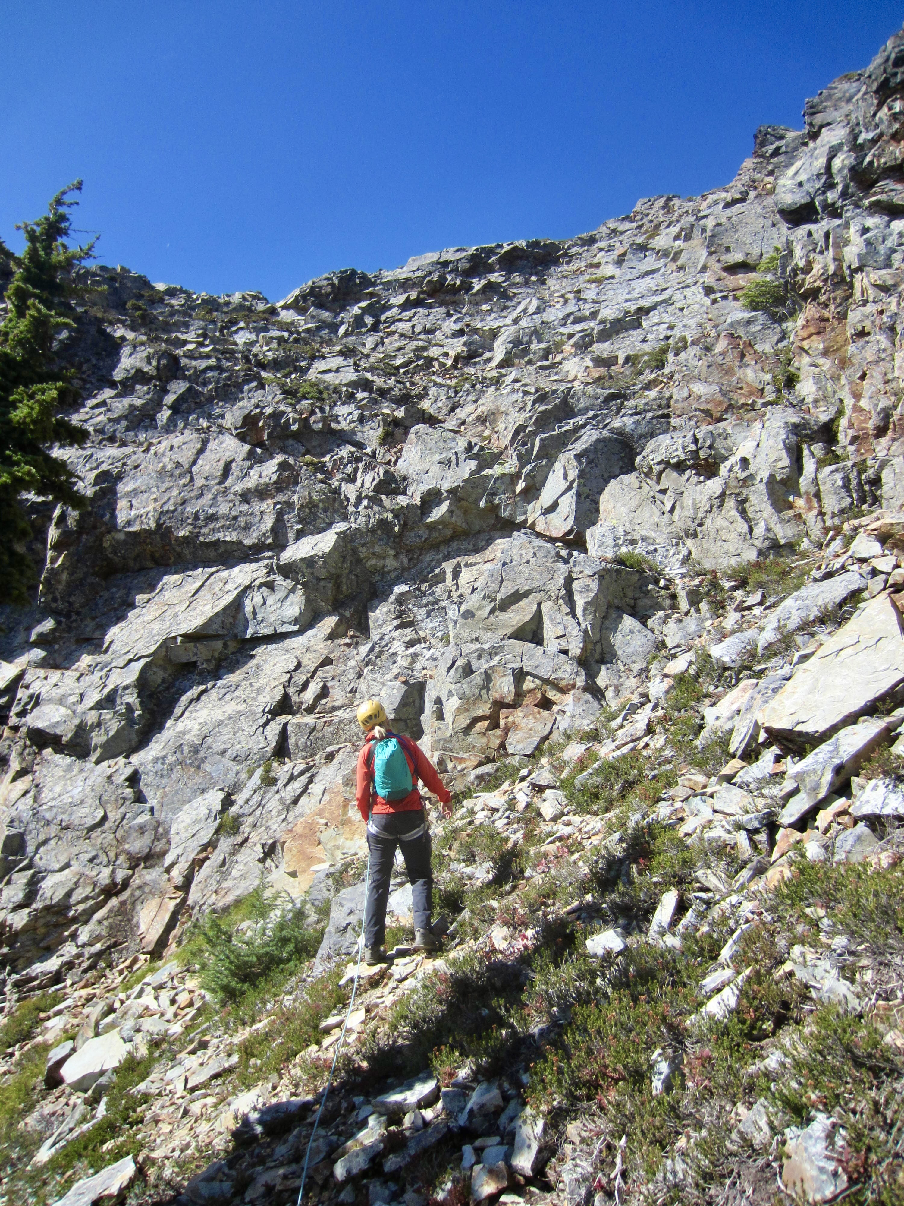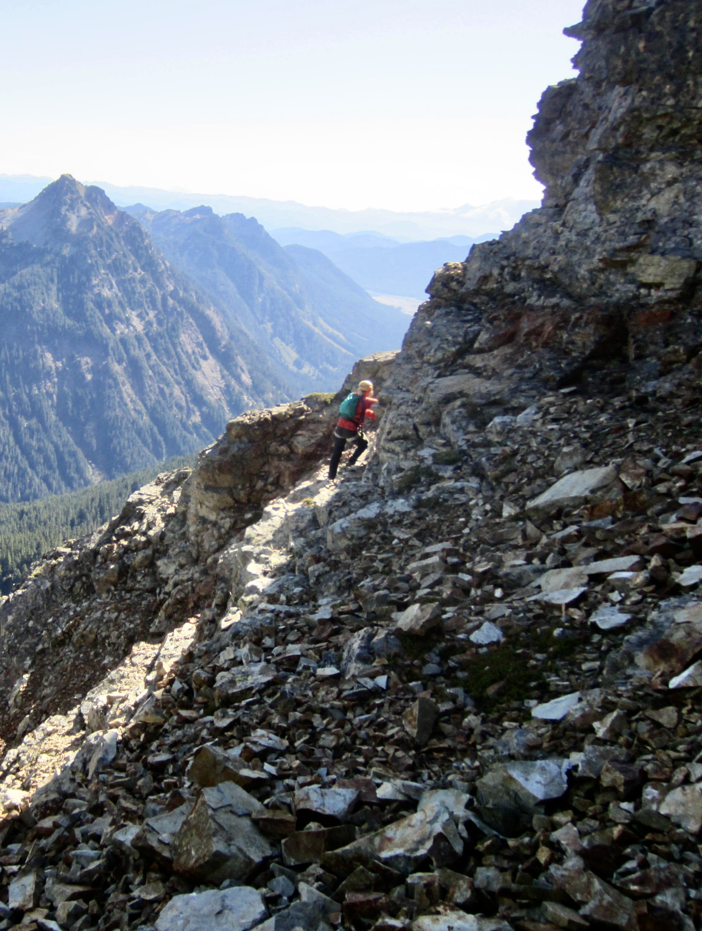 Eileen Traversing Crumbly Ledge On Huckleberry Mtn