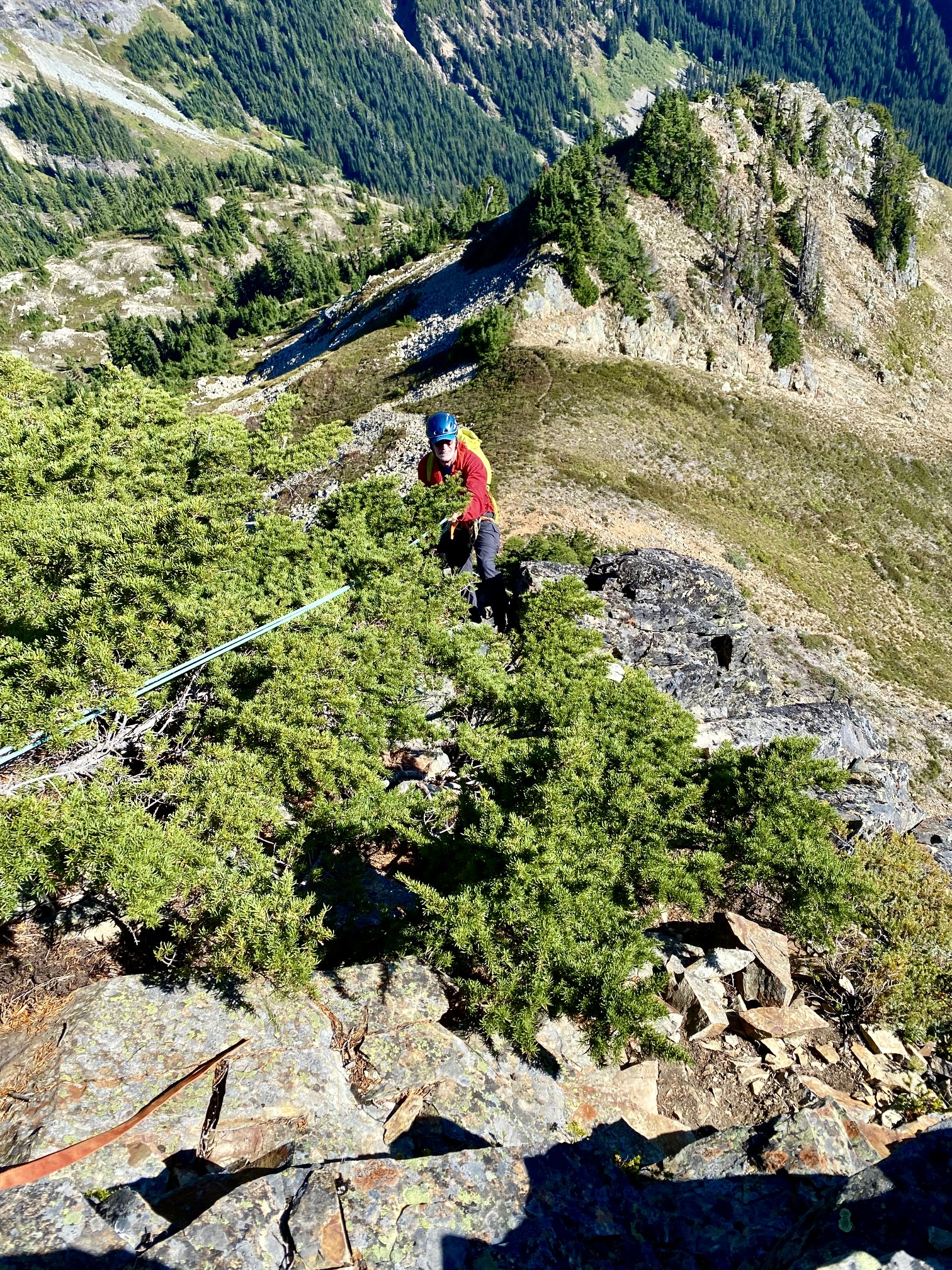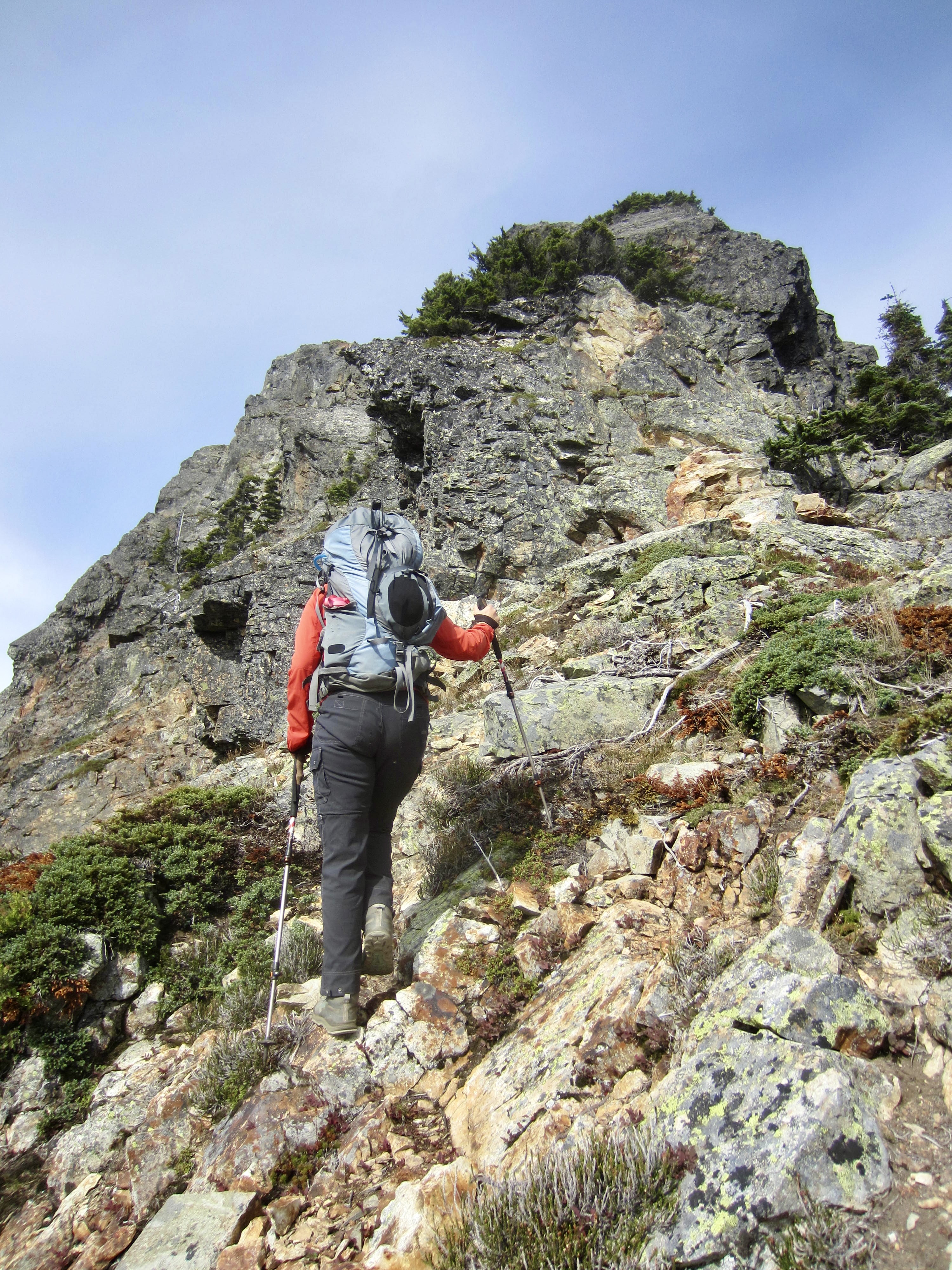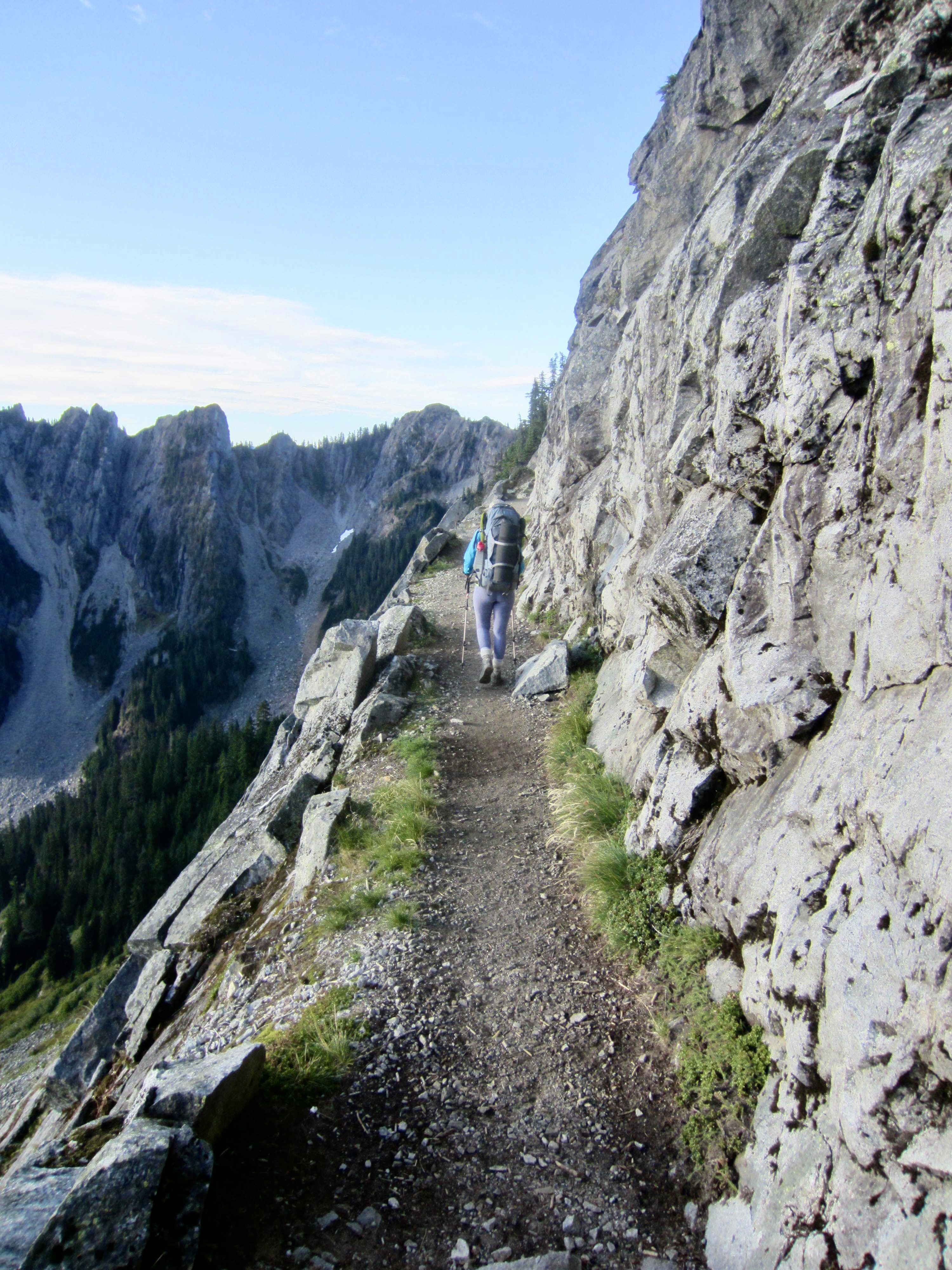 Eileen Traversing Crumbly Ledge On Huckleberry Mtn