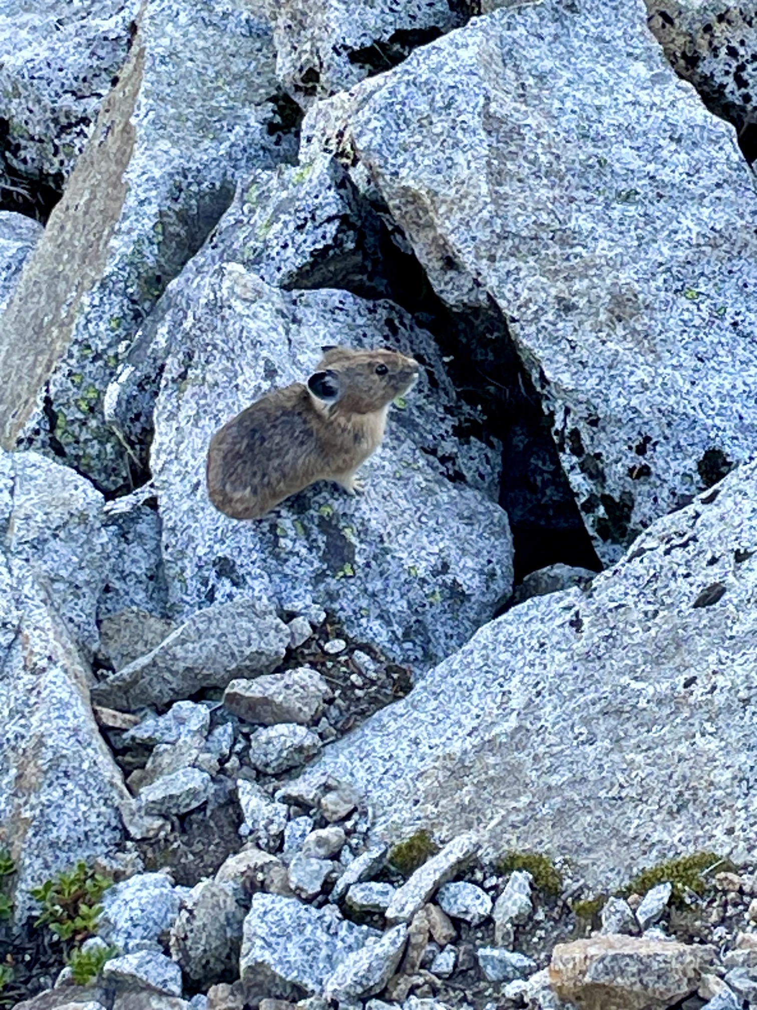 Eileen and I used a 40-meter scramble rope on our climb. This length was adequate for running belays along the east ridge and for a fixed-belay pitch up the east face of the summit block. However, it was not long enough for making one full rappel off the summit; we came up about 5 to 10 meters short of reaching the east notch. As such, we needed to down-climb the final Class 3 portion. A 50-meter rope would come close to reaching the notch, and a 60-meter rope would easily reach the notch.