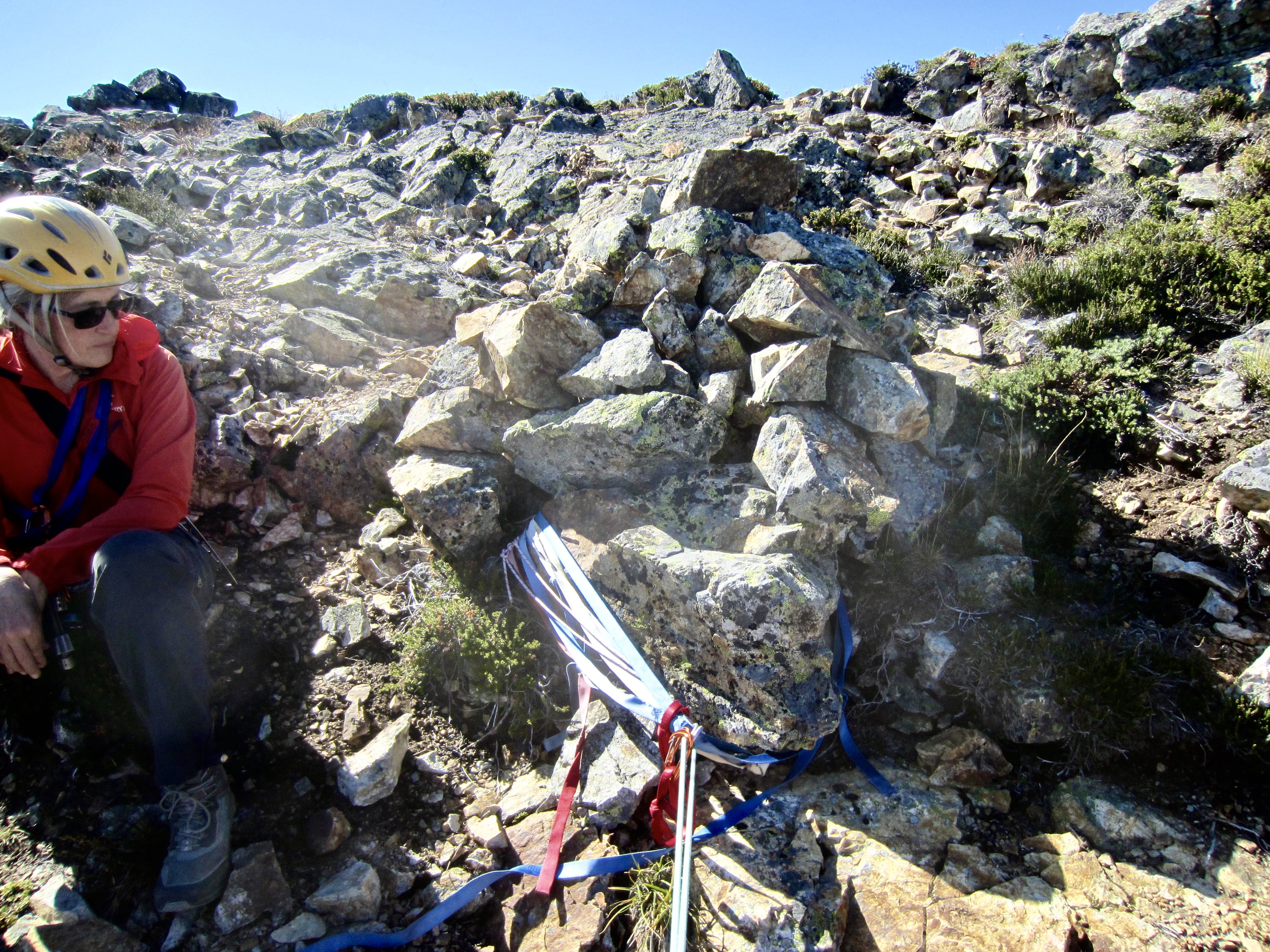 From the deep notch, we retraced our traverse route around the rock rib, then descended the east ridge by a combination of scrambling and rappelling. We reached our backpack stash at the base of the buttress in mid-afternoon (1.3 hours from summit).