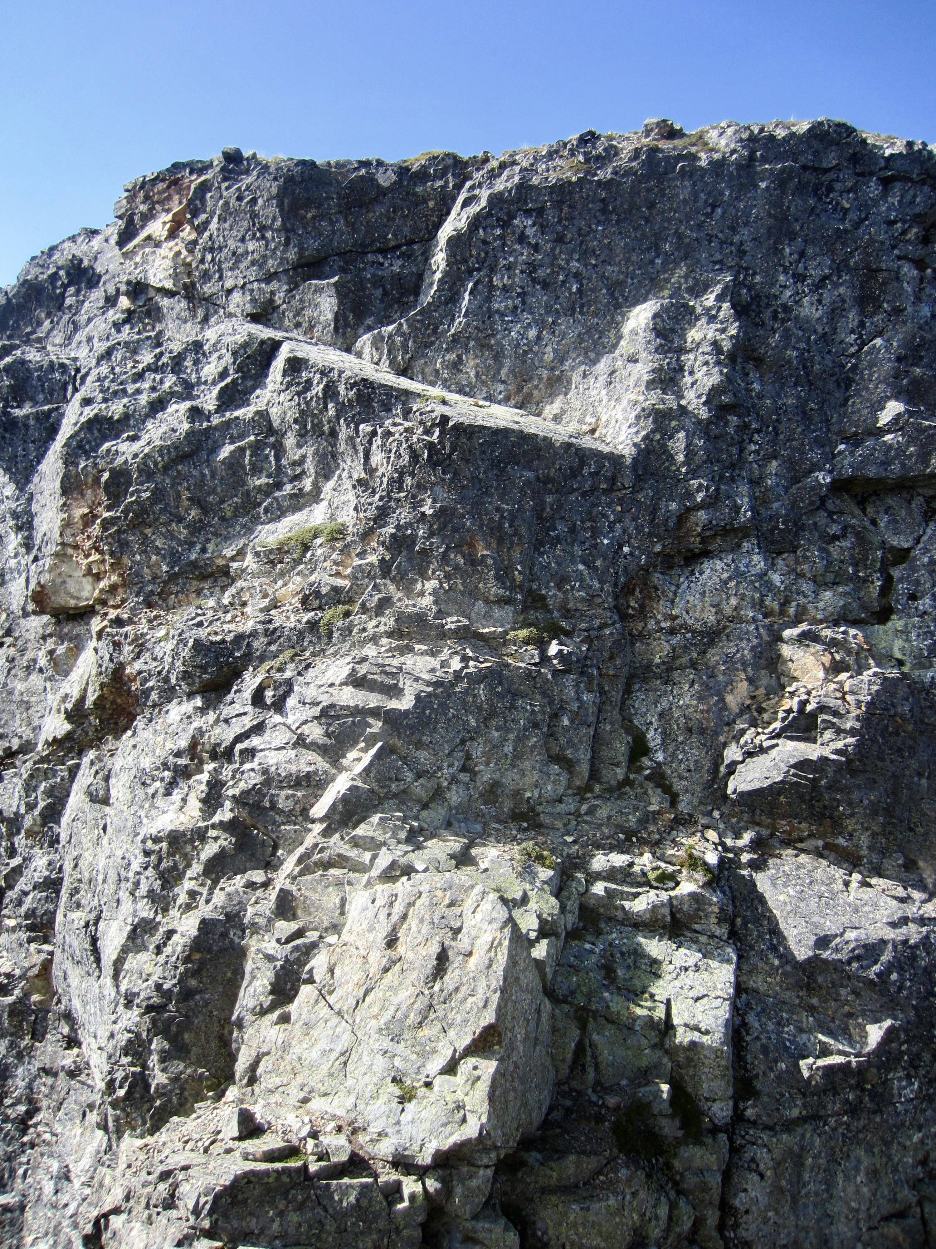 The ridge crest eventually became more jagged, with a series of sharp horns and small notches, so we dropped off to the left (south) side and contoured over to a blocky headwall. This headwall is created by a transverse rock rib that runs perpendicular to the east ridge. Not knowing the best route ahead, we both scrambled up the headwall on broken Class 2-3 rock.