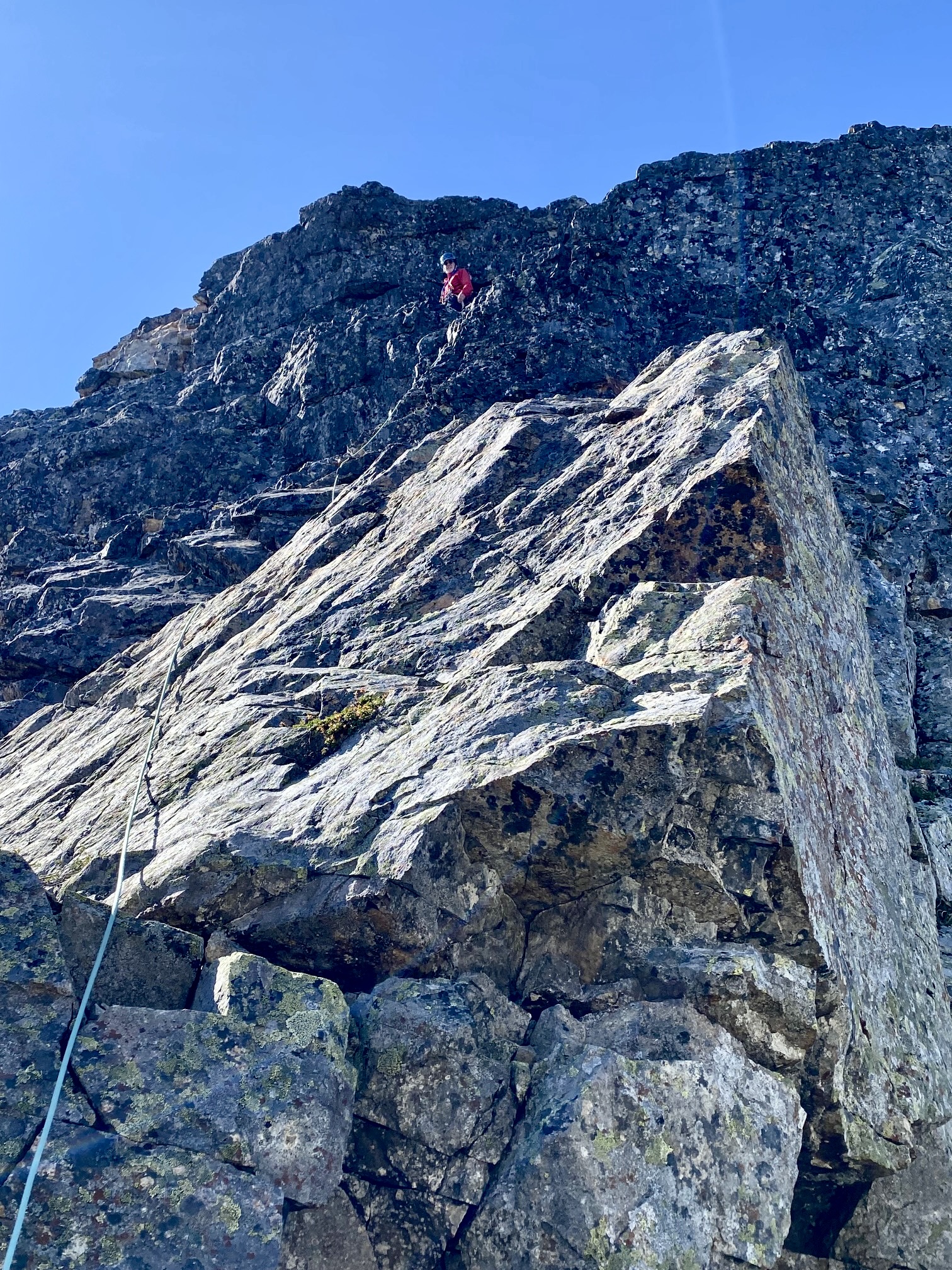 At the base of the buttress, we stashed packs and roped up. Eileen took the first lead, going up the right-hand edge with a running belay while placing a few chocks and slinging a few horns. We swapped leads for what was probably equivalent to a half-dozen belayed pitches using our 40-meter scramble rope. The rock was nicely solid, and the scrambling was quite enjoyable–ranging from Class 4 in the lower portion to Class 2-3 in the upper portion.