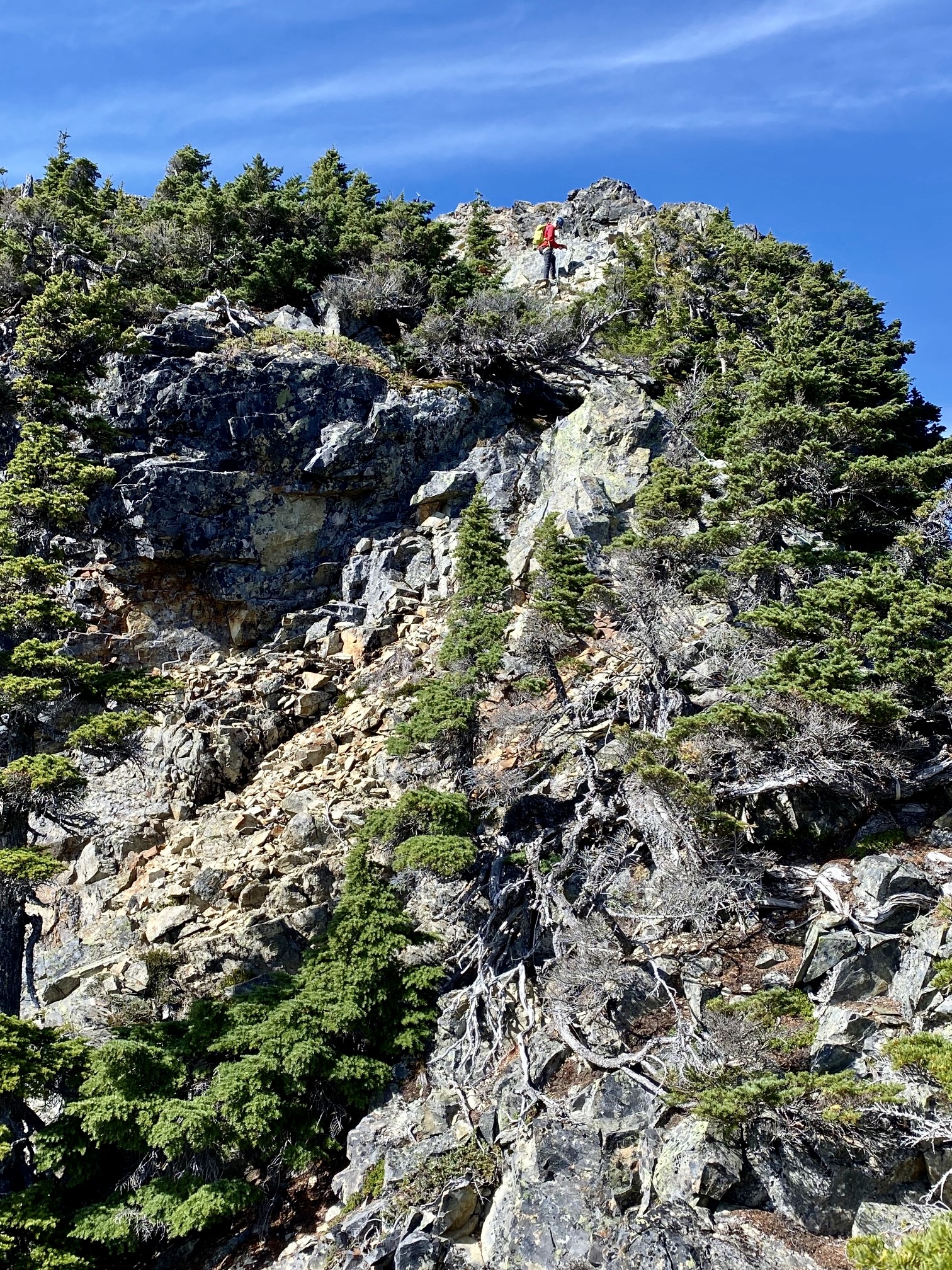 Because we underestimated the difficulty encountered on this route, Eileen and I each did the entire ascent in our hiking boots. We definitely would have felt more comfortable climbing the summit block in better footwear, such as a technical approach shoe. However, neither of us felt that a true rock shoe was necessary.
