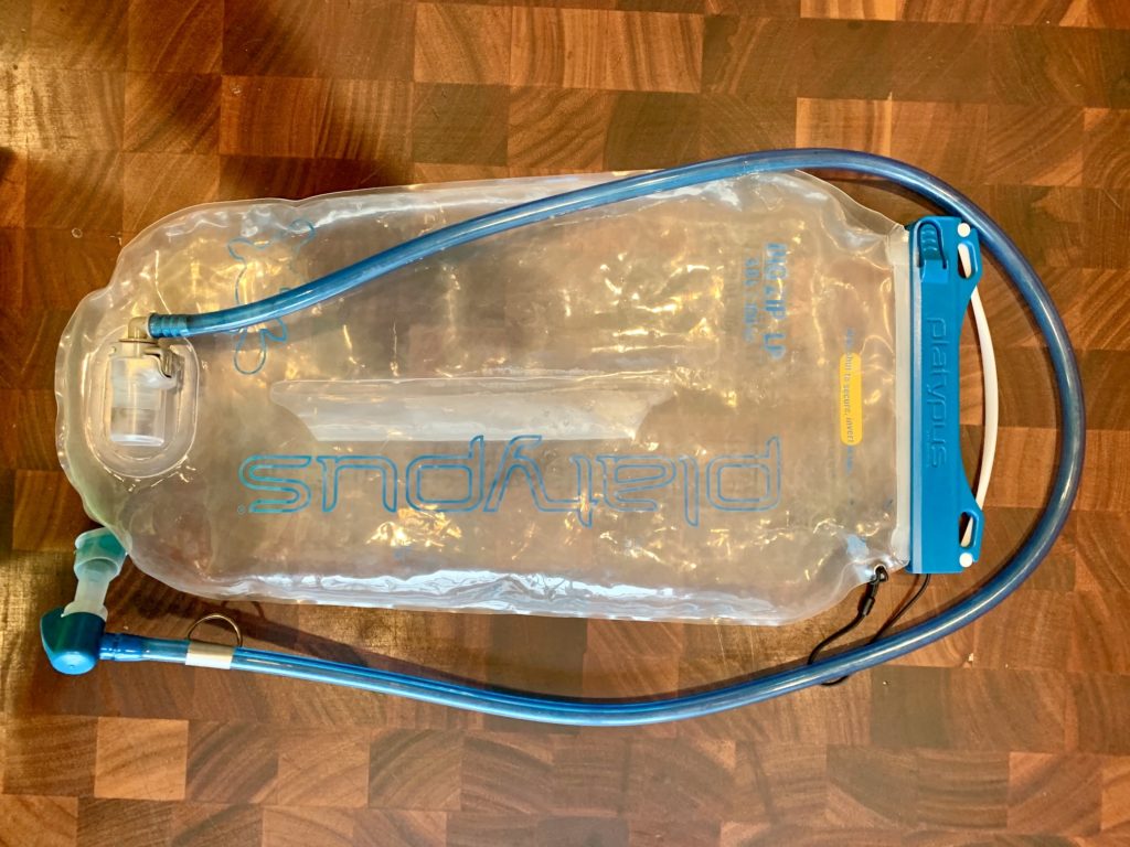 A notable benefit of the Platypus bladder design is that the clear plastic provides a good view of the interior, so I know right away when a cleaning is needed. This was always a problem with the dark-blue plastic used for Camelbak bladders. In addition, the Platypus plastic seems to be more resistant to mold growth than the Camelbak plastic, although more time is needed to fully assess this. One small negative aspect of the Platypus bladder is that the plastic has a tacky surface, which makes the bladder more difficult to slide into tight hydration pockets of rucksacks and backpacks. However, I mitigated this issue by making a simple nylon slip-sleeve. How to make a slip-sleeve for a hydration bladder.