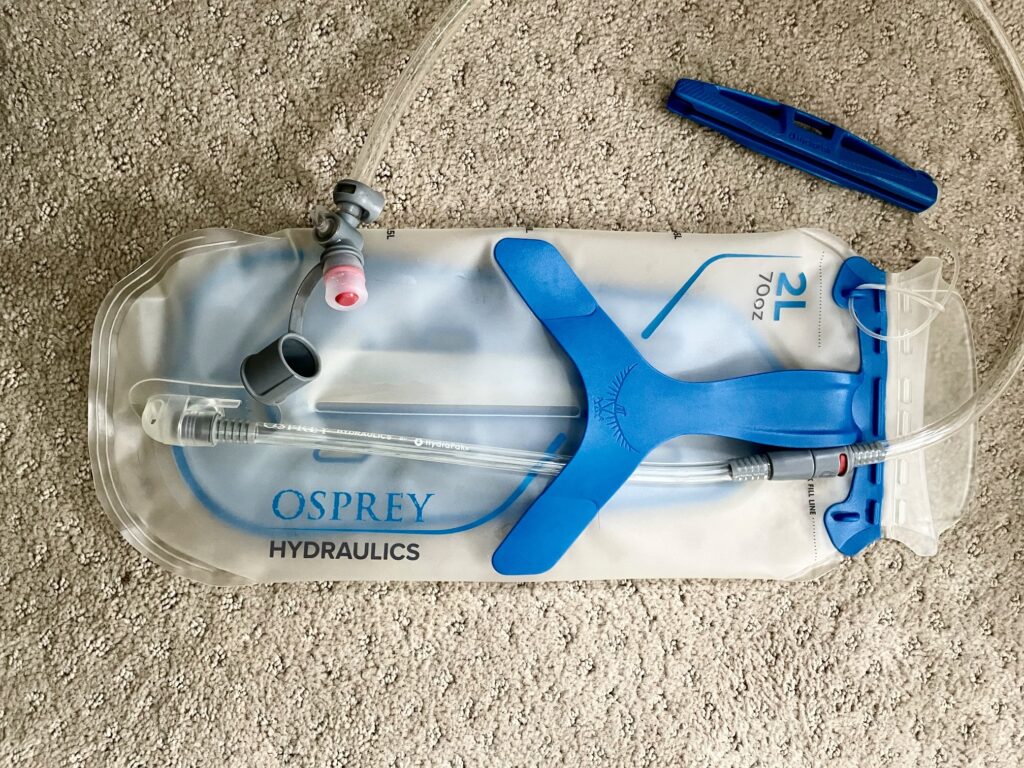 The Osprey Hydraulics system is manufactured by HydraPak, a company that has become fairly well known for its various sizes of lightweight, collapsible water jugs. The plastic used for Osprey’s bladder seems to be the same plastic used for HydraPak jugs. I would describe the plastic as relatively thin, subtly textured, and very pliable. Frankly, it doesn’t inspire me with a lot of confidence for use as a hydration bladder, but time and usage will ultimately tell how durable the whole system is. Stay tuned for future updates.
